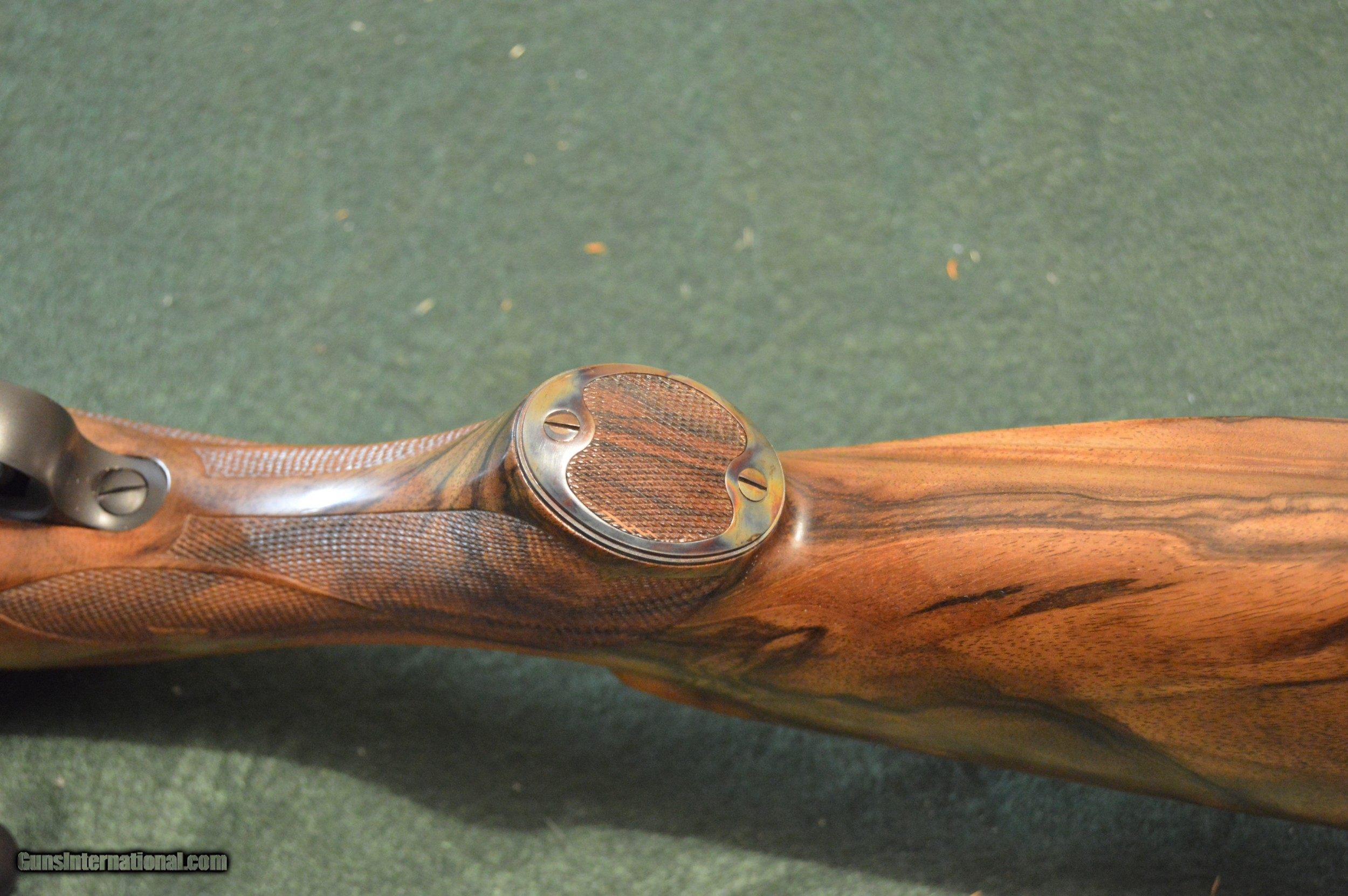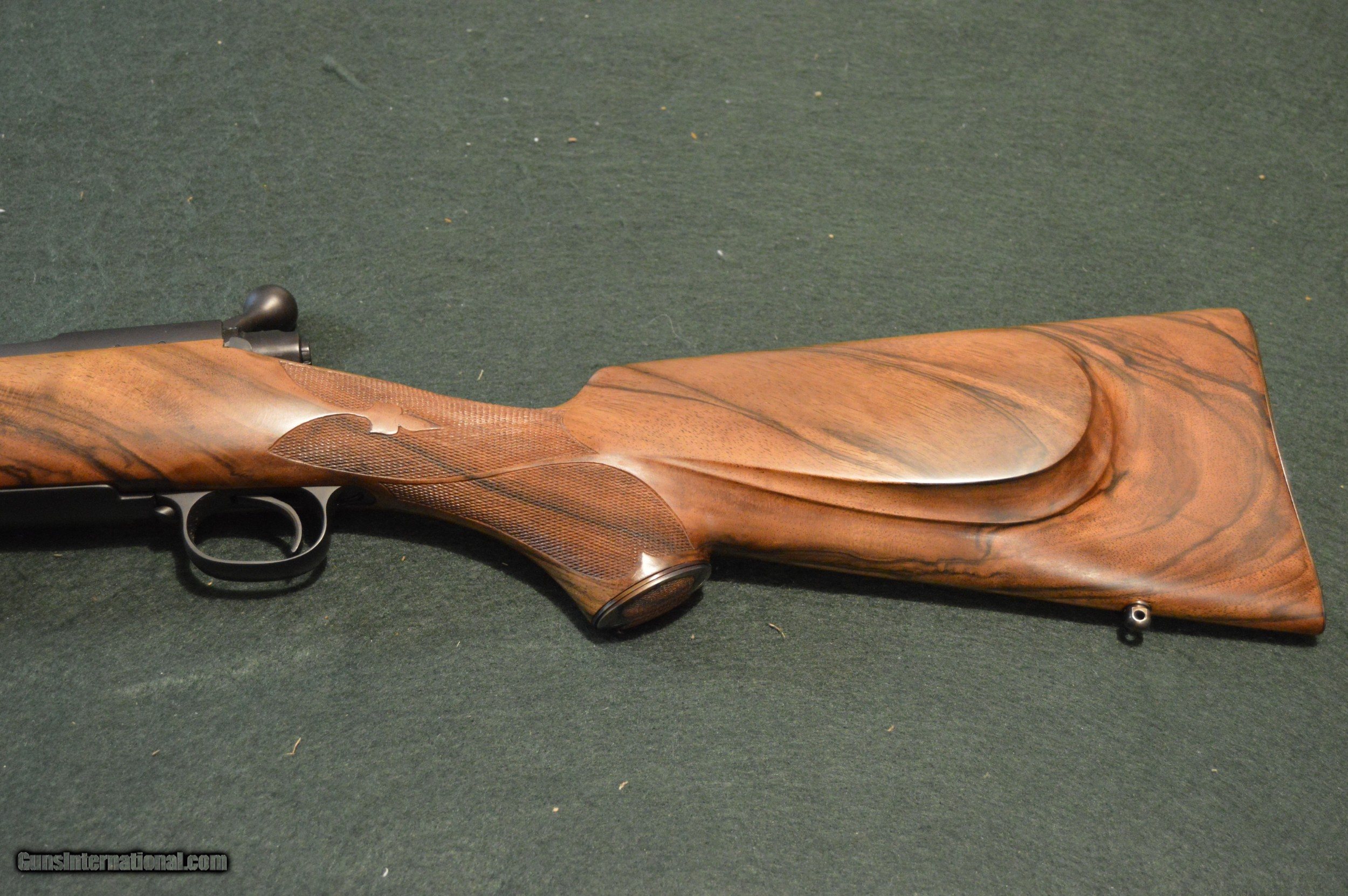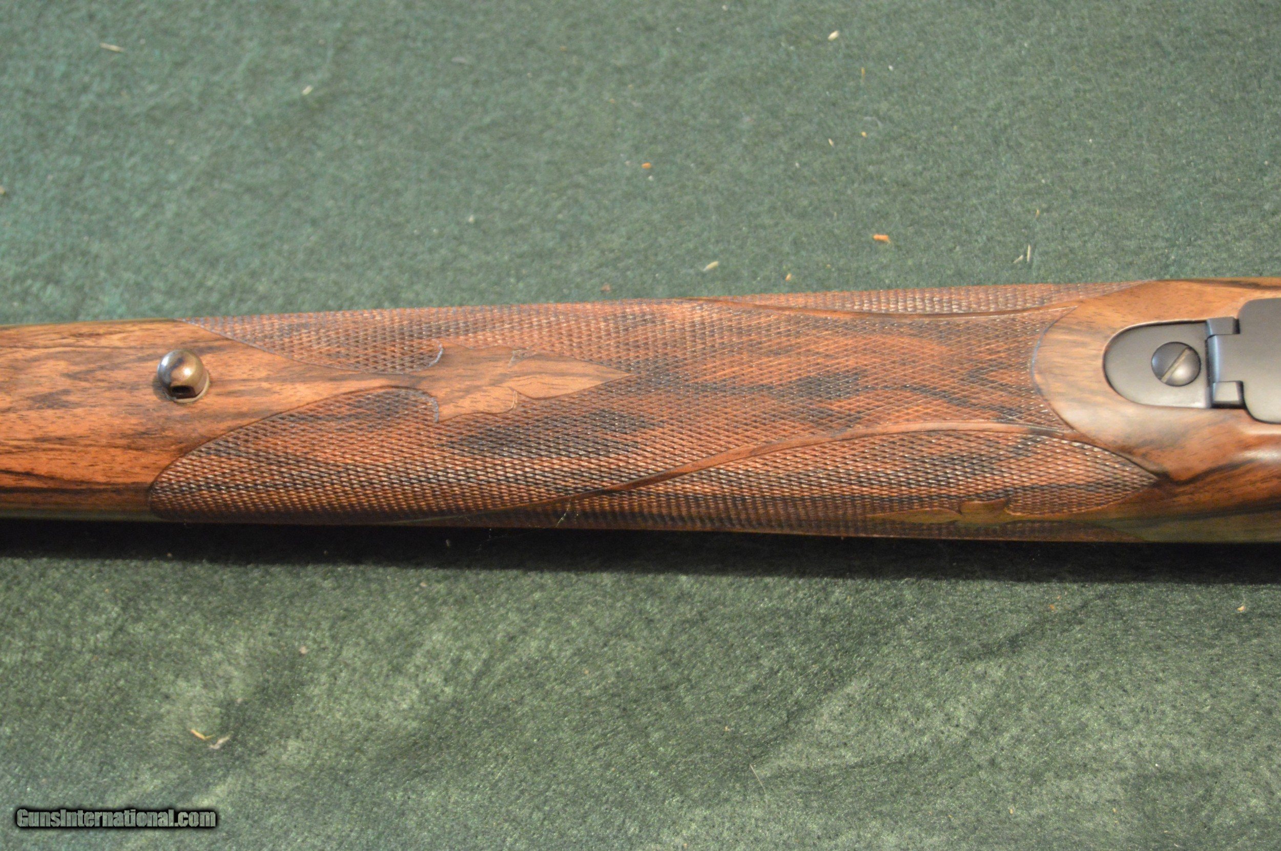 Description: This Model 70 was stocked by the late ACGG Professional Kent Bowerly. It features Kent favorite Winchester M70 action in this case fitted with a 26" Pac Nor barrel chambered to the .220 Swift cartridge. In typical Bowerly fashion it is framed in a XXXX exhibition English walnut stock with Kent's extensive and precise checkering. Of special mention is the color case hardened skeleton grip cap with more of Kent's perfect checkering. The rifle remains in nearly new condition since it has had but one owner ... so far. SOLD Rifle Caliber: .220 Swift Manufacturer: Winchester Model: M70 Serial Number: 470361 Condition: 98% Metal Condition: 100% Wood Condition: 98% Bore Condition: 100% Stock: California English walnut Fore End: ebony Butt Pad: Biesen checkered steel Finish: hand-rubbed oil Weight: 9 lb. |