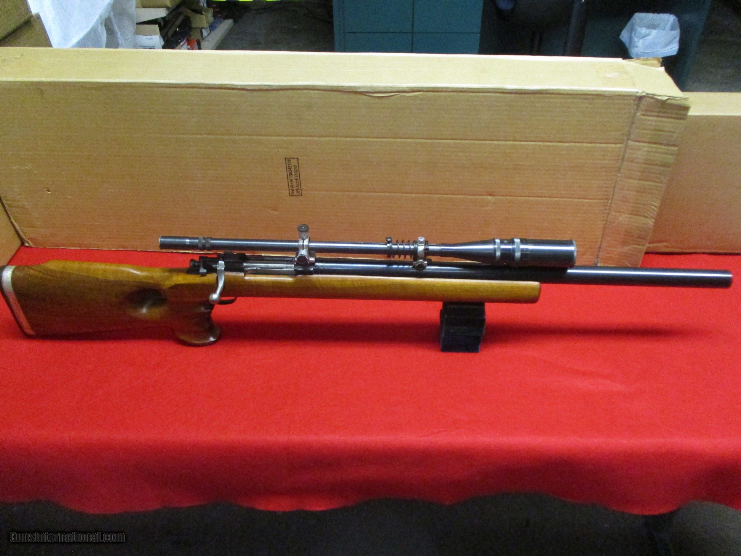 Description: This is very nice custom bench rest rifle, based on the famous M1903A3 action. According to remingtonsociety, the original rifle left the Remington factory in October of 1943. Postwar, the rifle was sold onto the civilian market and was later taken to a local, well-known gunsmith by the name of Carl Stover located in Soddy Daisy, Tennessee. He customized it, replacing the original barrel with a massive 26.5-inch long, 1.25-inch thick heavy target barrel. The receiver was re-blued to match the barrel. A Mark II safety replaced the original factory safety. A heavy-duty thumbhole stock was added. This features a very thick pistol grip with finger grooves. A classic Unertl 1.5-inch target scope has been installed. Magnification is 20x. Included are a pair of screw in scope covers. A Timney-style trigger has been installed, resulting in the rifle having a very light trigger pull. It gives the impression the pull weight could be measured in ounces rather than pounds. There is some slight micro-pitting towards the front end of the barrel. These are also present towards the front of the scope. A few light scratch marks are present on the right side of the barrel underneath the front of the scope. Bluing is still present, however. Other, than some slight dings in the right side, the stock is in extremely good condition. The bore is in exceptional condition – very bright with no rust or pitting. This rifle would make a perfect bench rest rifle. SOLD Manufacturer: Carl Stover (custom gunsmith); Remington Arms Co. (Original Military Configuration) Model: M1903A3 Custom Bench Rest Rifle Serial Number: 4026263 Caliber Info: .22-250 Remington Condition: Used - Excellent Barrels: 26.5 inches (673mm) Barrel Type: Heavy Barrel; 1.25 inch (31.75mm) diameter Action: Bolt Action, Single Shot Conversion Triggers: Timney Type Stock: Thumb hole; bench rest type Fore End: Wide-Body for Large diameter barrel Butt Pad: Removable LOP: 13.5 inches (343mm) Finish: Blued Sights: No Iron Sights; Unertl 20x 1.5-inch target scope |