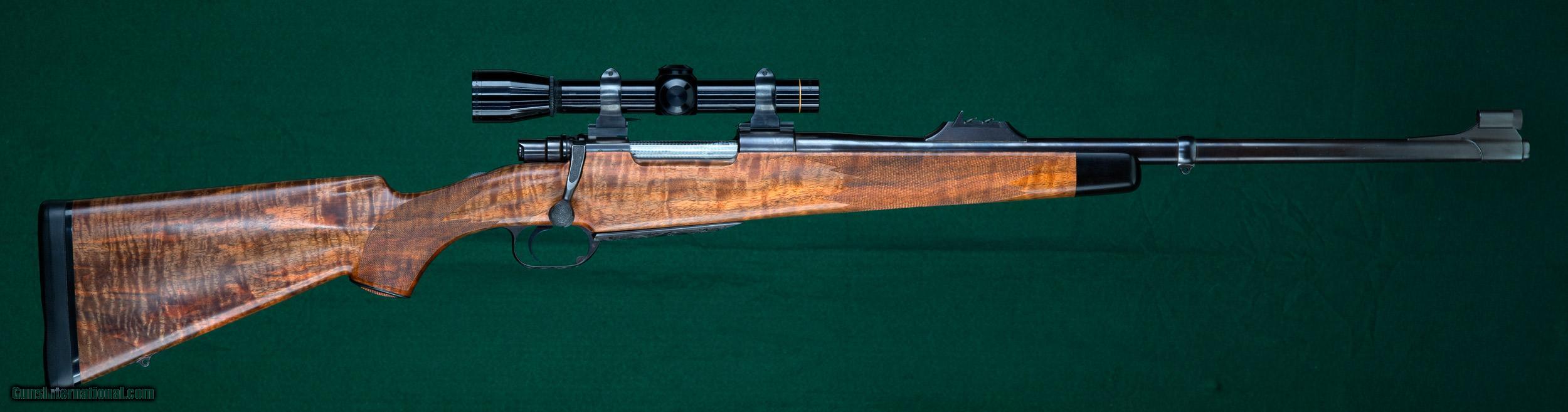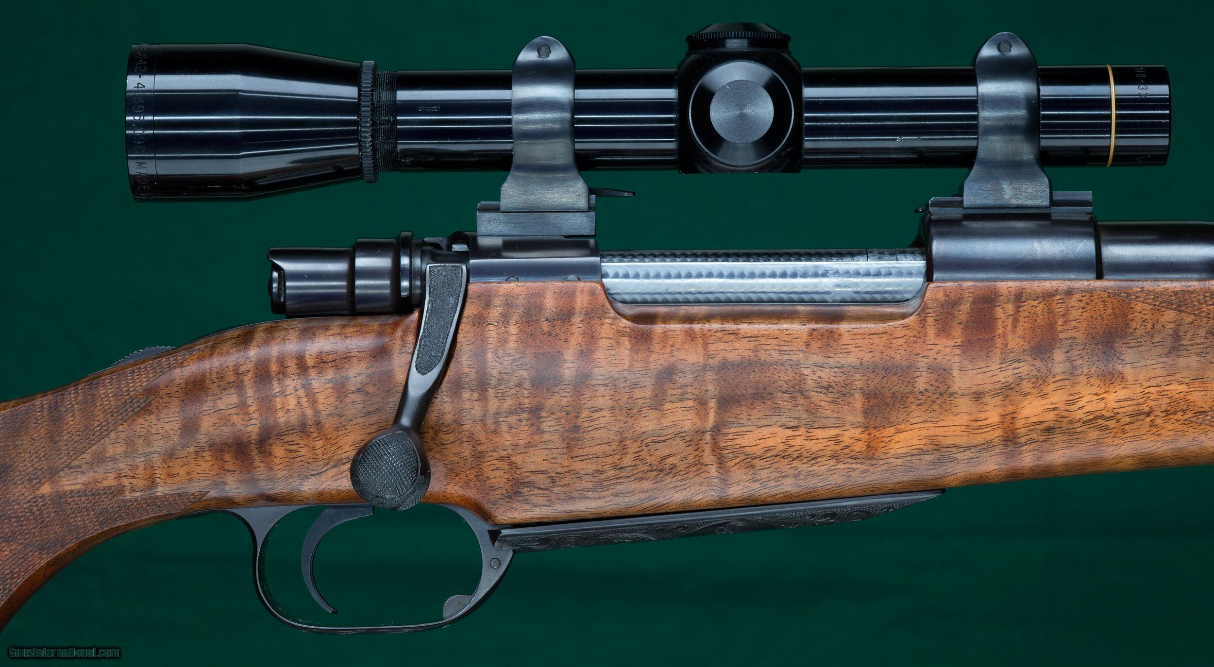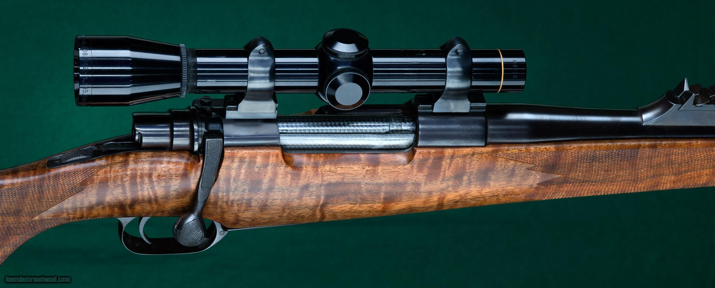 Description: 22" tapered round, lugged barrel with hooded ramp front sight and flip-up twilight bead, full-band swivel base, 1 standing and 2 folding island-mounted express sights marked for 100, 200 & 300 yards. Stocked with fully-figured Bastogne Walnut, including ebony forend tip, classic borderless point-pattern checkering (wrapping fully under the forend), barrel tie-down, discreet glassbedding, steel skeleton pistol grip cap (checkered within), beaded cheekpiece, inletted rear swivel stud and black Decelerator recoil pad. Mauser 98 action with jeweled bolt and follower, 3-panel checkered bolt knob, custom top tang safety, Canjar trigger, and hinged straddle floorplate with release inside triggerguard. Floral scroll engraved bottom metal and with cape buffalo head on floorplate. Leupold M8-3x scope on Kimber quick-detachable mounts. Weight: 9lbs, 6oz. Pull: 14 1/4". Built 1980 for Fred Barnes in conjunction with his development of the cartridge---.458 Winchester, necked down to .404 calibre. Described in both Ackley & Donnelly. With custom RCBS dies, plenty of brass and (Barnes, of course) bullets. 99% blue and excellent bore. SOLD |