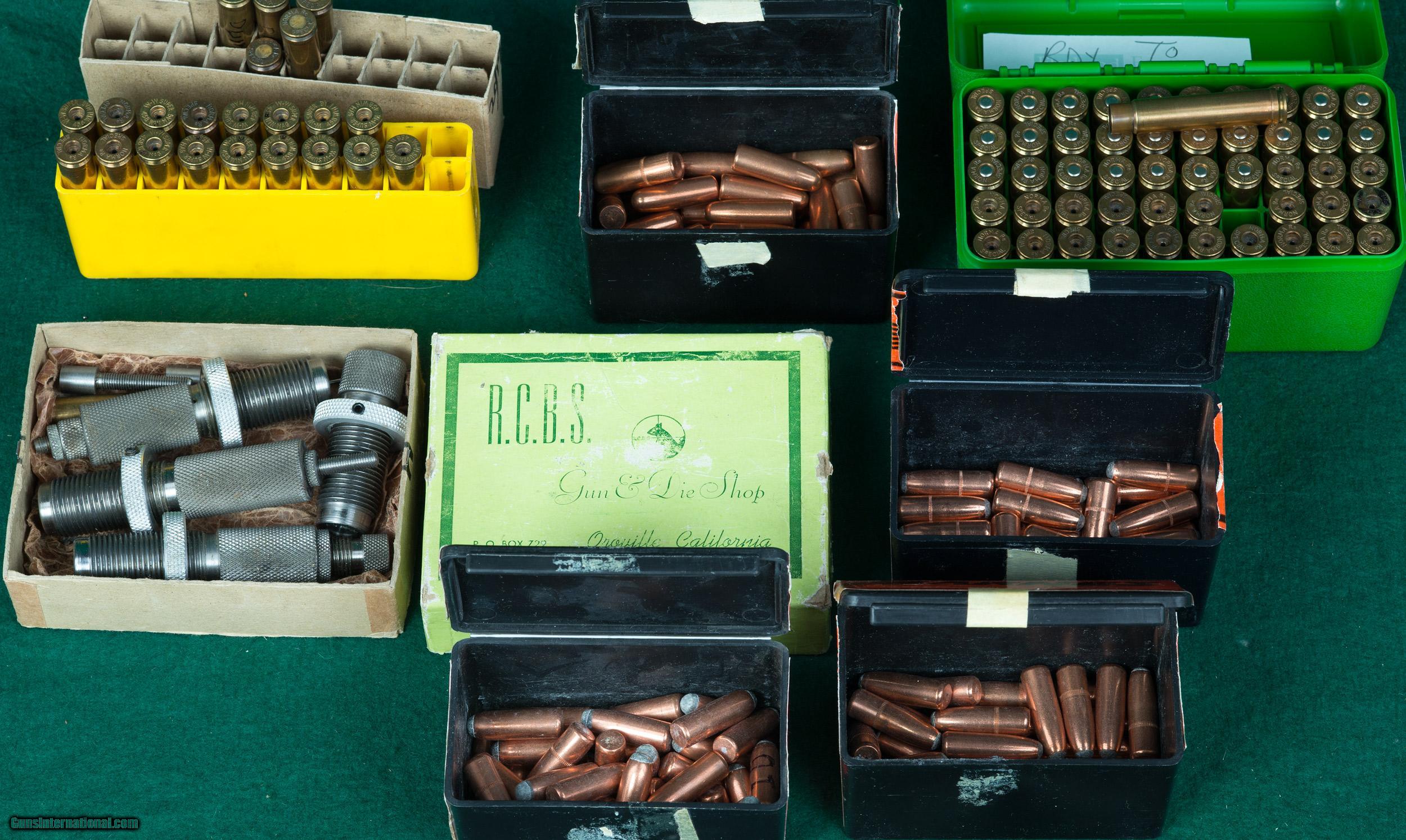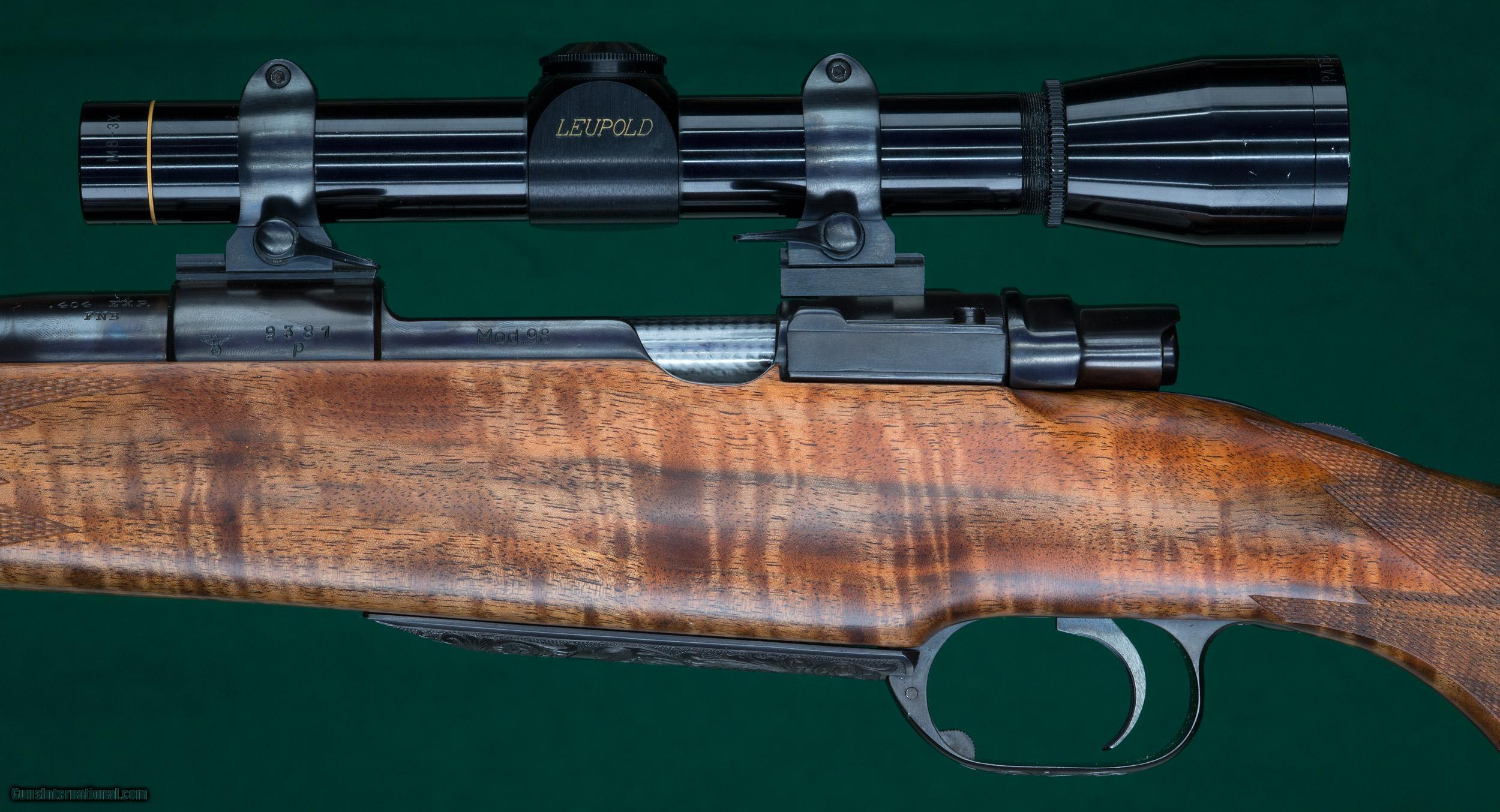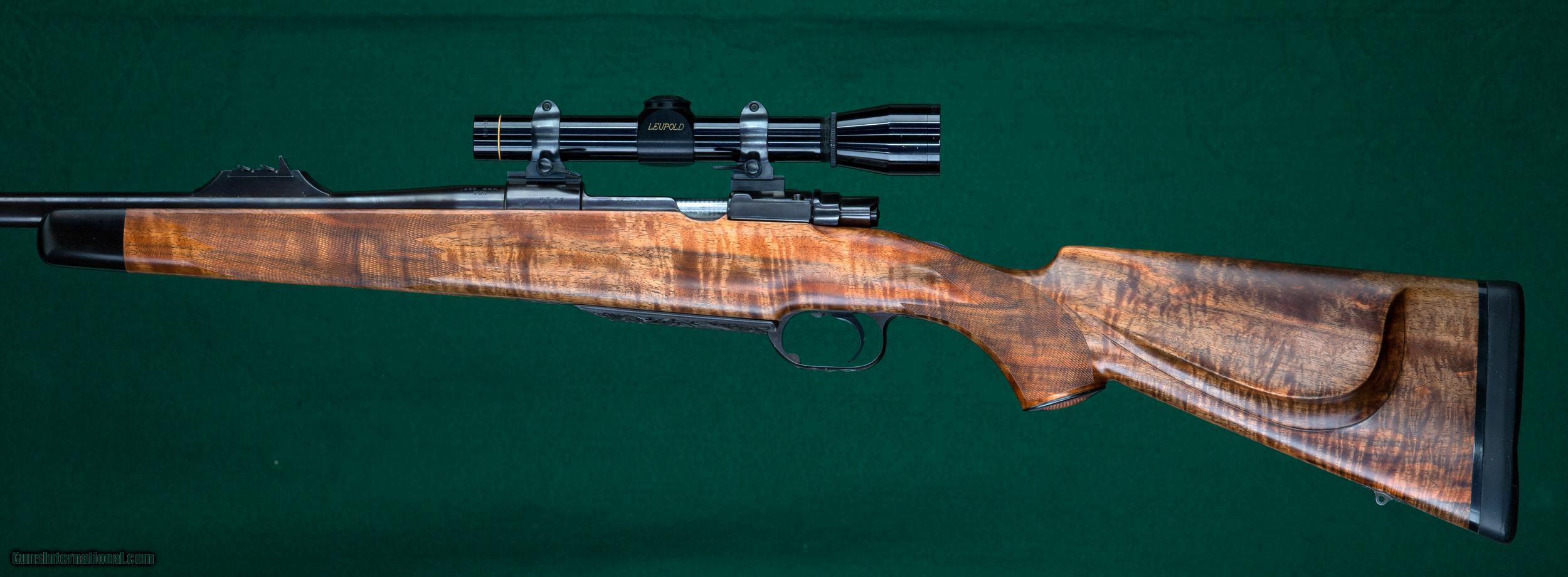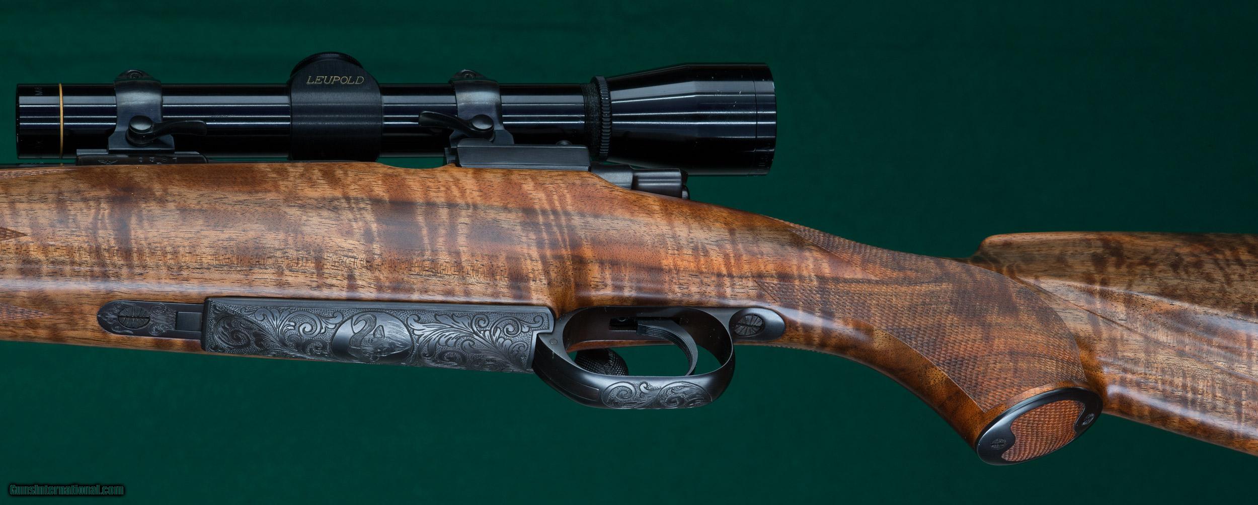 Description: 22" tapered round, lugged barrel with hooded ramp front sight and flip-up twilight bead, full-band swivel base, 1 standing and 2 folding island-mounted express sights marked for 100, 200 & 300 yards. Stocked with fully-figured Bastogne Walnut, including ebony forend tip, classic borderless point-pattern checkering (wrapping fully under the forend), barrel tie-down, discreet glassbedding, steel skeleton pistol grip cap (checkered within), beaded cheekpiece, inletted rear swivel stud and black Decelerator recoil pad. Mauser 98 action with jeweled bolt and follower, 3-panel checkered bolt knob, custom top tang safety, Canjar trigger, and hinged straddle floorplate with release inside triggerguard. Floral scroll engraved bottom metal and with cape buffalo head on floorplate. Leupold M8-3x scope on Kimber quick-detachable mounts. Weight: 9lbs, 6oz. Pull: 14 1/4". Built 1980 for Fred Barnes in conjunction with his development of the cartridge---.458 Winchester, necked down to .404 calibre. Described in both Ackley & Donnelly. With custom RCBS dies, plenty of brass and (Barnes, of course) bullets. 99% blue and excellent bore. SOLD |