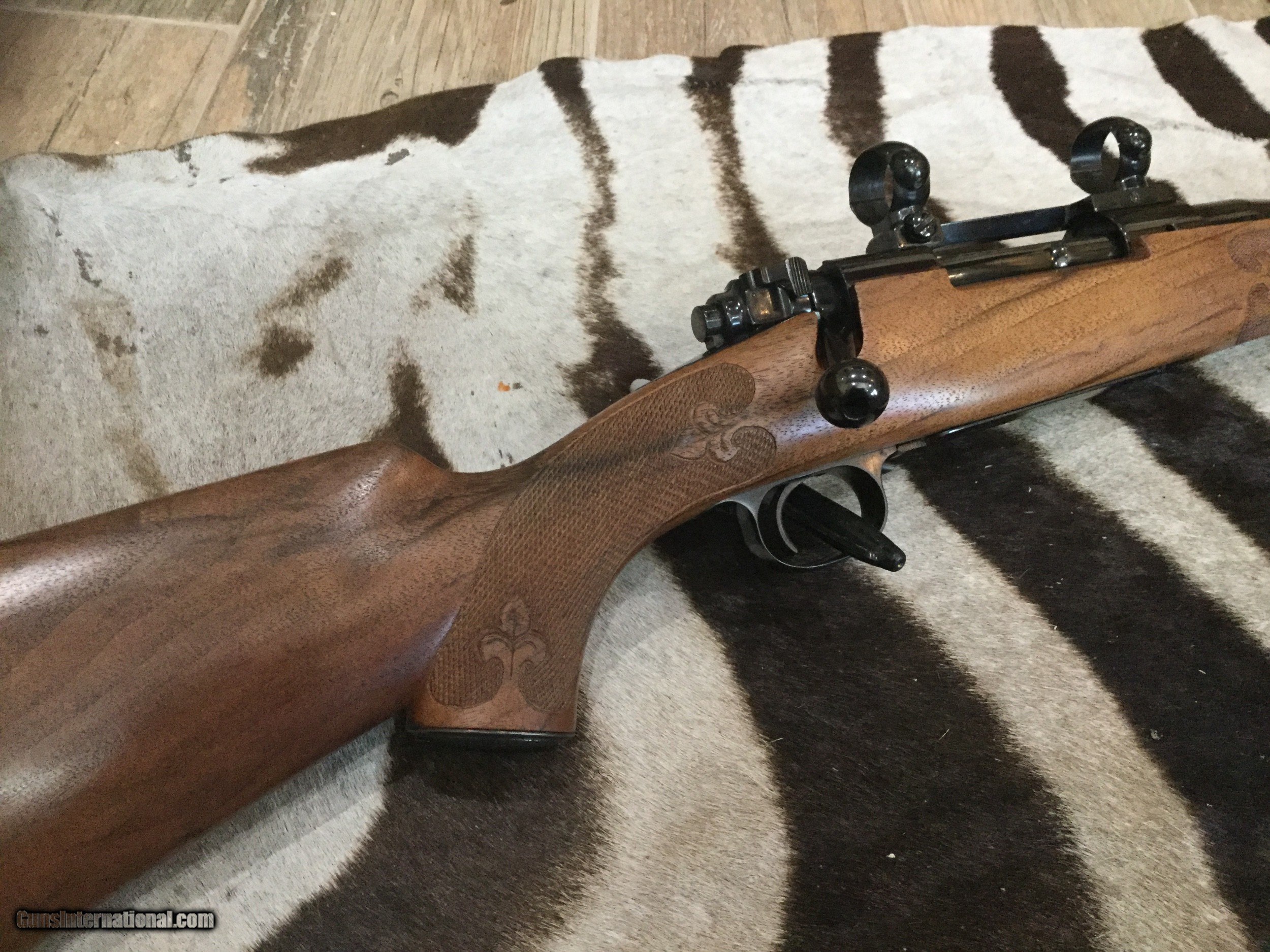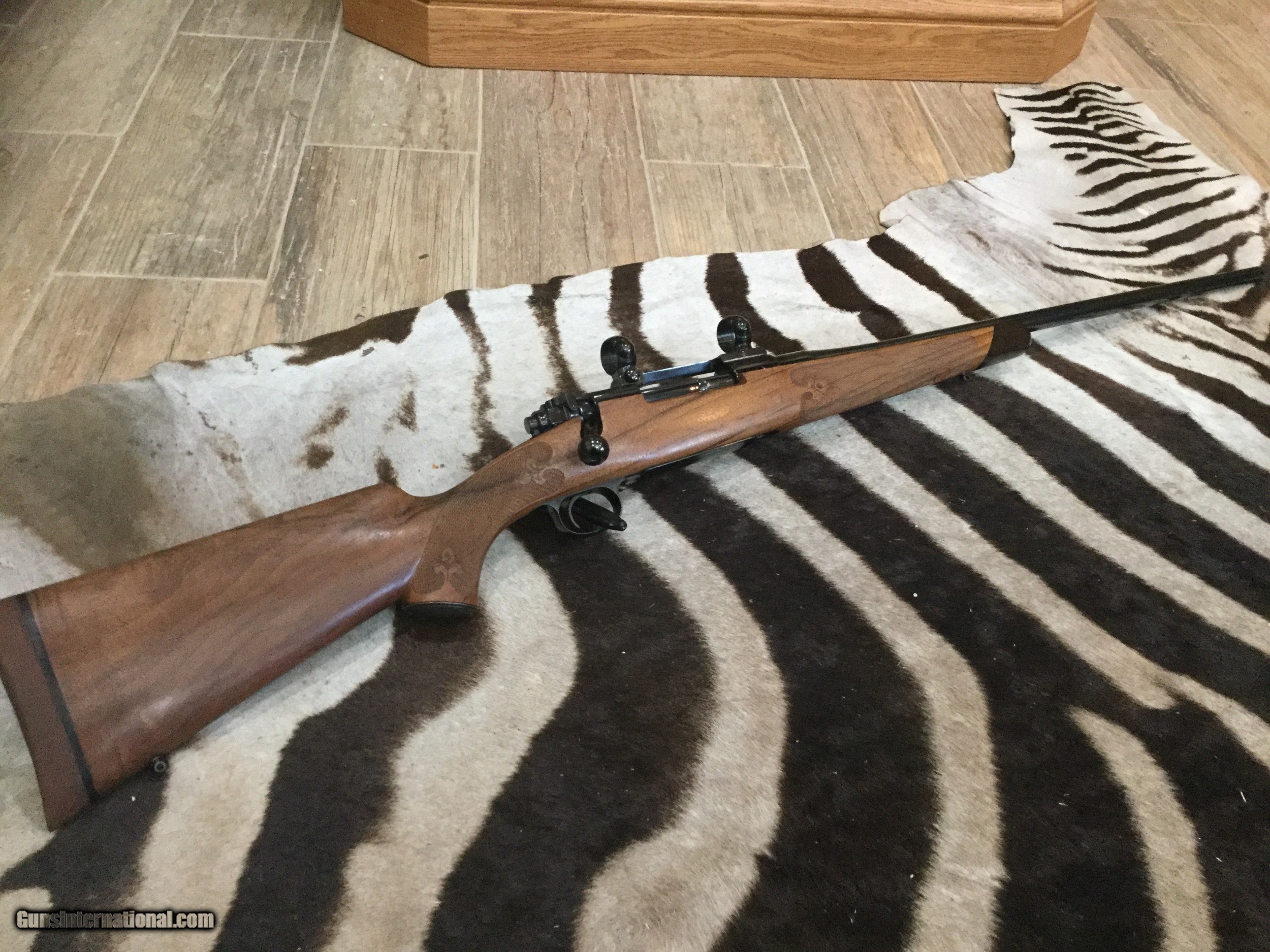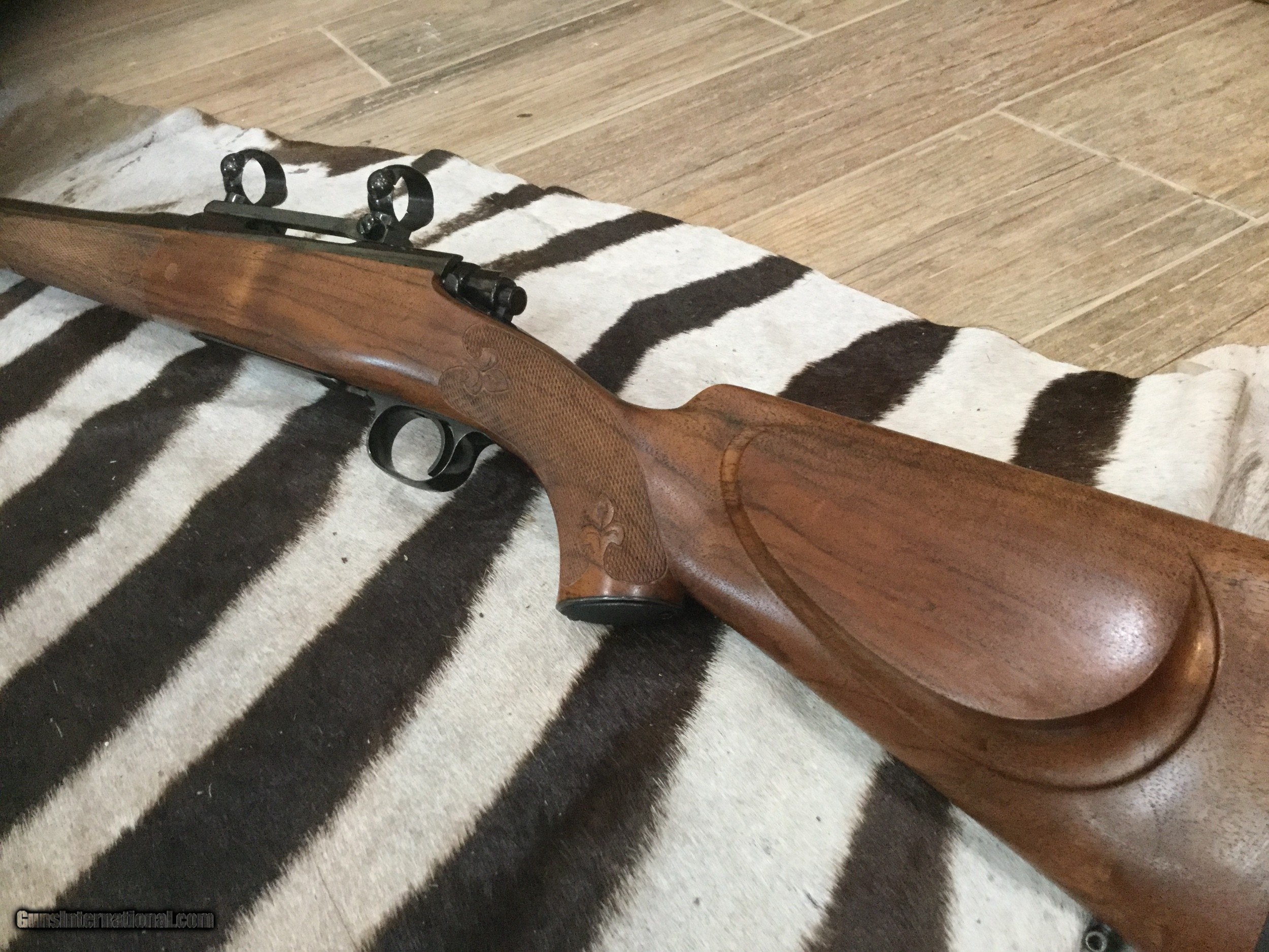 Description: Custom rifle in 30-06 built on a 1953 Winchester model 70 action. French Bastogne stock with fleur delis 25 line per inch checkering, fantastic deep bluing on the metal, JR Douglas custom medium contour 24" barrel, checkered steel grip cap. This rifle came with a collection and it's #1 of a pair and marked as such next to the serial number (I sold #2 in 257 Roberts) wood and metal are 100% with no sign of ever being fired. It comes with Redfield base and rings. Amazing quality and details , no information on the maker. SOLD SOLD Rifle Caliber: .30-06 Springfield Manufacturer: Custom Model: Winchester model 70 pre 64 Barrel Length: 24” Caliber Info: 30-06 Condition: 100% Metal Condition: 100% Wood Condition: 100% Bore Condition: 100% Barrels: JR Douglas Barrel Type: Medium Contour Action: Bolt control round feed Triggers: 3 pounds Stock Cast: Right hand Fore End: Ebony LOP: 13-1/5” Finish: Blue Weight: 7 pounds 6 ounces Extras: Redfield base and rings Case: No Item Location: Texas Proof:Nitro: Yes |