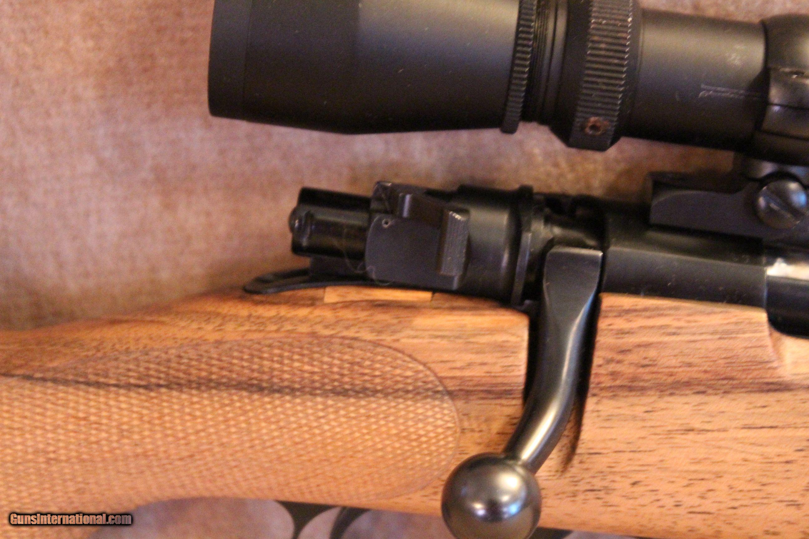 Description: Custom Mauser Rifle in 257 Roberts Commercial Mauser action with custom 24” sightless barrel (maker unknown) chambered in the classic 257 Roberts. Action features Dakota bolt shroud with M70 Winchester type 3 position safety, jeweled bolt and follower, hinged floorplate with release inside trigger guard, fully adjustable trigger, and blind rear tang screw. Caliber engraved on barrel hub. Matt bluing by Bedeaux Gun Shop of Albuquerque who did much of legendary Dale Goens’ metal work. Stock appears to be Myrtlewood. Monte Carlo style buttstock with double shadow cheekpiece, streamline Ebony forend tip, 13 1/2” LOP over a .6” Pachmayr Olde English black pad. Sling eyes on stock. Checkered steel pistol grip cap. Ebony insert framing the ejector box. Fill in checkering that harmonizes well with stock lines, wrapping around the forearm with ribbons. Hand rubbed linseed oil finish. Leupold 3-9x40 variable matte finish scope in Redfield rings with one piece Redfield base. Base and rings blued with other metal so all matching finish. Test fired only, in as new condition. More photos available on request. Thanks for looking! SOLD |
