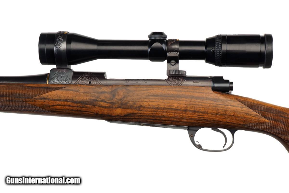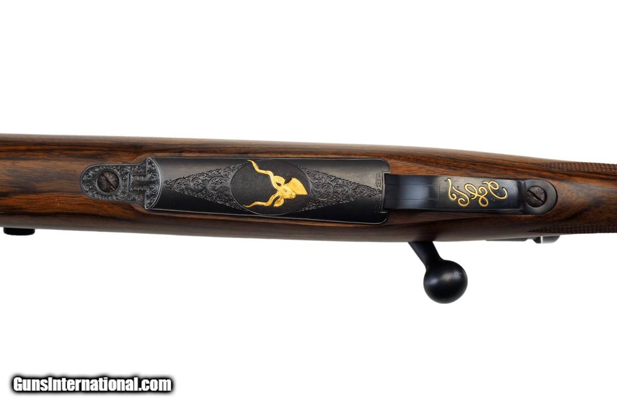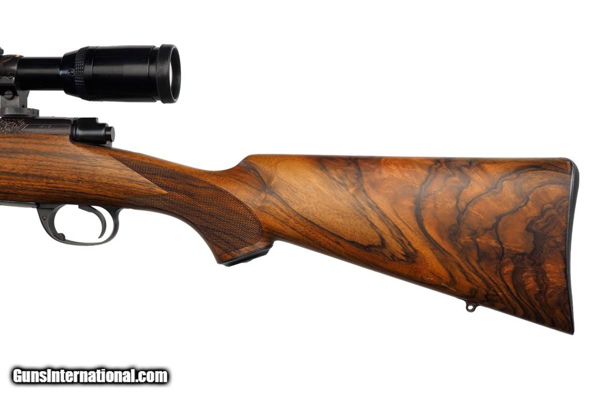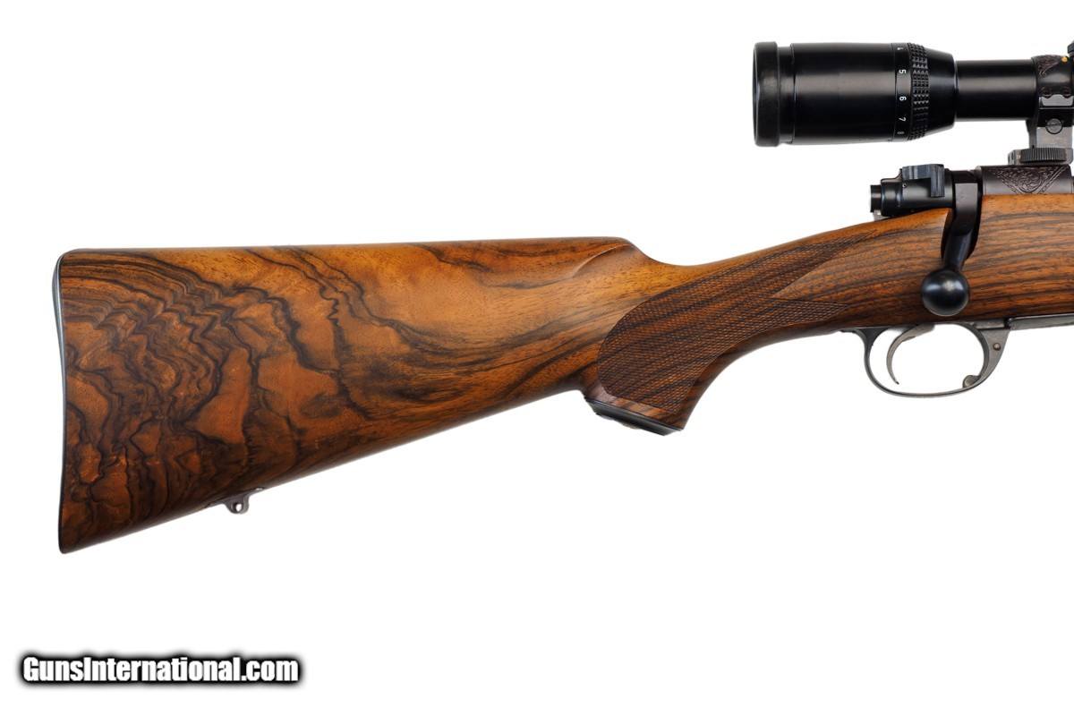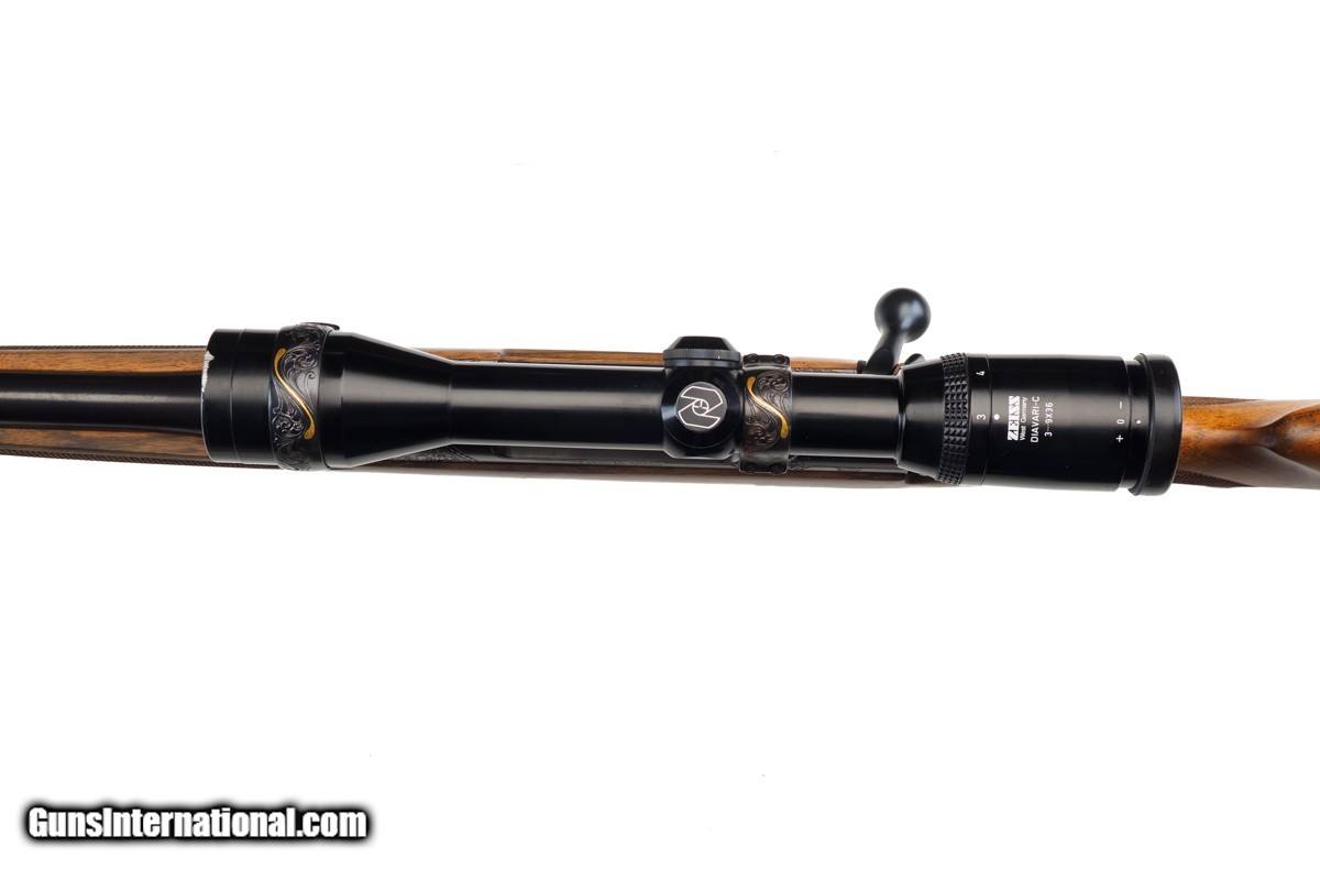 Description: 23" BARREL, ZEISS DIAVARI C 3-9x36 MC SCOPE, CUSTOM RINGS AND BASES, PISTOL HAND GRIP, ENGRAVED GRIP CAP, 13-3/4" LOP, BUTTPLATE, 8 LBS 14 OZ WITH SCOPE Custom bolt action rifle chambered for the .270 Winchester cartridge engraved by Mike Dubber. The 23" blued round steel barrel is adorned with a gold line near the receiver. The left side of barrel is engraved ".270 Win". The receiver and straddle floorplate are adorned with scrolls while the floorplate also has a gold-inlaid portrait of an antelope. The floorplate is signed "MWD 1990". The trigger guard bow is gold-inlaid in script "TLC" protecting a smoother single trigger. Zeiss DiaVari C 3-9x36mm rifle scope with custom bases and rings. Nicely marbled deluxe quality reddish-brown walnut stock with pistol hand grip, engraved grip cap, studs for sling and 13-3/4" LOP to a checkered steel buttplate, 8 Lbs.14 Oz. with scope/mounts.