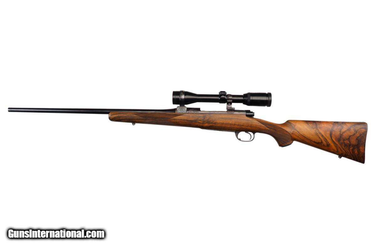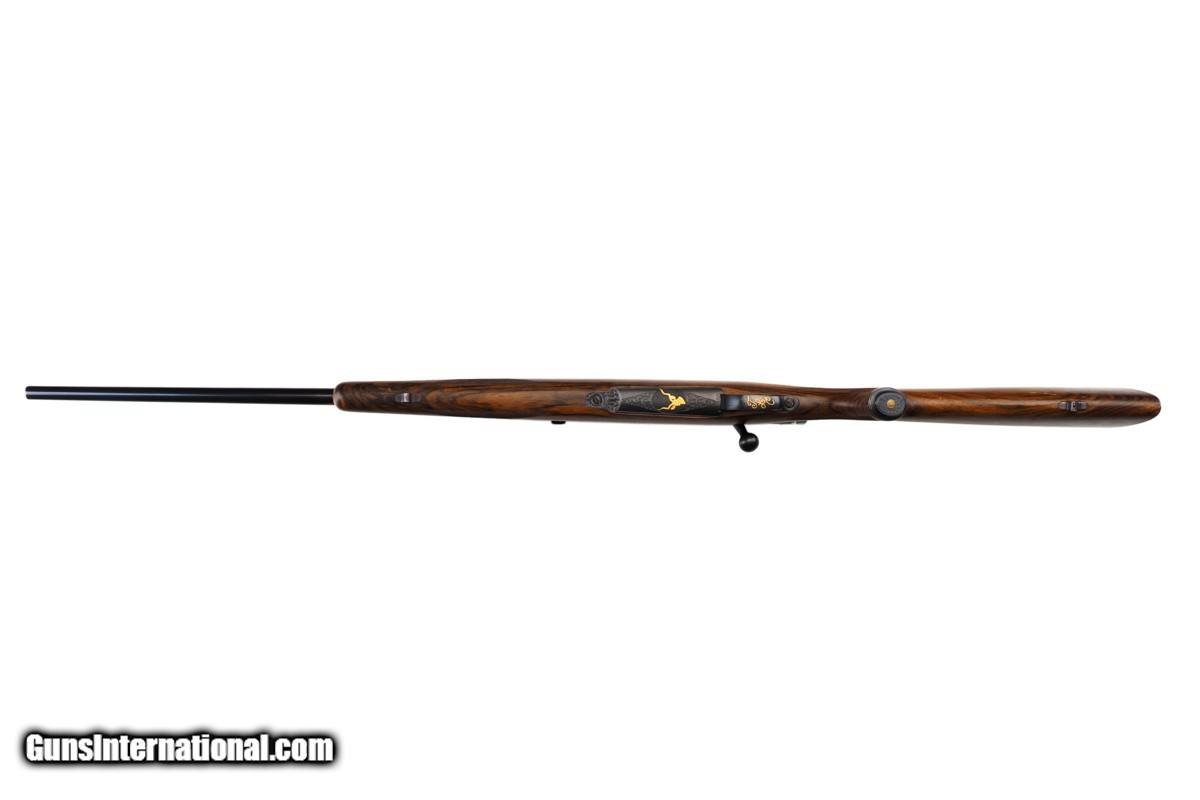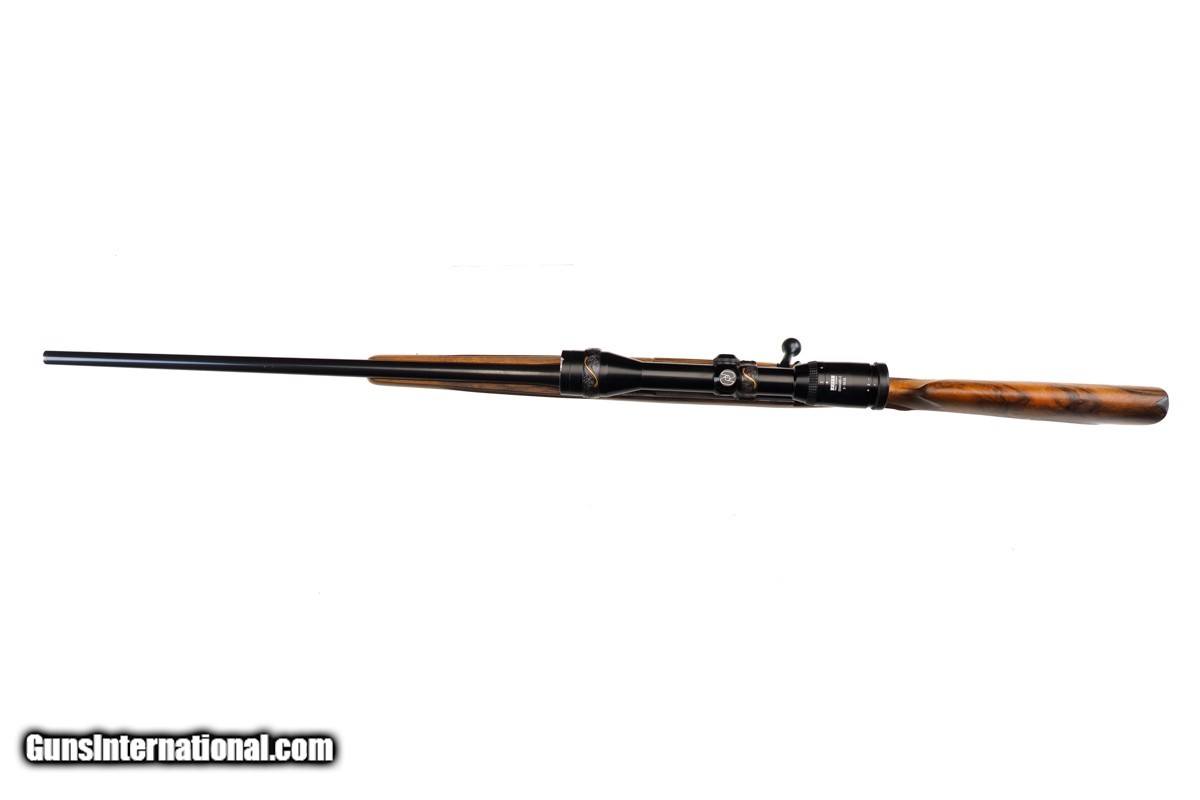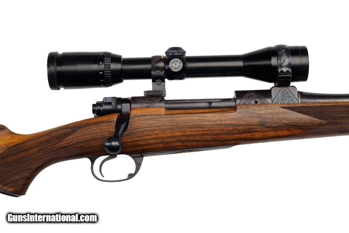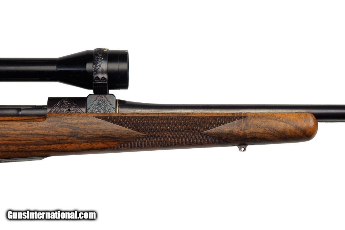 Description: 23" BARREL, ZEISS DIAVARI C 3-9x36 MC SCOPE, CUSTOM RINGS AND BASES, PISTOL HAND GRIP, ENGRAVED GRIP CAP, 13-3/4" LOP, BUTTPLATE, 8 LBS 14 OZ WITH SCOPE Custom bolt action rifle chambered for the .270 Winchester cartridge engraved by Mike Dubber. The 23" blued round steel barrel is adorned with a gold line near the receiver. The left side of barrel is engraved ".270 Win". The receiver and straddle floorplate are adorned with scrolls while the floorplate also has a gold-inlaid portrait of an antelope. The floorplate is signed "MWD 1990". The trigger guard bow is gold-inlaid in script "TLC" protecting a smoother single trigger. Zeiss DiaVari C 3-9x36mm rifle scope with custom bases and rings. Nicely marbled deluxe quality reddish-brown walnut stock with pistol hand grip, engraved grip cap, studs for sling and 13-3/4" LOP to a checkered steel buttplate, 8 Lbs.14 Oz. with scope/mounts.