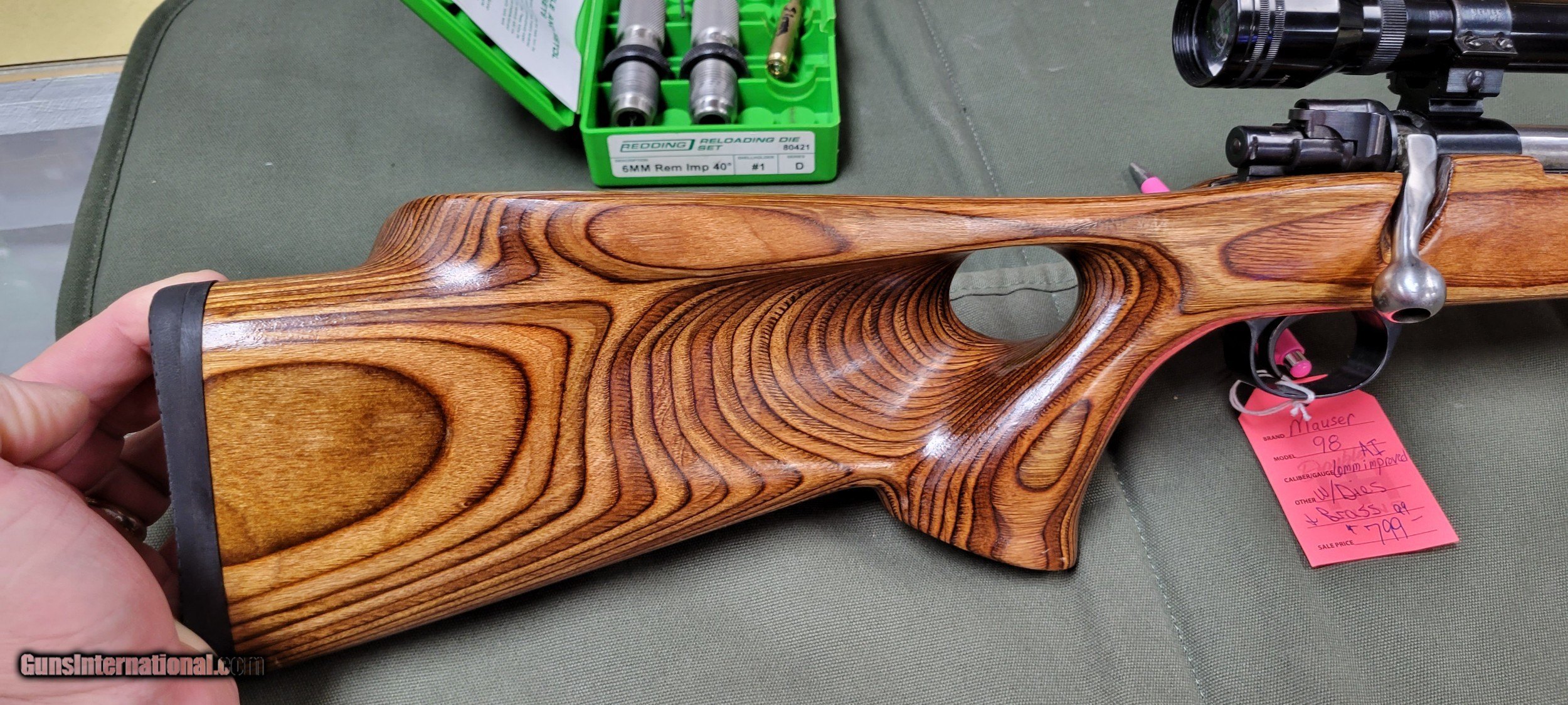Description: This is a very nice custom Mauser chambered in 6mm Rem Improved 40degree. It wears a 23.5" heavy barrel and a Boyds thumbhole stock. The rifle was barreled by a local Master gunsmith and has been shot very little since. The trigger is aftermarket and set at just shy of 3lb. Redding dies come with the rifle and well as 18 pieces of formed brass. It has a Tasco 10x40 scope that is clear. Please call or email with any questions. WE TAKE CREDIT CARDS, DEBIT CARDS, MONEY ORDERS, CASHIER CHECKS, OR EVEN PERSONAL CHECKS.........AS LONG AS THEY'RE GOOD! 3% will be added to all charge cards. GUNS WILL BE HELD UNTIL PERSONAL CHECKS CLEAR. GUNS SUBJECT TO PRIOR SALE. There is a $50 shipping charge for this gun gun and is NOT refundable. Insurance may be extra. Thank you, Darryl Howard SOLD |