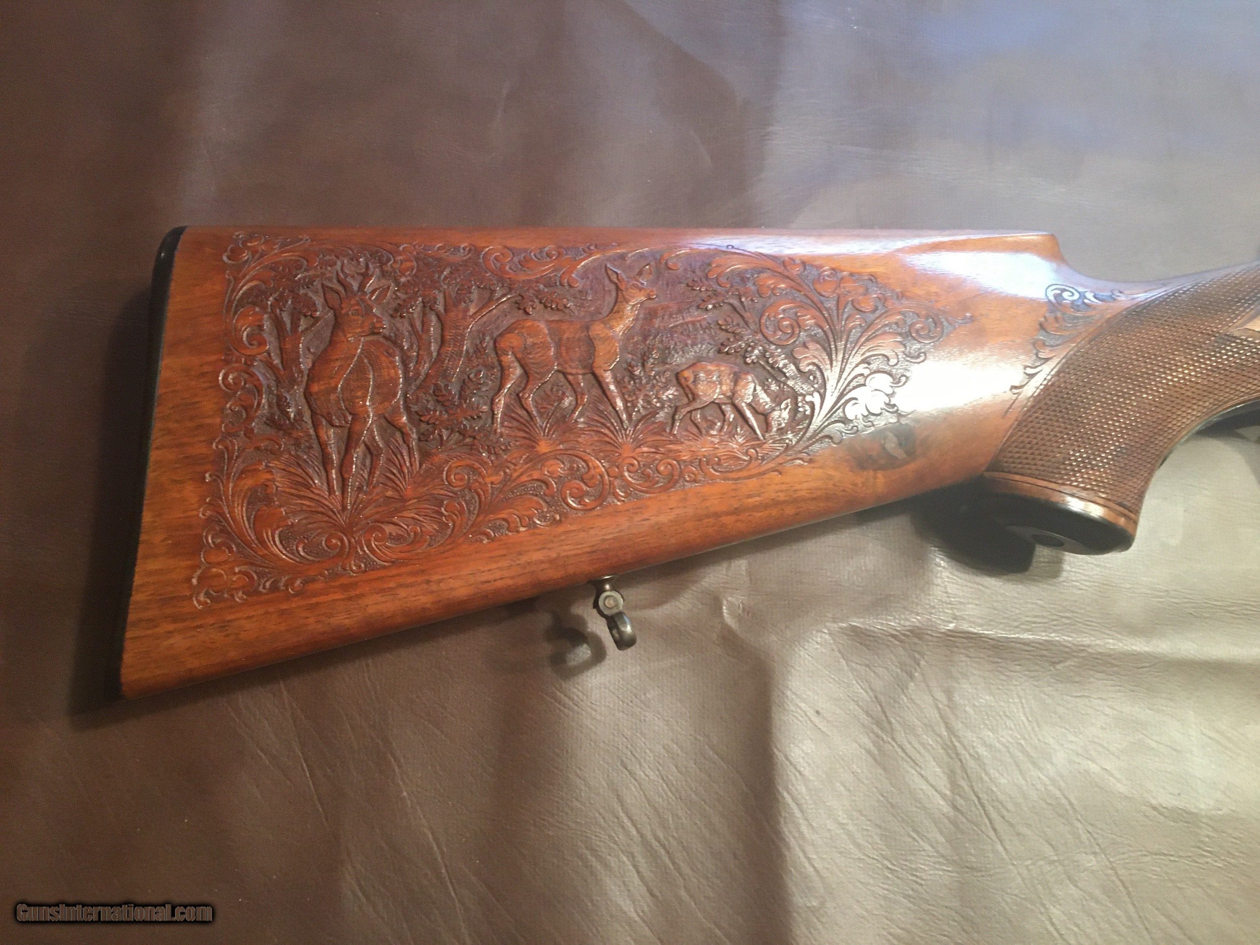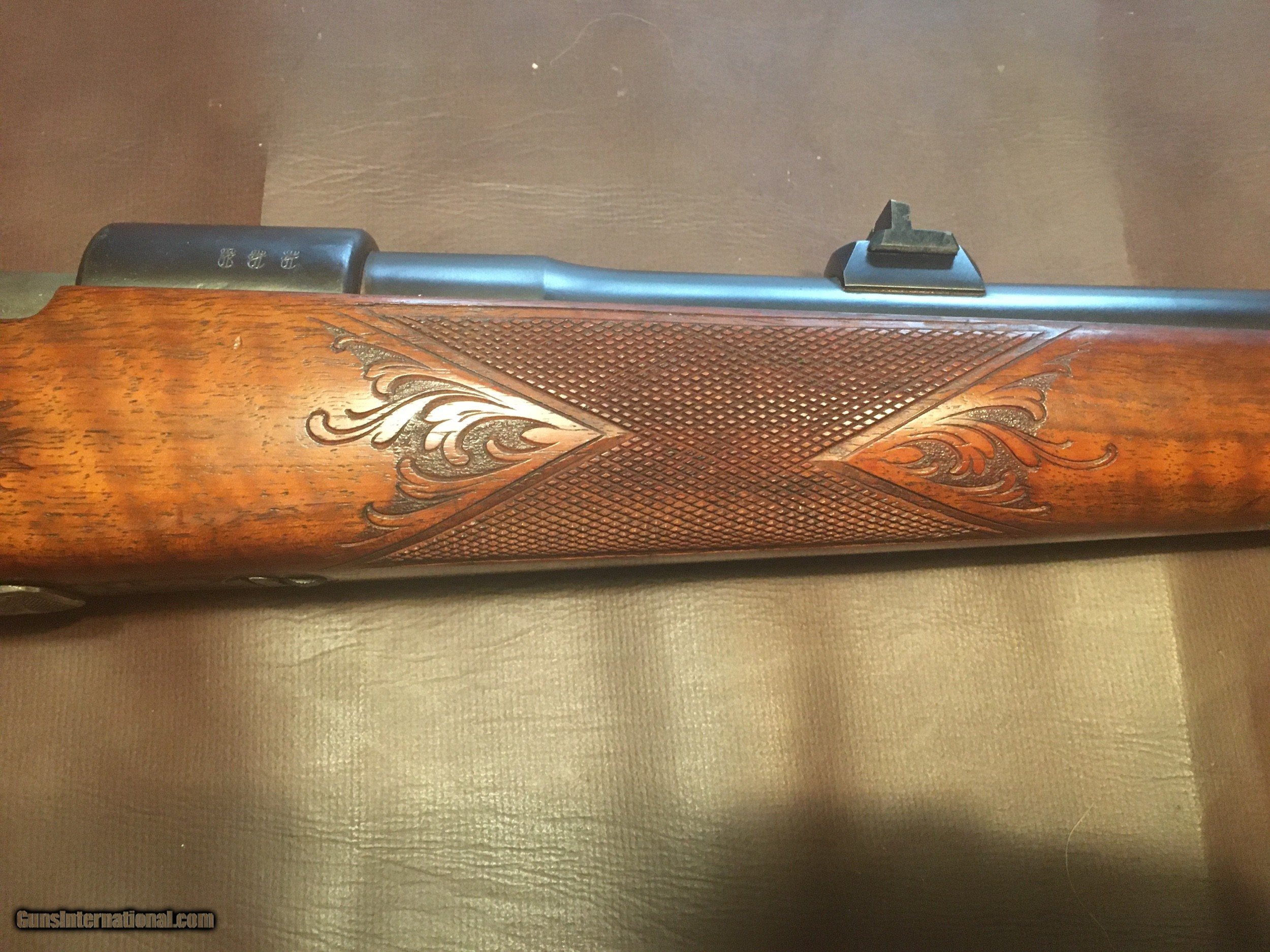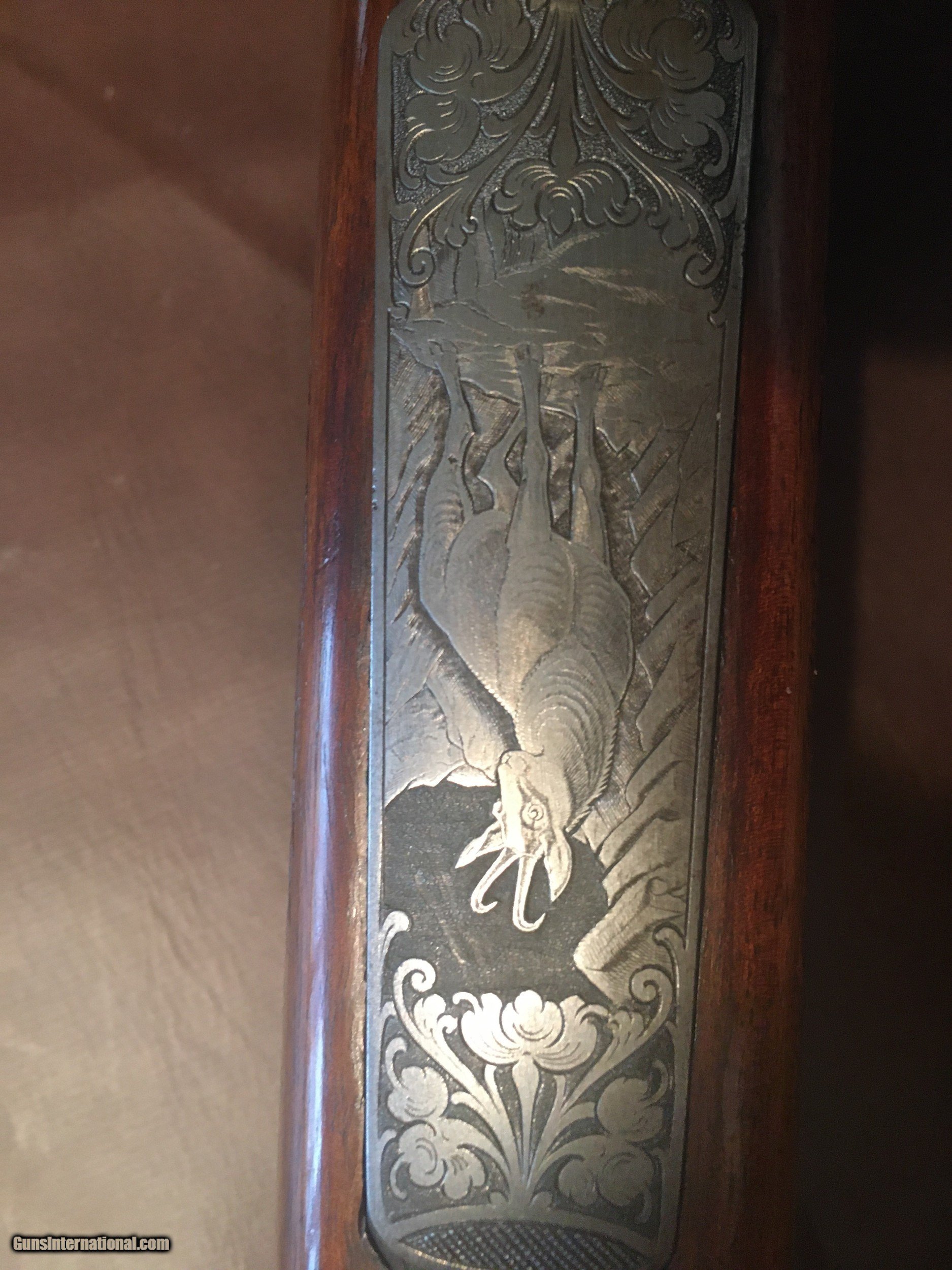 Description: Custom German Spandau in 270 Winchester spectacularly engraved floor plate of a Mountain Goat in deep relief on a peak with floral engraved borders . Great Black Forest style carved furniture . Right side of the buttstock with three deer in a woodland scene .Left side of stock with turkeys in the woods around the raised cheek piece . One side of forend with wild boar the other side a rendering of a Fox . Pistol grip and fore arm deep hand checkered . Spandau 1908 marked with proof marks and serial number 9128 . Mauser 98 action . Trigger guard with stylized initials and floral engraved borders . Sling swivels . Double set triggers . Serrated ramp front and raised V Notch rear sights . 23 1/2" barrel . 14 1/2" LOP Piece almost mark free , shoots great . Pictures do not do it justice . Sold as is , no returns . USPS money order only . Ships my FFL to yours . You will not be disappointed . Call me with questions , leave message and your phone number and l'll get back to you ASAP . OFFERS ALWAYS WELCOME . Thanks SOLD Rifle Caliber: .270 Winchester Manufacturer: Custom German in 270 Win Model: 98 Spandau Serial Number: 9128 Barrel Length: 23 1/2” Condition: Excellent Metal Condition: Excellent Wood Condition: Excellent Bore Condition: Excellent LOP: 14 1/2” Finish: Blue Weight: About 8 pounds Engraving: Great German style deep relief Extras: Spectacular carved furniture |