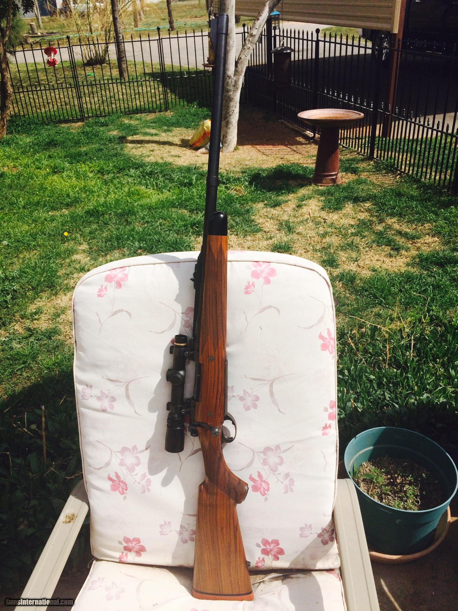 Description: Custom Model 70 by Winston Elrod. This is the ultimate in a big game rifle. Combines beauty and workmanship with utility. Chambered in 416 Rem Mag, it will handle any game from elephant on down. Along with the integral quarter rib it has a barrel band front sight with flip up night sight and barrel band sling stud. Rear stud is inletted two screw. Skeleton grip cap and ebony forend. Point pattern, wrap around checkering. Never been hunting but I did work up loads. A real shooter with Barnes 400 gr. TSX Bullets. SOLD LOP: 13 3/4 Sights: 1.75X5 Leupold Item Location: Gardendale, Texas |