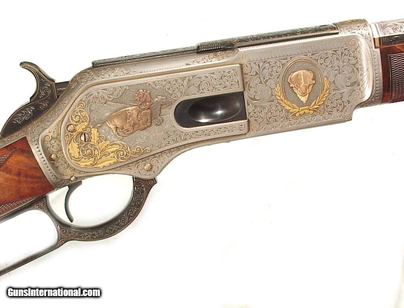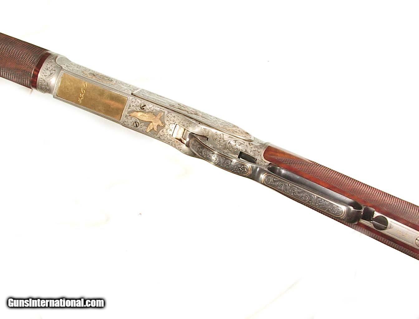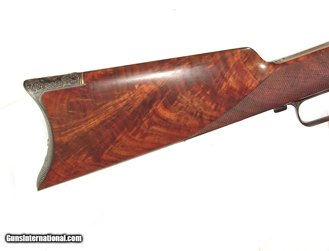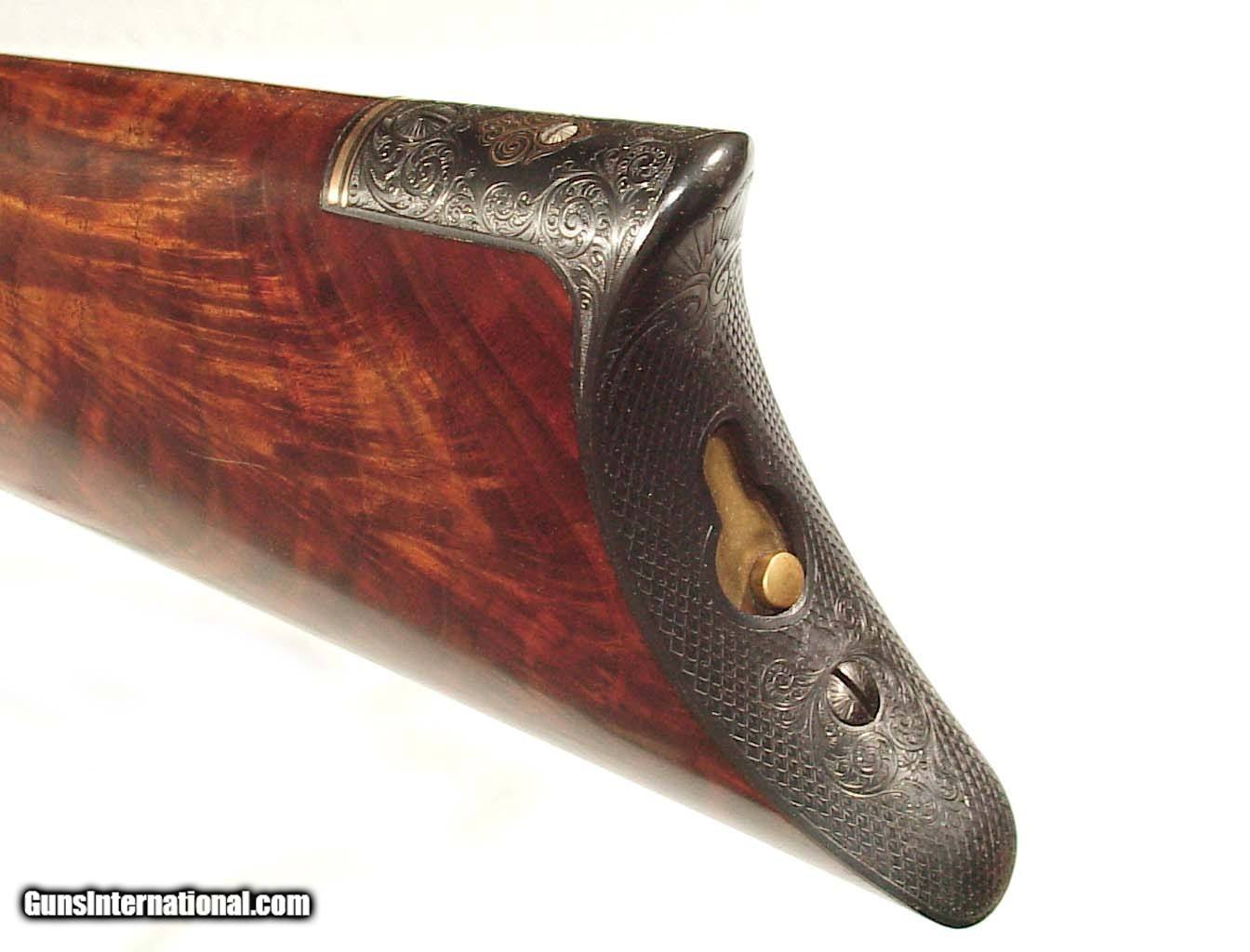Description: 45-60 caliber, 28" full octagon barrel and magazine. Deluxe wood and checkering. Fabulous John Warren engraved in fine scroll with extensive 3 color gold bands and inlays depicting game scenes. Words can't describe the superb and meticulous work on this rifle. Stunning deluxe wood and checkering. Every part of the rifle is decorated in some manor. John Warren in considered to be one of the finest engravers of the 20th century and this may be his best work. SOLD |