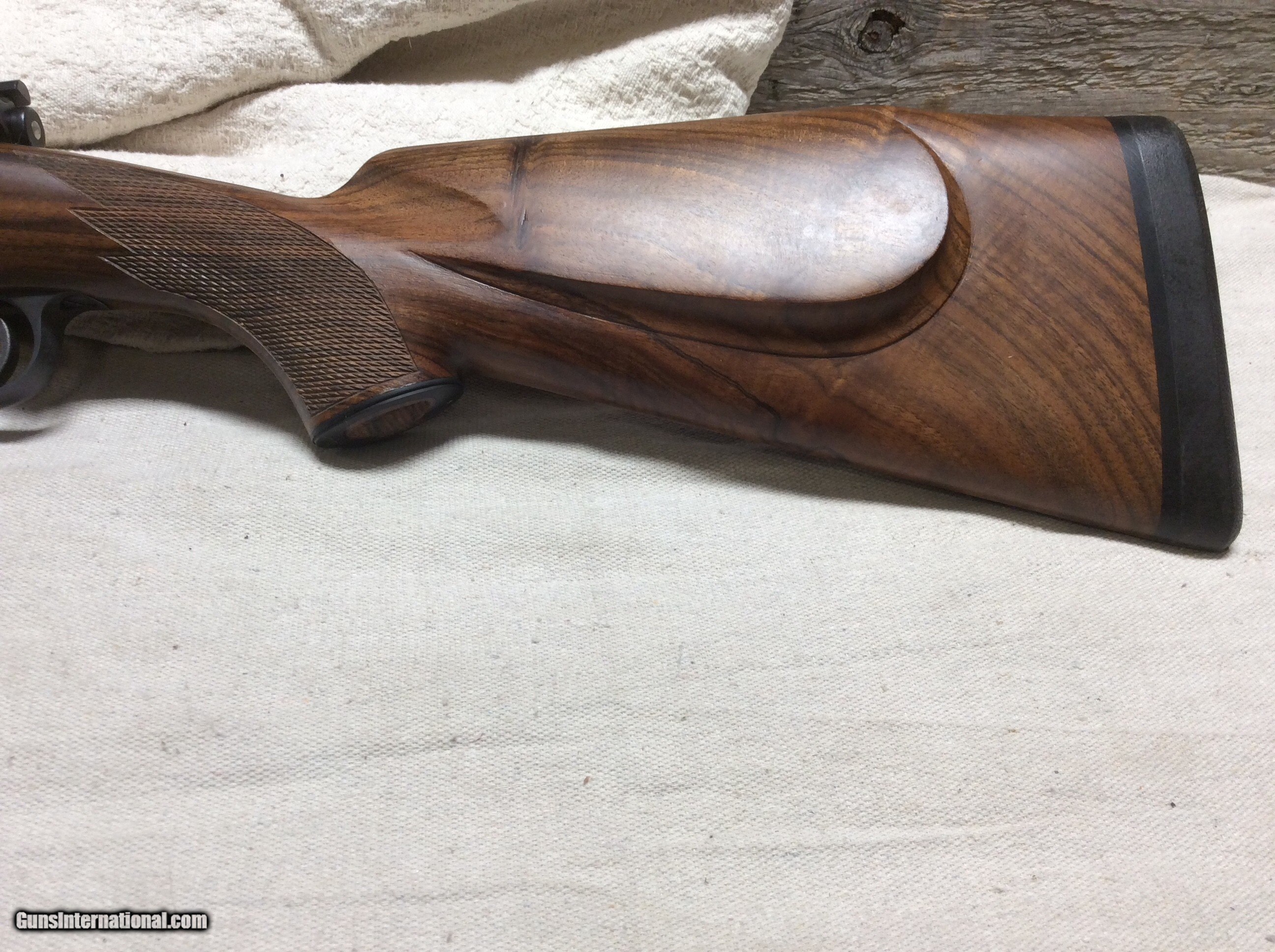 Description: This is a beautiful custom made rifle by Jim Rector of La Grande OR. This rifle is new. As you can see it is a full custom in a very interesting and usable cartridge. Custom barrel custom Talley style scope bases . Machined in place. Walnut stock with ebony tip, skeleton grip cap with checking, point pattern checking, Grisel Bottom metal and much more combined to make a beautiful rifle. Priced to sell SOLD |