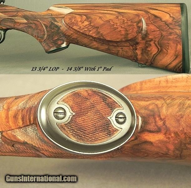 Description: #701, Gary L. Goudy 25-06 Improved (40 Degree Shoulder) Full Custom Built by Him in 2001 on a Winchester Pre-War Model 70 Action #701 that was Made in the 1st year of Production in 1936, It was custom ordered and built for a Doctor in Wadesboro, N. C. with Exhibition Wood & Exhibition checkering, 2 piece scope bases, Model 70 trigger, Action rails inside are polished, Built-up & checkered bolt stop release, Blackburn bottom metal with a straddle hinged floorplate with a center bow release, 5 panel teardrop bolt knob checkering, A Goudy Custom Classic style stock, Super piece of English Walnut wood that was ordered as Exhibition, Shadowline European style cheekpiece, Outstanding wrap around Fleur-de-lis checkering pattern with ribbons thru the panel with carved borders for the Fleur-de-lis's with checkering inside the inset, Not many custom stockers can cut a pattern like this, Check out the photos, Skeleton grip cap, 2 screw tiedown sling eyes, 8 lbs. 4 oz. as is with the bases, 13 3/4" LOP over a 1/2" pad, Can go to 14 3/8" with a 1" pad, The bore remains as new, The original rust blue remains at 98%, The original stock finish at 96%, The checkering is at 100%, The rifle is accurate. Mr. Goudy is one of the best stockers and certainly is at the top of the class of American Classic Style bolt rifles. He knows the game well and he is a hunter that applies the field to the gun. SOLD |