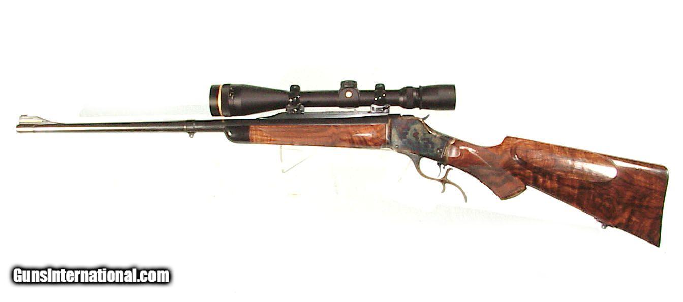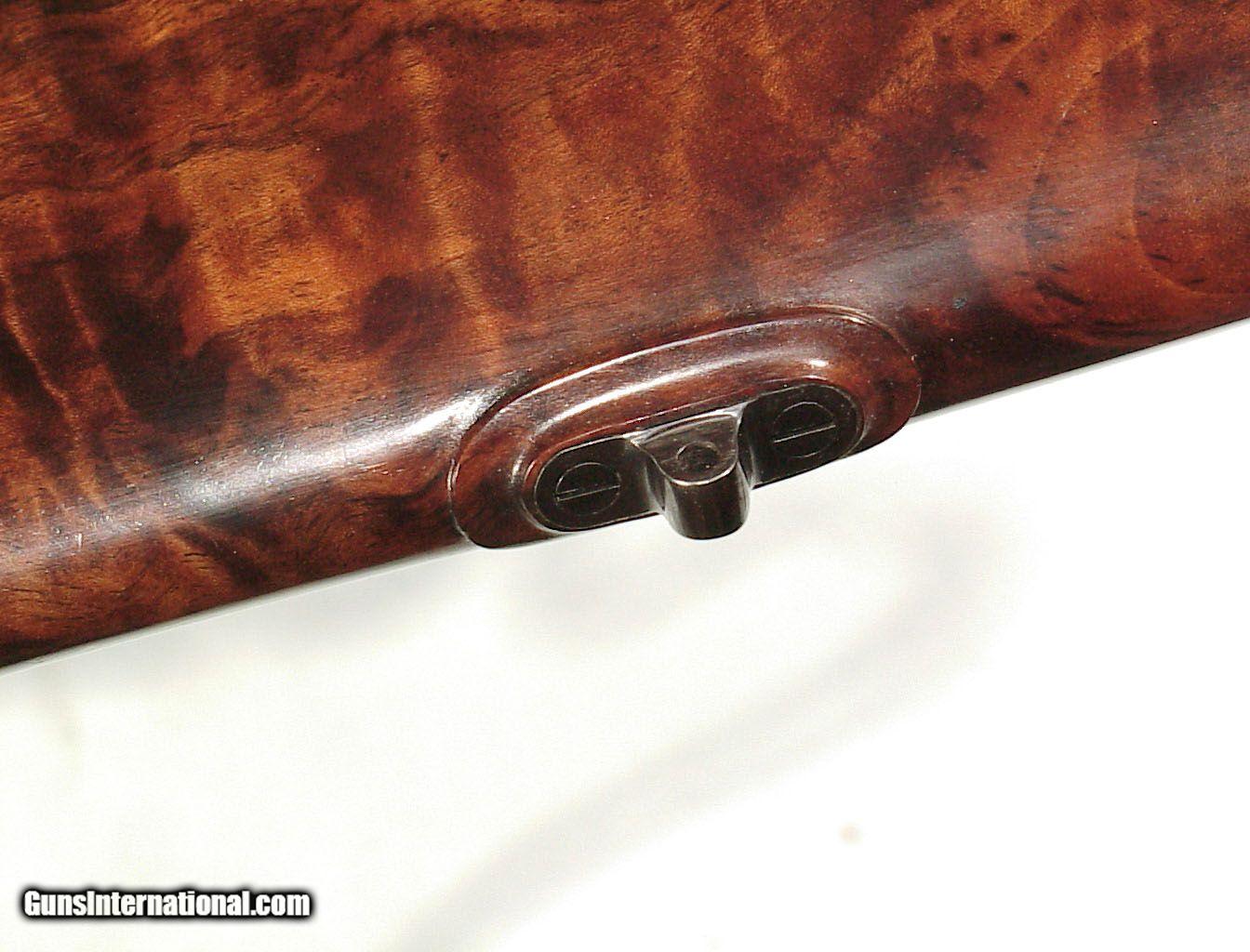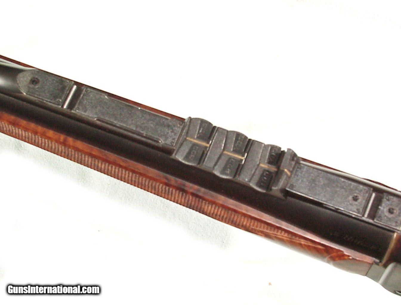Description: .22 hornet caliber, 24" barrel marked "DAWIN HENSLY No 213" & "GRIFFIN & HOWE, NEW YORK CITY". Ramp front sight and quarter rib 4 leaf (3 folding) express sight. In addition it is accompanied 8x to 20x variable Leopold scope with quick detachable mount. Casehardened frame and custom lever. Set trigger. Magnificent stock work by Darwin Hensley. Features include skeletonized grip cap, pedestal sling swivel mounts, fine line checkering just to name a few. In mint condition. This is really a spectacular rifle. SOLD Antique: Yes |