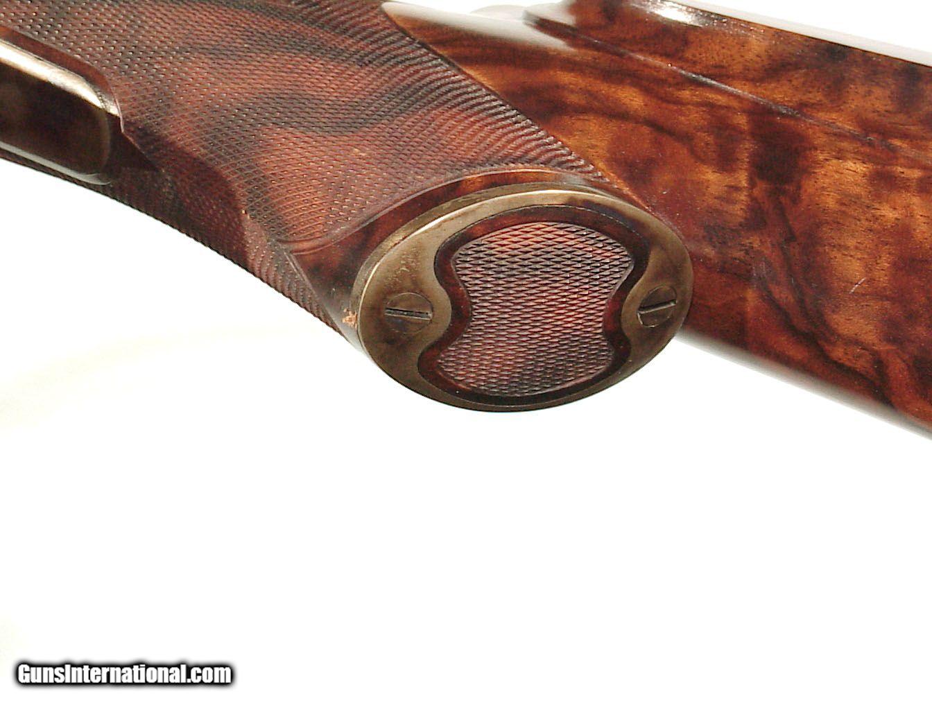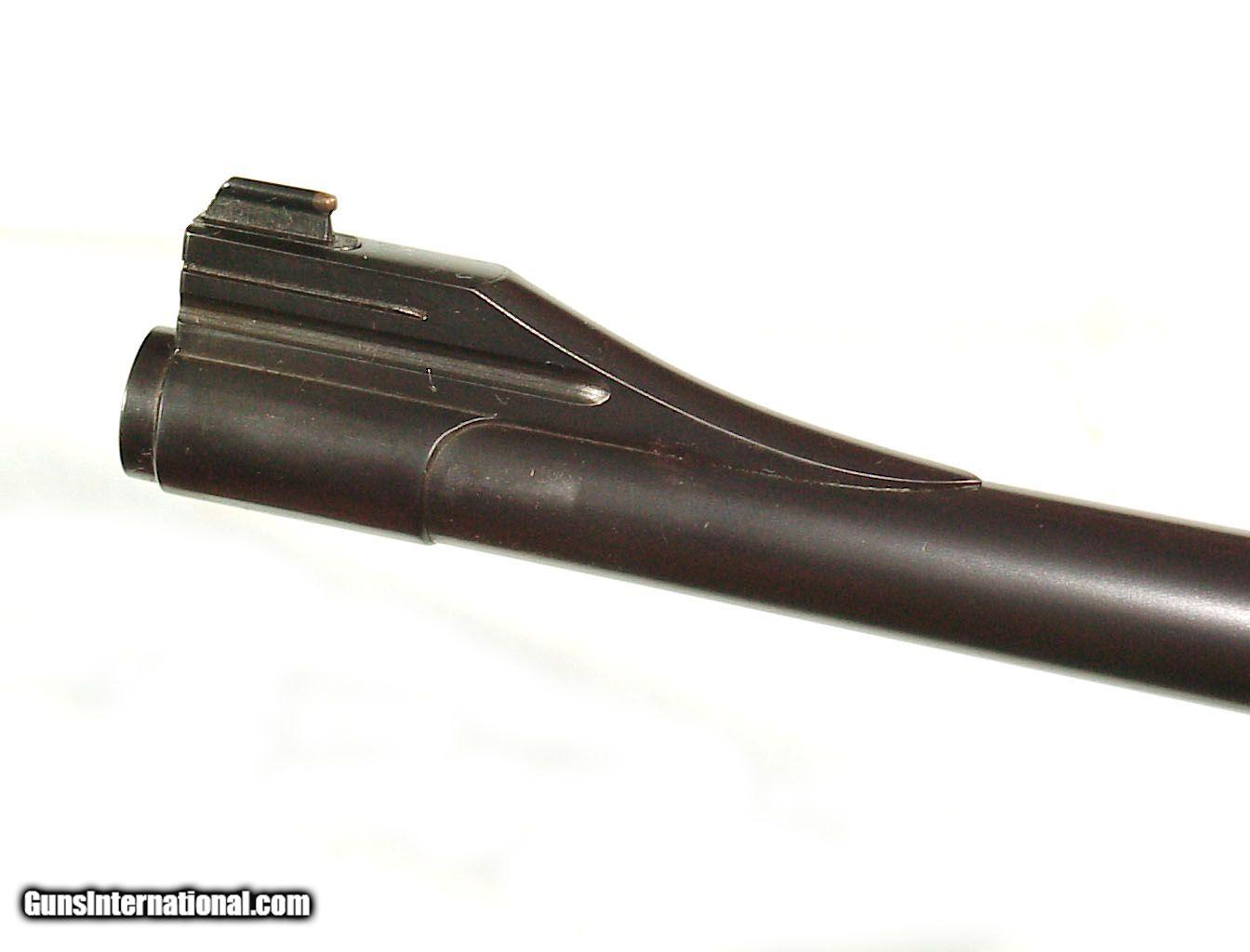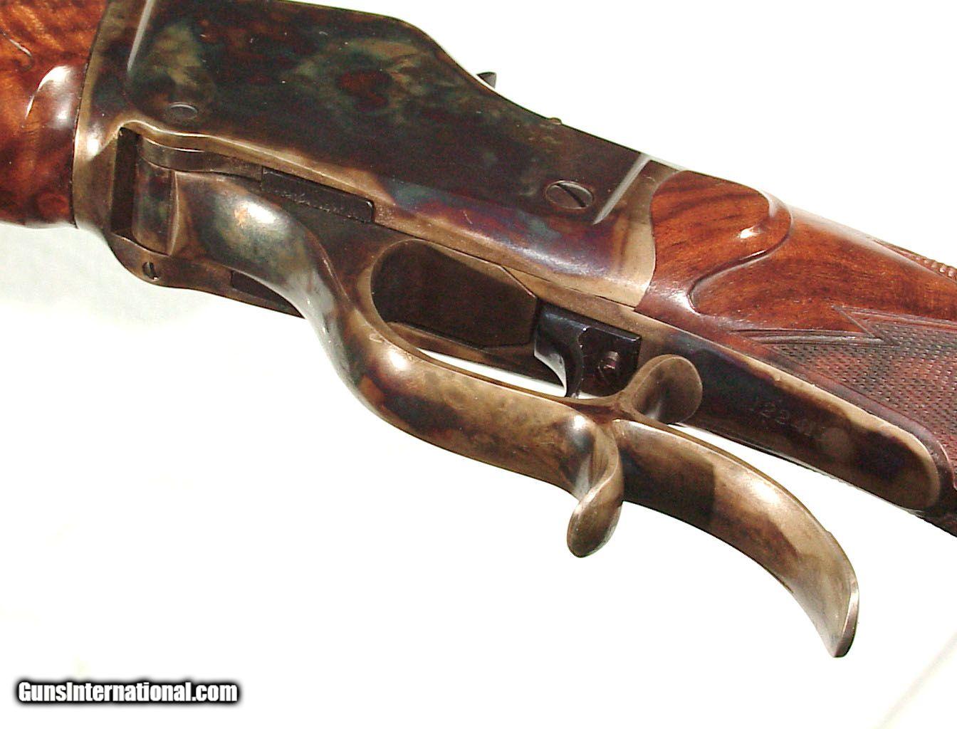 Description: .22 hornet caliber, 24" barrel marked "DAWIN HENSLY No 213" & "GRIFFIN & HOWE, NEW YORK CITY". Ramp front sight and quarter rib 4 leaf (3 folding) express sight. In addition it is accompanied 8x to 20x variable Leopold scope with quick detachable mount. Casehardened frame and custom lever. Set trigger. Magnificent stock work by Darwin Hensley. Features include skeletonized grip cap, pedestal sling swivel mounts, fine line checkering just to name a few. In mint condition. This is really a spectacular rifle. SOLD Antique: Yes |