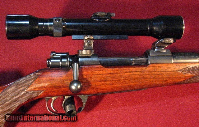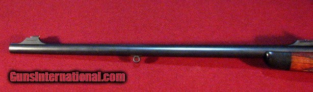 Description: Jeffery Mauser in .333 Jeffery by W.J. Jeffery & Co. Ltd, 9 Golden Square, Regent St, London built on a Mauser 98 action with a 24" barrel with an island ramp front sight, barrel attached sling stud, and an island four leaf express rear sight with one standing and three folding leaves. The bore is excellent. The receiver is topped with a rail mounted Hensoldt-Wetzlar 4 power scope with a post and two heavy crosshairs in claw mounts. Optics are excellent. Double set triggers. Bottom metal witha straddle floorplate and trigger bow release. Jeffery serial number on trigger bow. Stocked in the English style in mostly straight grained English Walnut with some fiddleback figure with point pattern checkering, slim forend, and horn forend tip. LOP is 13 1/2" to a soft rubber pad. Weighs in at 9lb 9oz as scoped. This is a nice London rifle by a very reputable English maker in overall good condition showing light hunting use. William Jackman Jeffery was at 9 Golden Square, Regent St. from 1928 until 1953 with the business ultimately purchased by Holland & Holland in 1959. Included are 40 rounds new Bertram brass, 17 rounds modern Kynoch 300 grain solids and 3 empty brass, and 38 rounds professionally loaded custom ammo with Woodleigh bullets [20 300grain soft and 18 250 grain soft] SOLD |