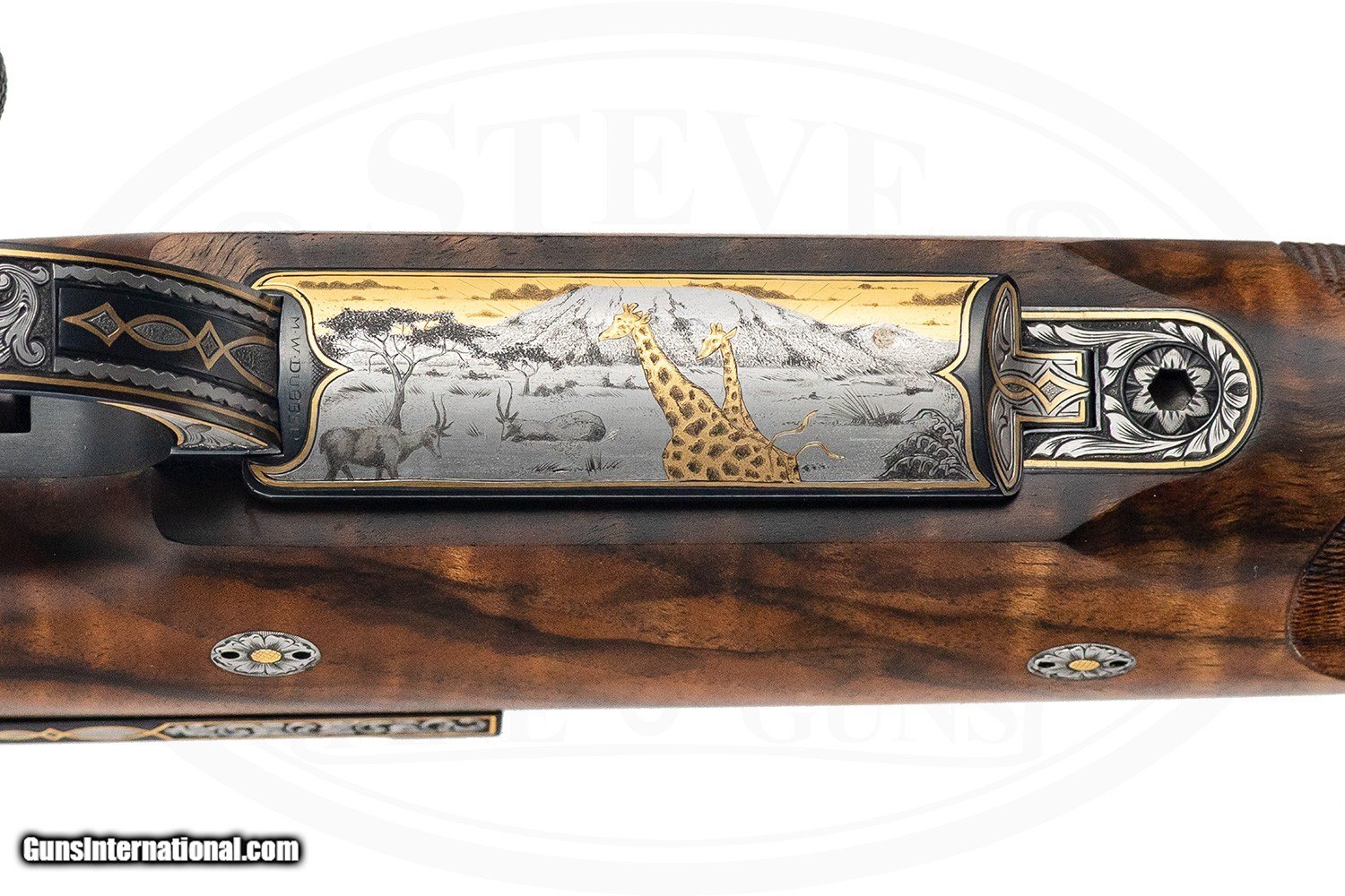 Description: SN# NSN FRENCH MAUSER ACTION - MADE 1945-1947 DUBBER ENGRAVED ADDITIONAL FLOOR PLATE - SAFARI SCENE 24" BARREL WITH QUARTER RIB - I STANDING LEUPOLD SCOPE WITH ENGRAVED RINGS 1 MAGAZINE SCOPE BASES HAVE COVERS FOR WHEN SCOPE IS NOT MOUNTED BANDED FRONT SIGHT - HOODED 5 PANEL CHECKERED AND ENGRAVED BOLT REINFORCED TOP AND BOTTOM TANGS ENGRAVED PISTOL GRIP BARREL BANDED SLING STUD INLETTED READ SLING STUD CHEEK PIECE LEATHER COVERED RECOIL PAD OAK AND LEATHER CUSTOM HARD CASE CONDITION IS EXCELLENT AS NEW 7LBS 4 OZ 14" LOP Price: $42,500.00 Buy Now Contact Seller |