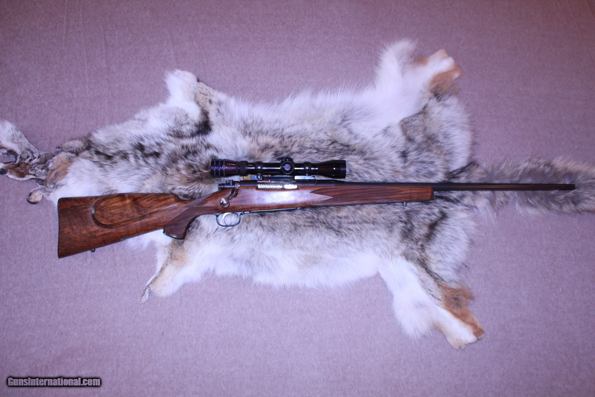 Description: Custom M70 Winchester action fitted with custom 23 ½” barrel and chambered in 300 Weatherby Magnum. Jeweled bolt and follower, checkered bolt release, checkered bolt knob. Factory M70 bottom metal with contoured trigger guard. Redfield single piece base and rings with Redfield 2-7 scope. Duplex reticle. Stocked by Stegall with a beautiful piece of Tessier French Walnut. Classic style with double shadow left hand cheekpiece. (Cheekpiece could be removed making a classic stock.) Point pattern checkering that wraps around the forearm and over the grip top with silver diamond in the forend. Vacant silver oval in bottom of buttstock. Two screw checkered steel pistol grip cap. Sling eyes on stock. 13 7/8” LOP over a checkered steel Neidner style buttplate. Weight 8 lbs 14 oz. Overall VG to excellent condition with some light handling marks on stock. Rifle appears to have had little use. 3 day non firing, non disassembly inspection. Includes one box of factory Weatherby ammunition. Ships in hard plastic case. Please check my other s for more custom rifles and parts. Thanks for looking! SOLD Rifle Caliber: .300 Weatherby Magnum |