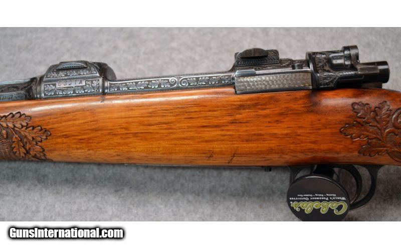 Description: Beautifully engraved custom rifle by Kurt Jager of Mainz, Germany. Mauser action with custom engraving, with jewelled bolt and magazine follower Bolt release is also jewelled. . Custom stock with raised comb and beautiful checkering/engraving. Barrel is marked "Bohler Spezial" on left side. Hardwood tip on forend. SOLD Caliber Info: 7x57mm Metal Condition: Excellent with minor scratches and finish wear, mostly by muzzle. Wood Condition: Excellent with minor handling wear Bore Condition: Excellent Barrels: 24 Triggers: Mauser Stock: Checkered walnut with minor handling wear and dings Stock Dimensions: 13 1/2" LOP Fore End: Checkered walnut with hardwood tip. Minor handling wear, 2 dings above magazine floor plate on left side. Butt Pad: Black rubber White Line by Pachymar recoil pad Sights: Front fixed sight on ramp, folding leaf rear sight. Item Location: Christiana, DE |