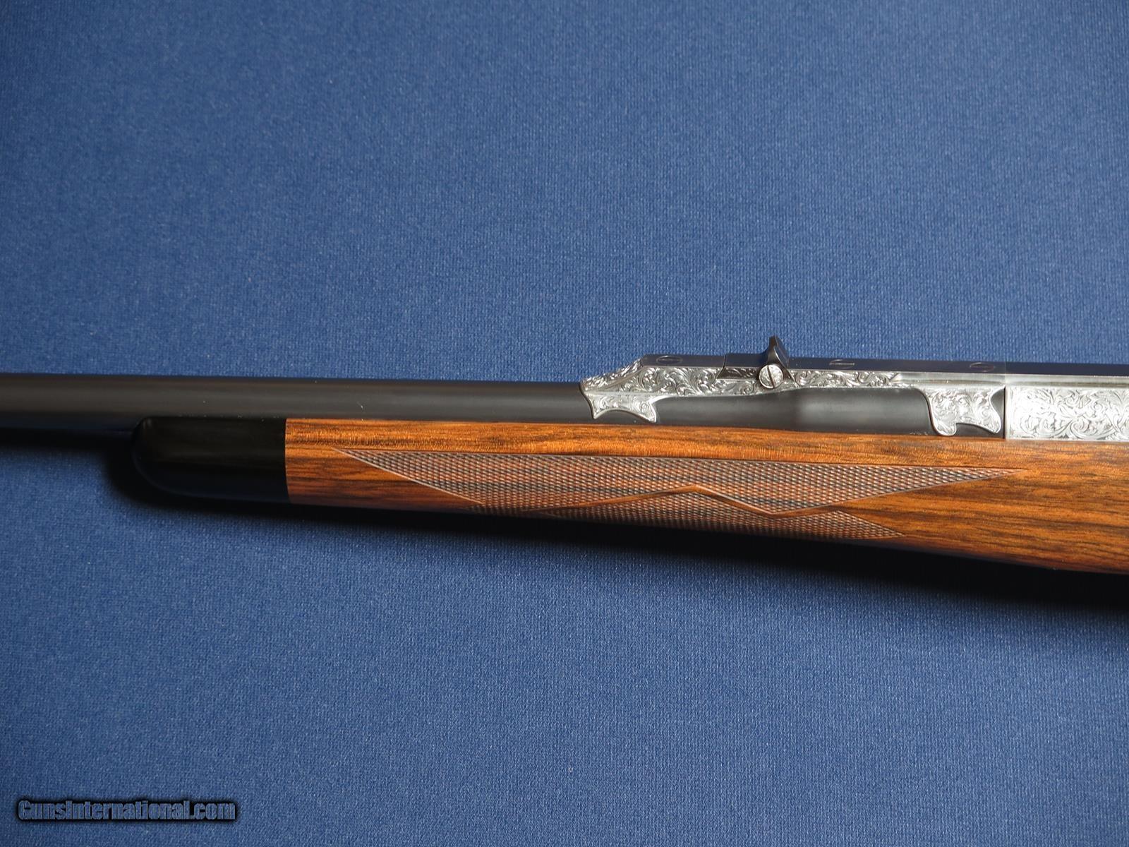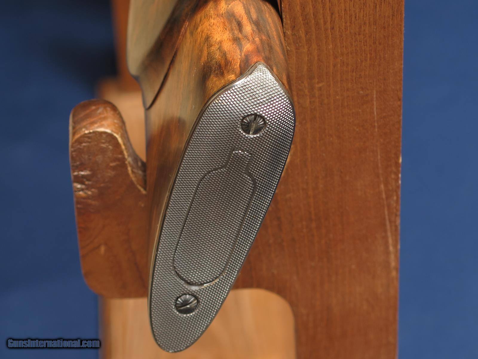 Description: Leonard Francolini 30-06 engraved custom rifle. 22 inch barrel. Action built by Jimmy Bollinger. Front sight and magazine built by Penrod. Beautiful custom stocked by Don Klein in French walnut. 18k trigger, bolt release and bolt knob. Checkered metal butt and engraved grip cap with trap. 99% condition. Signed by Francolini. Amazing gun. Over 45 years in business, and not only do we buy guns, but we accept collections (and single/multiple guns) on consignment. SOLD |