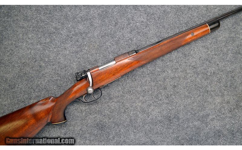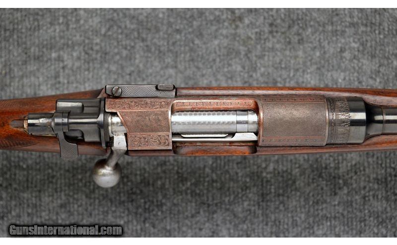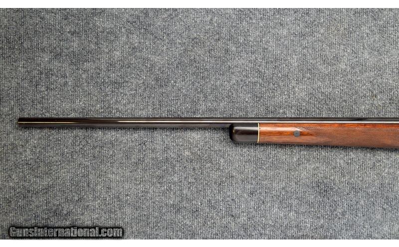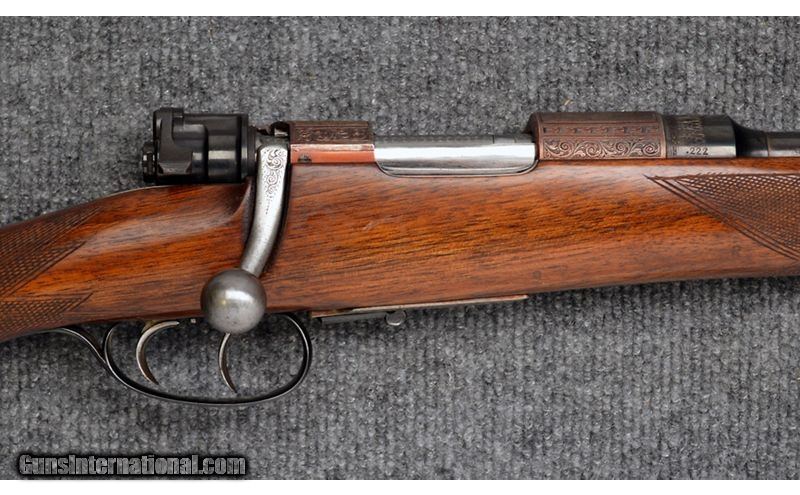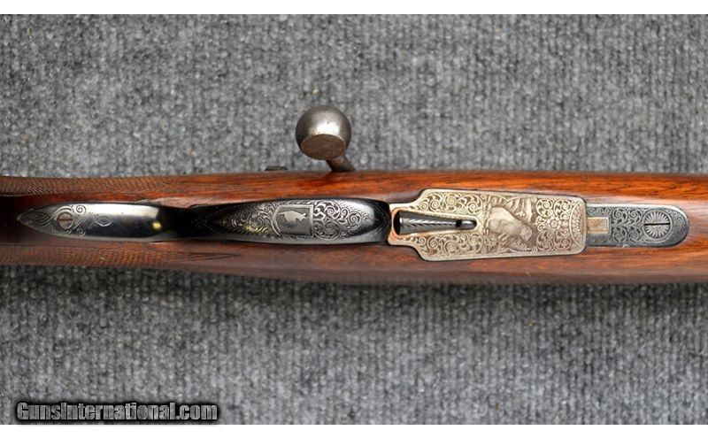 Description: For your consideration, a custom rifle by Marholdt of Innsbruck, Austria chambered in .222 Remington. The action is of a miniature Mauser 98 type with jeweled bolt body, German scroll motif, and densely stippled top strap. The bottom metal consists of a lever release floorplate featuring a vignette of a marmot and a shield bearing the silhouette of a chamois on the trigger guard. The stock, with its Bavarian, double beaded cheekpiece, is book ended by an end cap and buttplate of horn. It is unclear if the reddish tone of the receiver is the remnant of a fading, original finish or traces of layout fluid from the engraving process. .222 Remington SOLD Metal Condition: Very Good Wood Condition: Very Good Bore Condition: Excellent Barrels: 26 Triggers: "Adjustable, Set Trigger Stock Dimensions: 15.5" LOP Butt Pad: Basketweave Weight: 8 LBS Sights: None Item Location: Hamburg, PA |