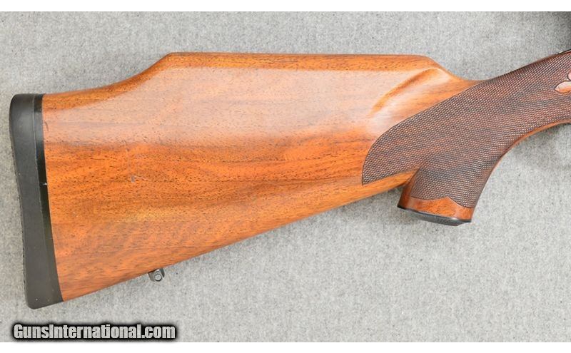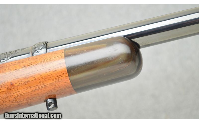 Description: For your consideration, a 98 Mauser action custom rifle chambered in .338 Winchester Magnum. The nationality and manufacture of the action is unknown, however, the lack of a stripper clip guide rules out military origins. The action, scope base, bolt handle, bottom metal, bolt rear, pistol grip cap, and half of the barrel have been gorgeously engraved with acanthus scroll work. Topping the action is a Leupold Vari-X-III 2.5×8 scope in a Redfield base. This is supplemented by a folding peep rear and bronze inset front sight. The bolt body is jeweled. The stock is checkered wrist and forend and features a beaded cheekpiece and horn forend tip. Included is a model 3F sling by the George Lawrence Saddlery which has been tooled in a pattern matching the receiver engraving motif. The sling swivels are likewise engraved. All in all, a gorgeous addition to any collection. .338 Winchester Magnum SOLD Metal Condition: Excellent Wood Condition: Excellent Bore Condition: Excellent Barrels: 24 Triggers: Serrated Face Stock Dimensions: 13.5" LOP Fore End: Checkered Butt Pad: Pachmayr Weight: 9.5 lbs Sights: Iron Sights and Scope Item Location: Hamburg, PA |