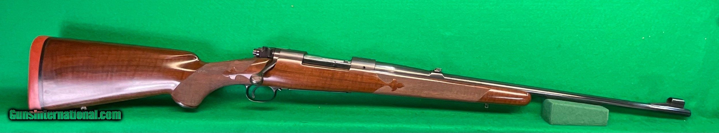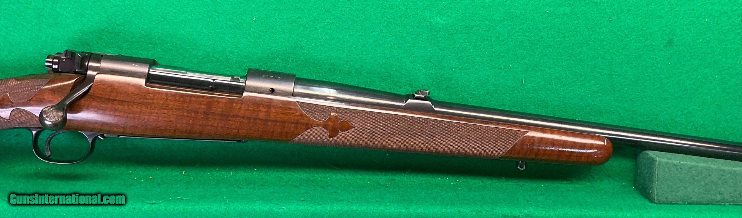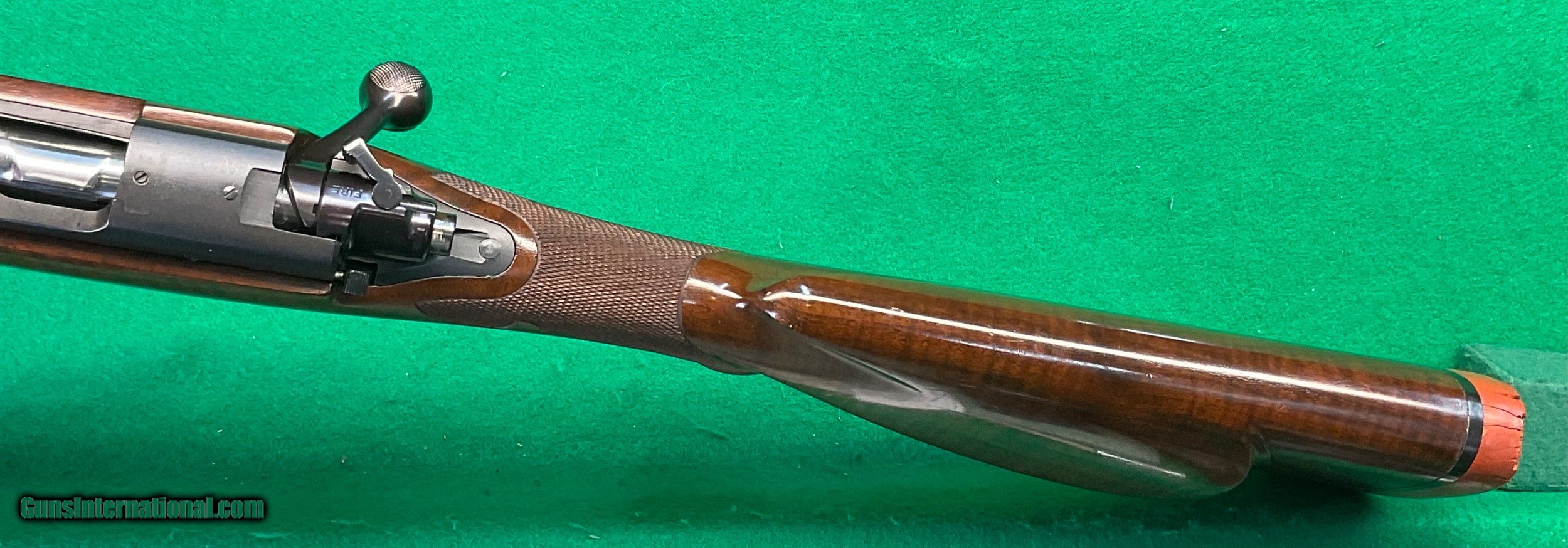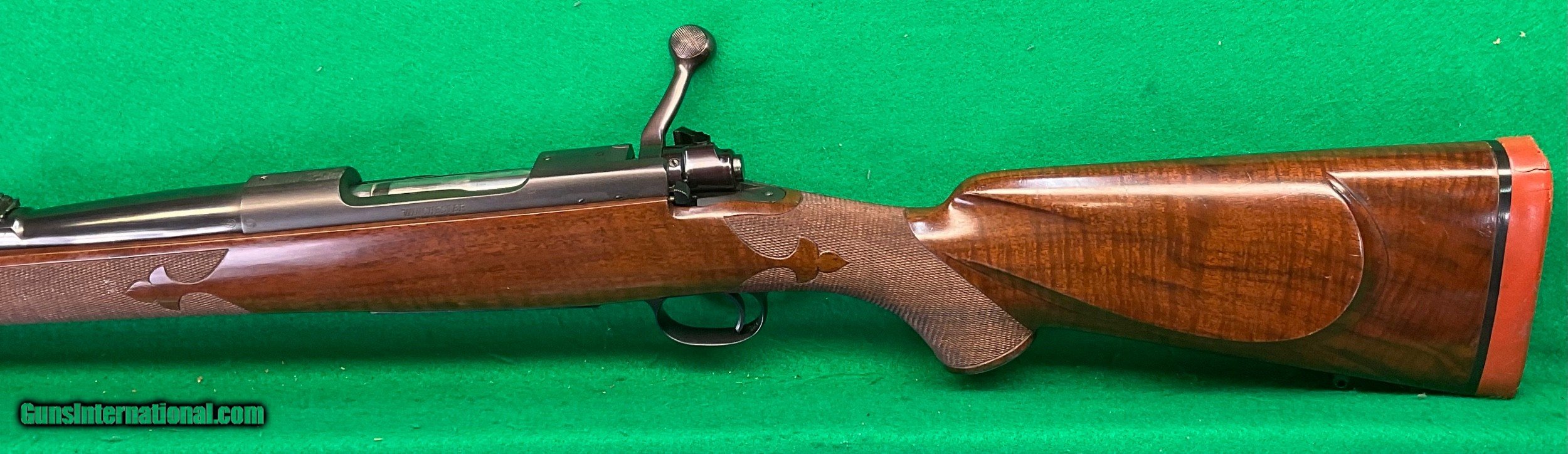 Description: Title doesn't mean much until,you consider the other beautiful rifles I've owned. Griffin & Howe, Champlin Haskins, Holland & Holland and Purdy among others. This 1951 Pre-64 model 70 30-06 custom stocked has some very fine metal features including a pre-war style contoured tang and bolt handle plus checkered bolt knob. Rear sight boss thinned down on the sides. Overall stunning metal work above and beyond the norm. Magnificent walnut stock completes the package, only flaw I find is the top of the recoil pad showing some age .cracks. No way could this be reproduced for twice my price in todays market assuming you could find someone who could do this quality work in your lifetime. $2898 plus $60 insured shipping. Extended layaway available. No credit cards and no trades. C&R ok. SOLD Curio/Relic: Yes |