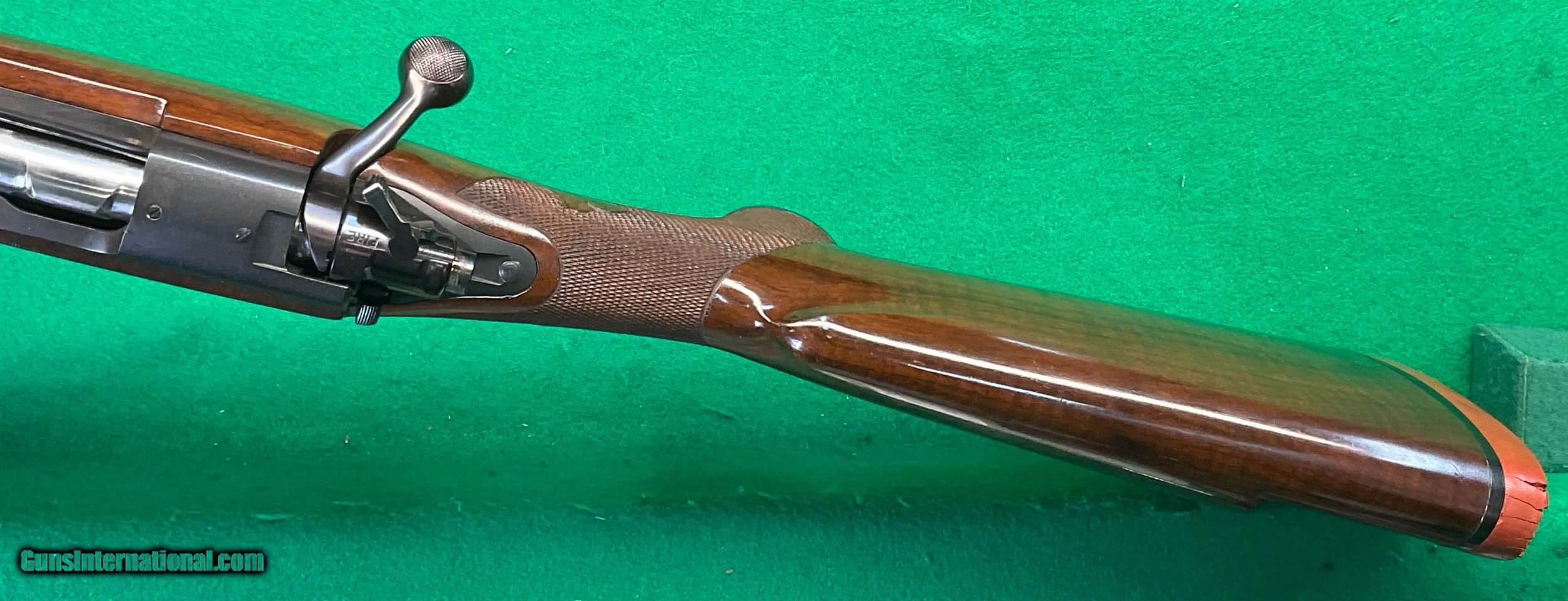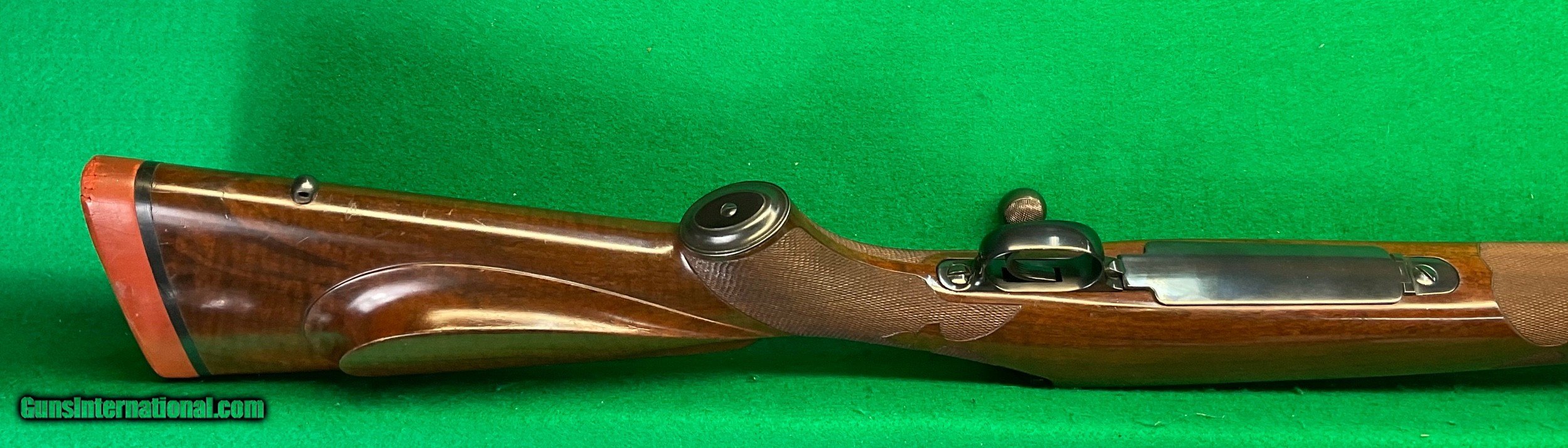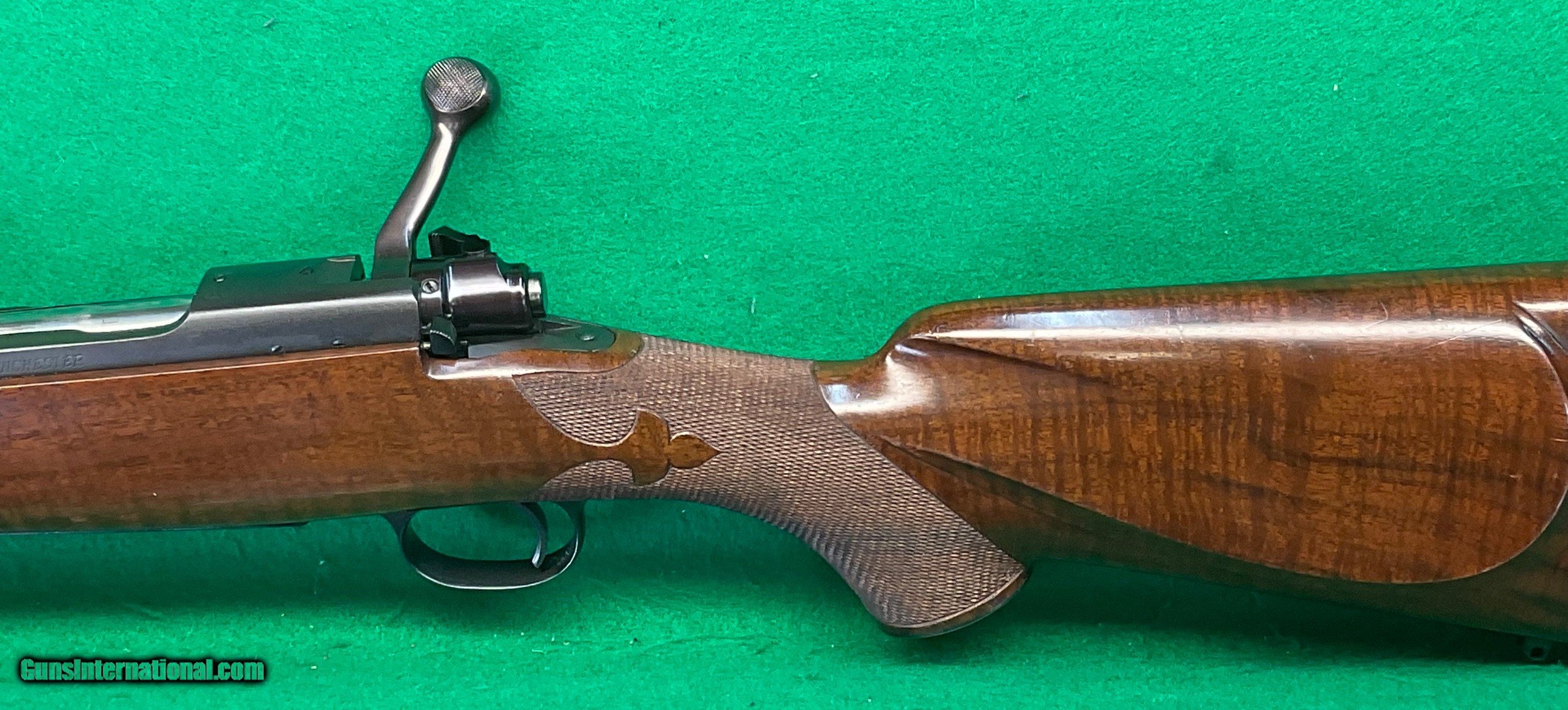 Description: Title doesn't mean much until,you consider the other beautiful rifles I've owned. Griffin & Howe, Champlin Haskins, Holland & Holland and Purdy among others. This 1951 Pre-64 model 70 30-06 custom stocked has some very fine metal features including a pre-war style contoured tang and bolt handle plus checkered bolt knob. Rear sight boss thinned down on the sides. Overall stunning metal work above and beyond the norm. Magnificent walnut stock completes the package, only flaw I find is the top of the recoil pad showing some age .cracks. No way could this be reproduced for twice my price in todays market assuming you could find someone who could do this quality work in your lifetime. $2898 plus $60 insured shipping. Extended layaway available. No credit cards and no trades. C&R ok. SOLD Curio/Relic: Yes |