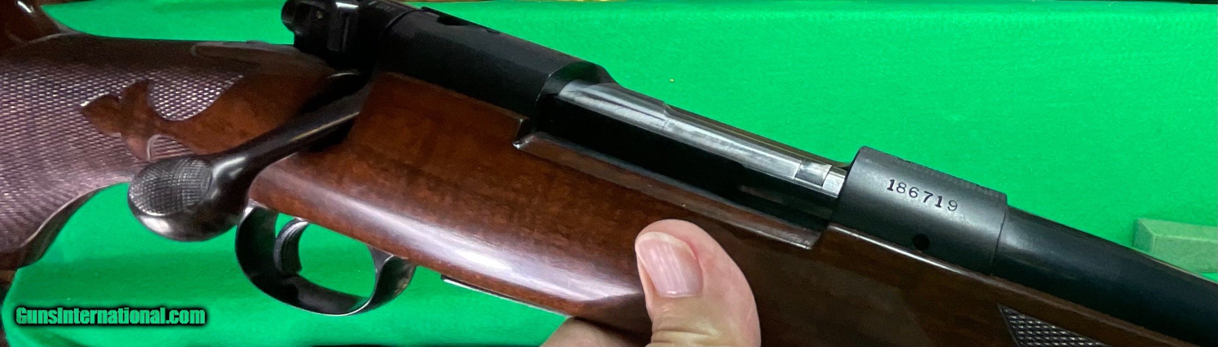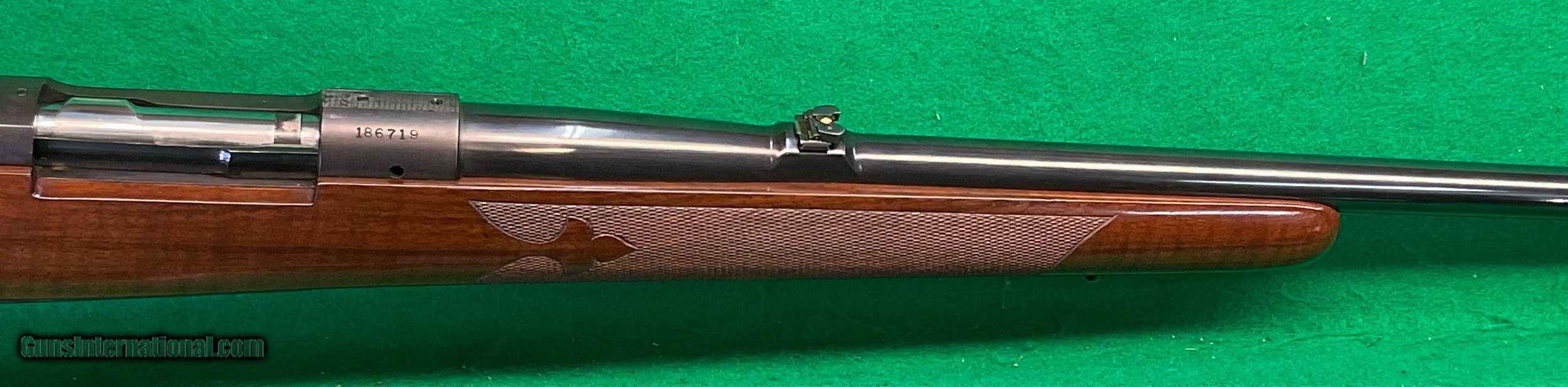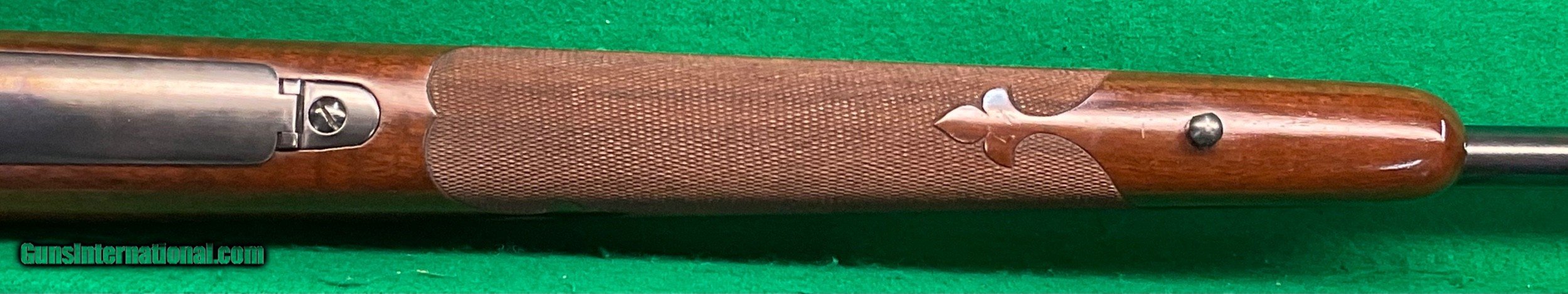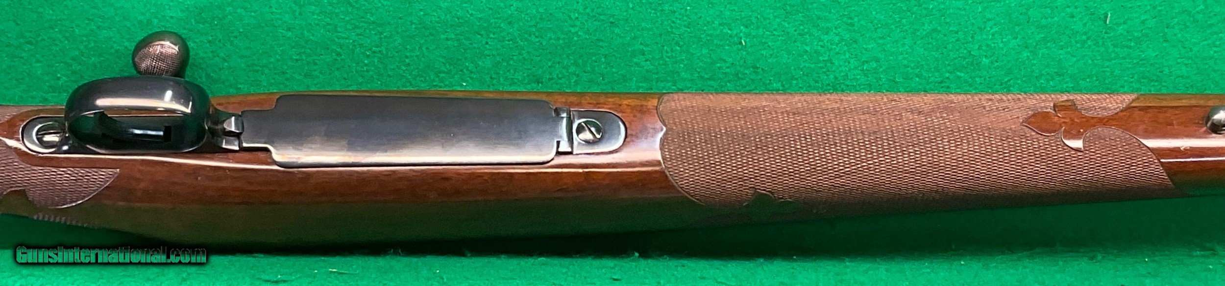 Description: Title doesn't mean much until,you consider the other beautiful rifles I've owned. Griffin & Howe, Champlin Haskins, Holland & Holland and Purdy among others. This 1951 Pre-64 model 70 30-06 custom stocked has some very fine metal features including a pre-war style contoured tang and bolt handle plus checkered bolt knob. Rear sight boss thinned down on the sides. Overall stunning metal work above and beyond the norm. Magnificent walnut stock completes the package, only flaw I find is the top of the recoil pad showing some age .cracks. No way could this be reproduced for twice my price in todays market assuming you could find someone who could do this quality work in your lifetime. $2898 plus $60 insured shipping. Extended layaway available. No credit cards and no trades. C&R ok. SOLD Curio/Relic: Yes |