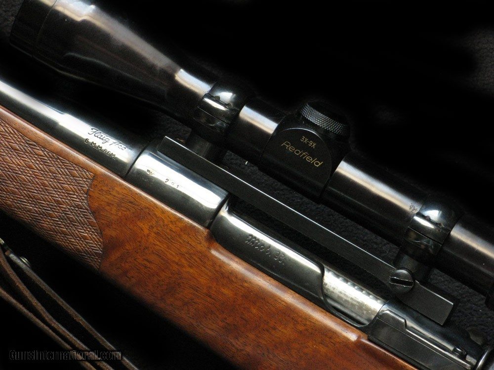 Description: As made probably back in the 70s, this is a best custom rifle by Flaig's of PA in 6mm Rem on a Mauser 98 with scope safety and jeweled bolt. High gloss blue, crisp Jaeger trigger with shoe, contoured trigger bow. Stocked in a nicely figured walnut stock with rosewood tip and diamond inlay grip, hand cut skip line checkering with fancy borders 13.5" lop thru pad. Sporter 10 twist barrel w excellent bore, 25", rear sight d&t blanked, no front sight. With Redfield rings, without scope. SOLD |