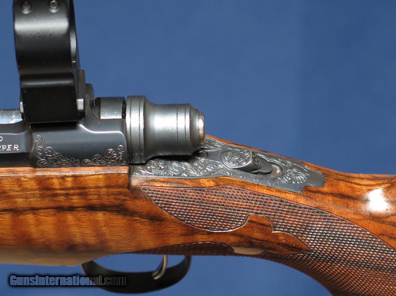 Description: Quaile & Donaldson 22-250 Custom rifle built on small Mauser action. Wood by Frank Wood. Metal engraving by Jerry Harper. 22" barrel. Engraved action and lever. Skeleton metal butt plate. Pistol grip. Left hand cheek piece. Mounts and rings. 98-99%. Excellent bore. SOLD |