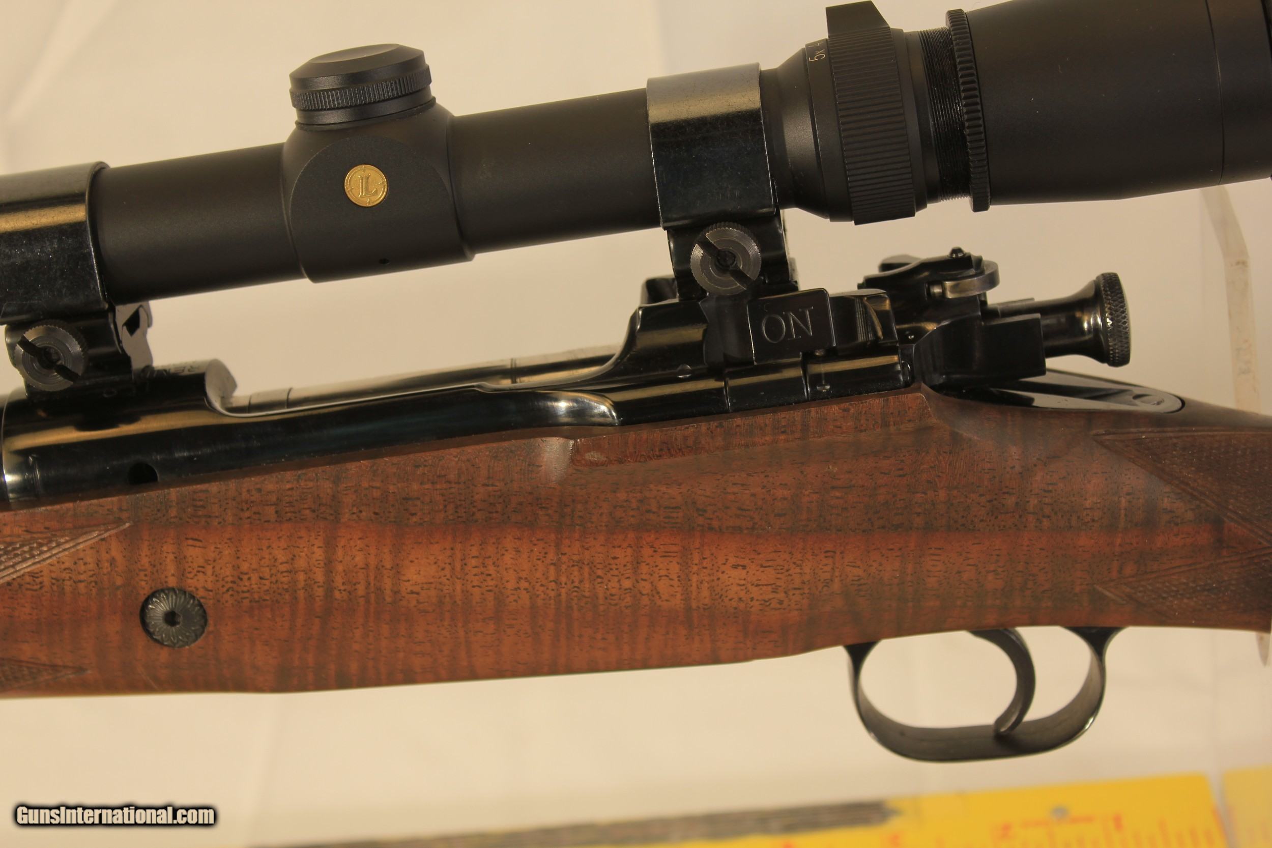 Description: SOLD SOLD SOLD A very well made and designed custom rifle on a Remington 1903 action. It has a commercial barrel and outstanding fiddleback walnut stock that is finely checkered and oil finished. It has a shadow cheek piece, a recoil cross bolt and a two position swing safety. It is equiped with a Leopold 3V 1.5-5X scope. The forearm has wrap around checkering. In todays market the parts for this gun would equal the asking price. This is a bargain price for a gun of this quality. $50.00 shipping via priority Mail SOLD |
