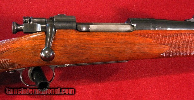 Description: Custom Remington Springfield 03A3 30-06 sporting rifle with a 24" barrel with ramp front sight and island rear sight. Bore is excellent. Receiver is drilled and tapped for scope mounting. Modern style Monte Carlo stock with point pattern checkering. This is nicely figured and appears to be English Walnut. LOP is 14" over a Pachmayr vented pad. Weight is 8lb 2oz SOLD |