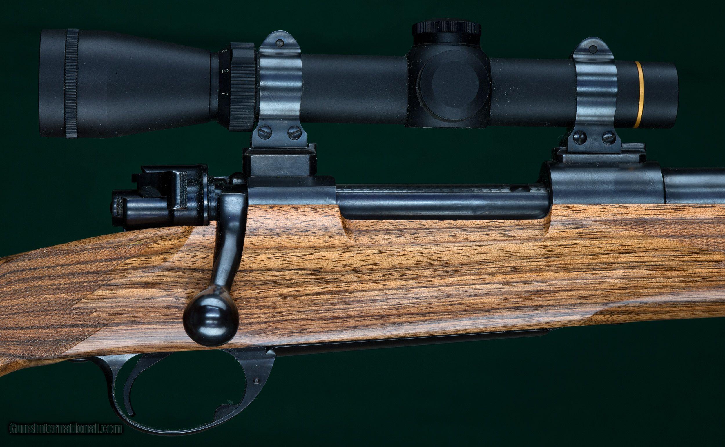Description: 22 1/2" Hobaugh barrel with full-band front sight, full-band swivel base, 1 standing and 1 folding island-mounted express sights. Fully figured European walnut stock with widow's-peaked ebony forend tip, classic point-pattern borderless checkering wrapping fully under the forend and with a separate panel atop the wrist, Fisher steel pistol grip cap, beaded pancake cheekpiece, inletted and pedestalled rear swivel base and thin red Old English recoil pad. Mauser action with jeweled bolt, Blackburn trigger, Model 70-type safety, sculptured bolt stop, and Blackburn bottom metal with hinged straddle floorplate and release inside triggerguard. Leupold VX II 1 - 4x20 matte-finish scope with fine duplex reticle on Talley quick-detachable mounts. Pull: 13 3/4". Weight: 8lbs, 5oz. New condition. SOLD |
