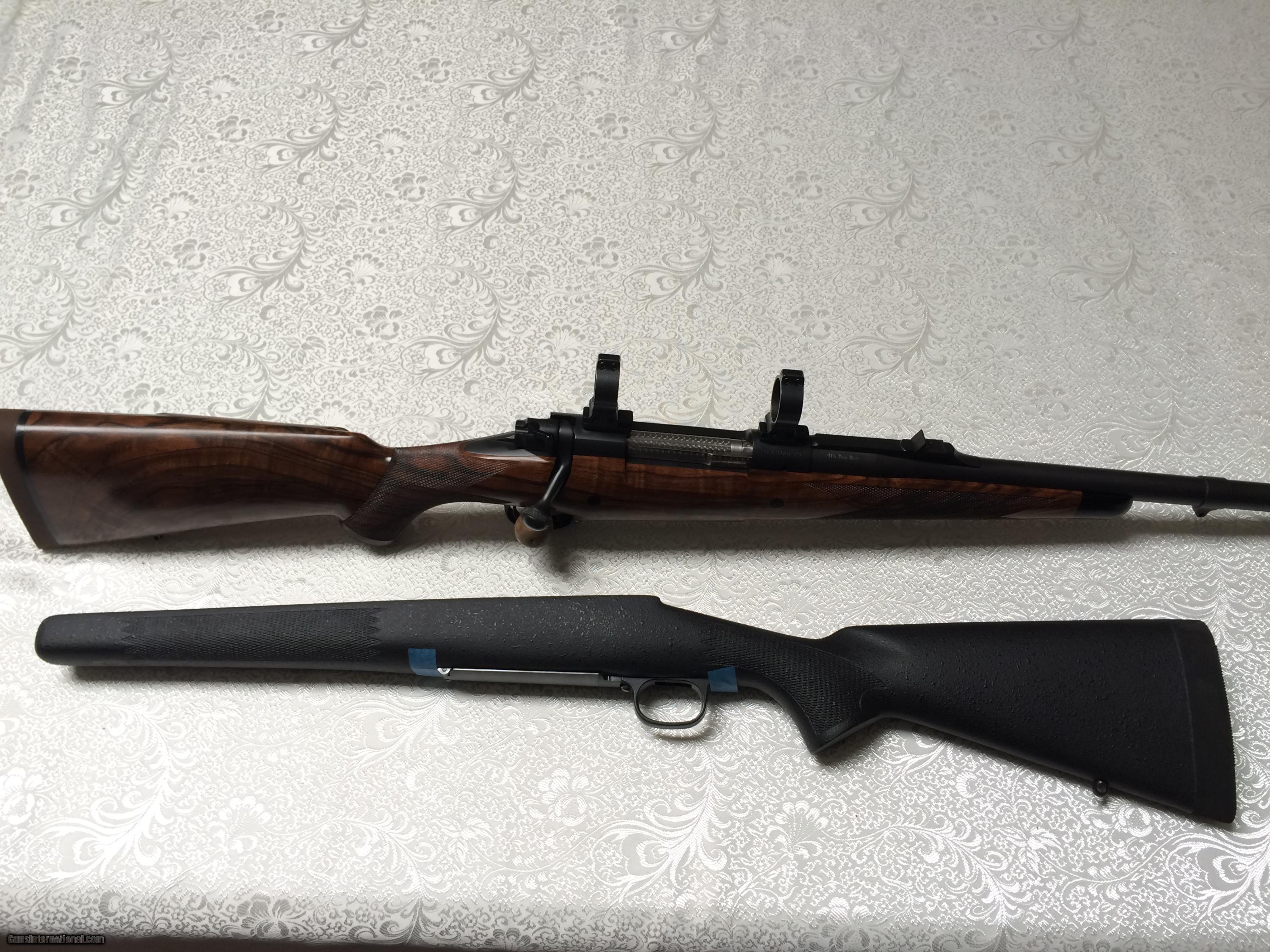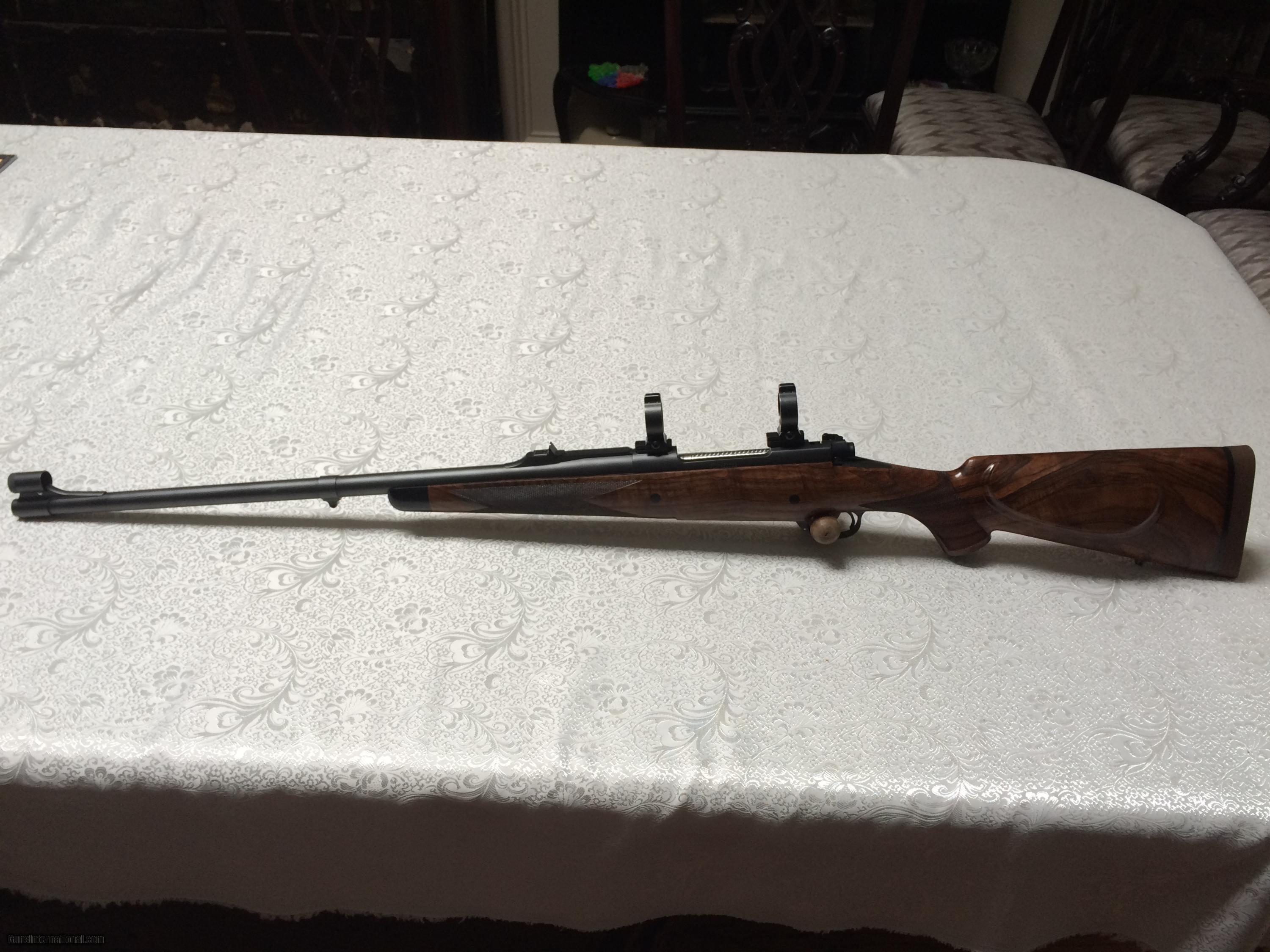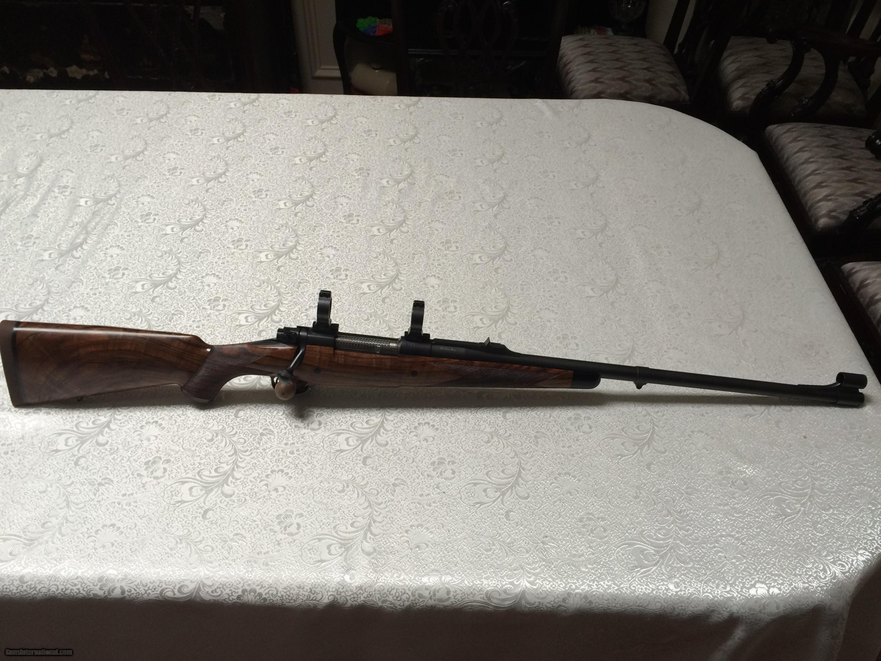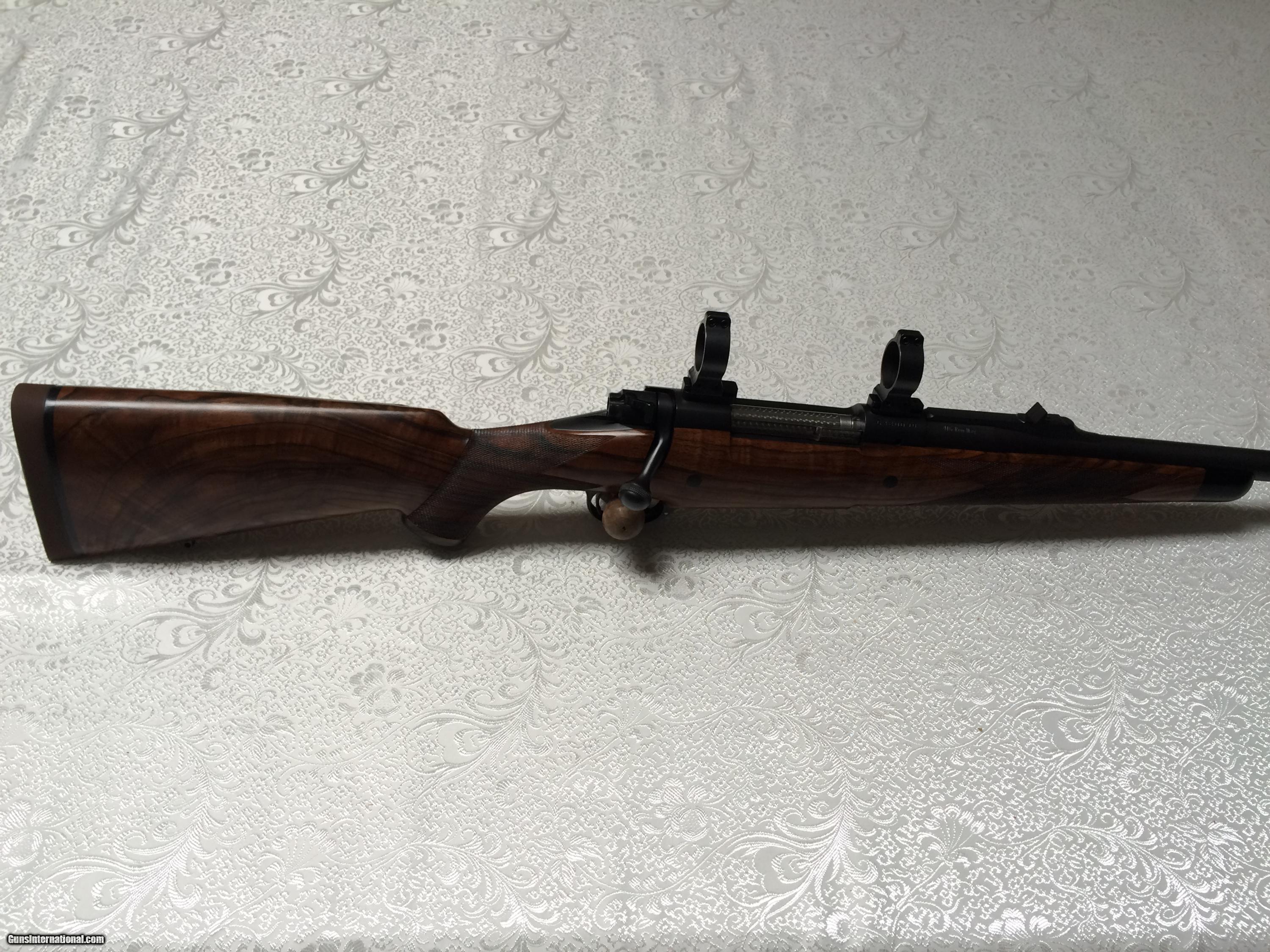 Description: Sterling Davenport 416 Remington built on a Winchester Classic Pre-64 style action. 24” round tapered barrel with banded sling eye. Custom bottom metal with hinged straddle floorplate and release inside triggerguard. Additional options include quarter rib, push button release on barrel band, hooded front sight with a jeweled bolt and follower. Talley mounts with 30mm quick detachable rings. Also included is a McMillian composite stock with its own bottom metal fitted by Sterling Devenport to the barreled action. Ships FFL to FFL. $4,750 SOLD |