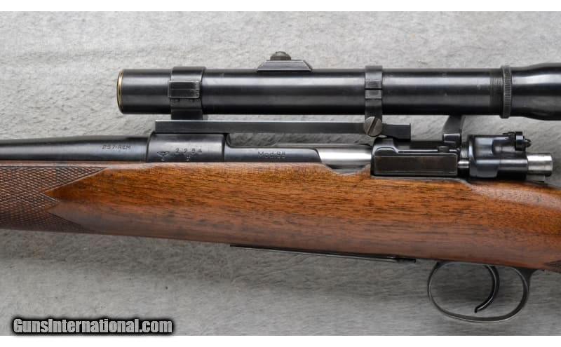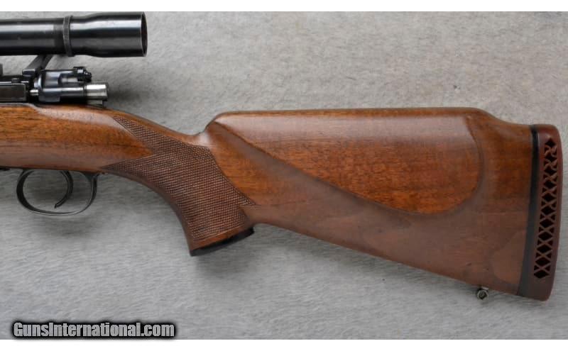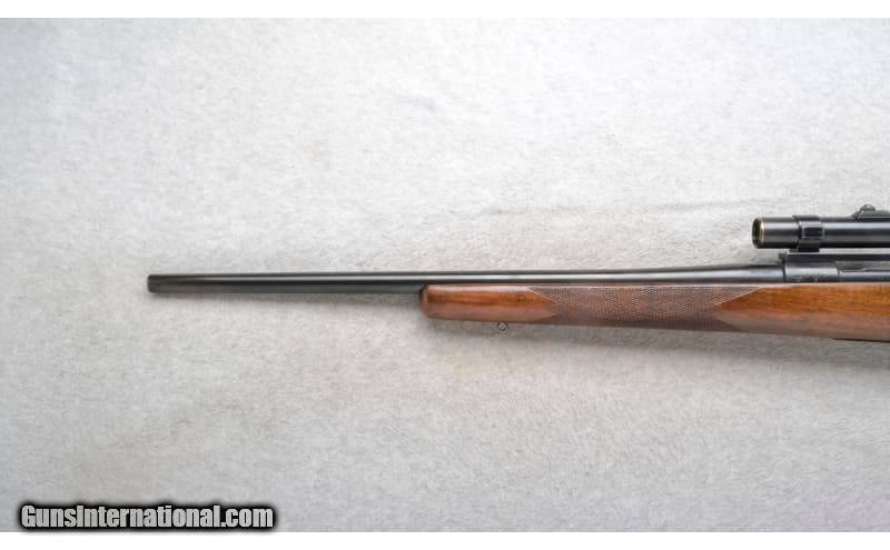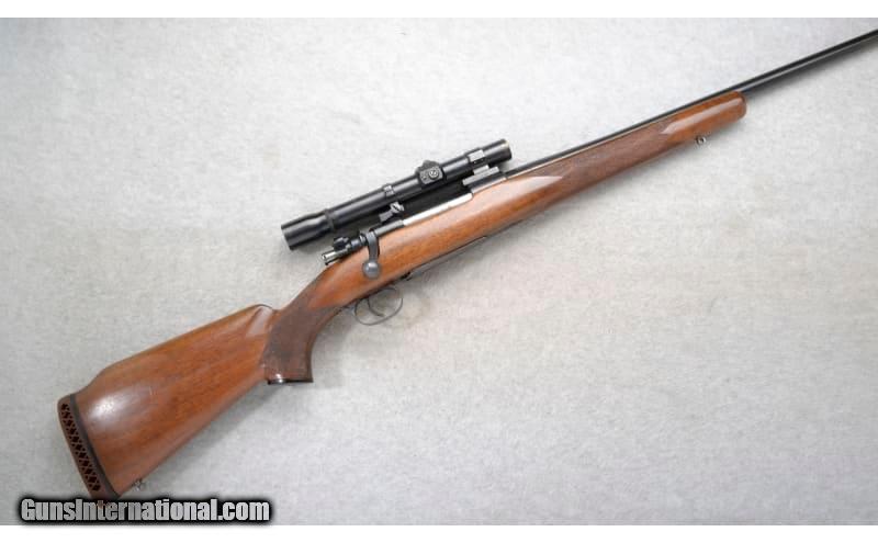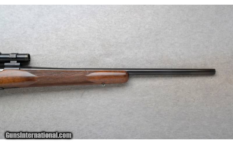 Description: This W.A. Sukalle Model 98 is a right hand bolt action rifle in .257 Rem. Cal. It has a 22 inch barrel. It is outfitted with a Weaver Scope. The butt stock is a checkered grip walnut pistol grip with a raised cheekpiece and black cap. The forearm is a checkered grip walnut. Serial Number 2254. SOLD Chambers: Internal magazine. Metal Condition: Good. A little very minor freckling and minor handling marks. Wood Condition: Good. Light handling marks. Bore Condition: Excellent. Barrels: 22 inch. Stock Dimensions: LOP 13 1/2 inches. Fore End: Checkered grip walnut. Butt Pad: Pachmayr rubber recoil pad. Weight: 8 lb. 8 Oz. Sights: Weaver K 2.5 Scope. Item Location: Richfield, WI |