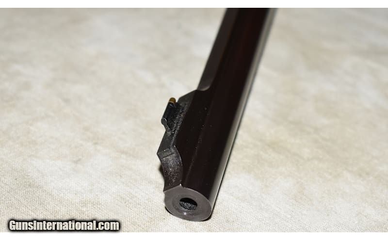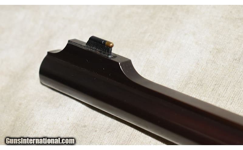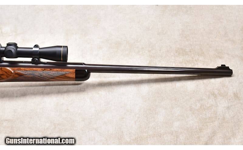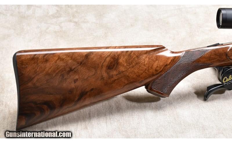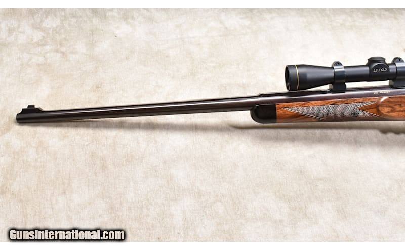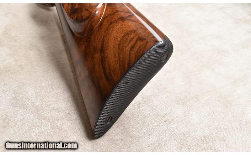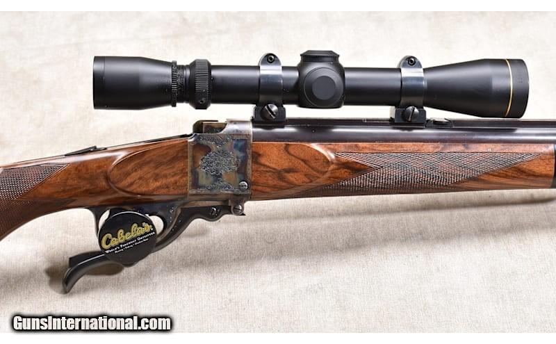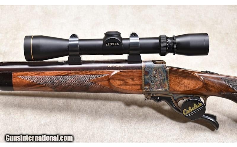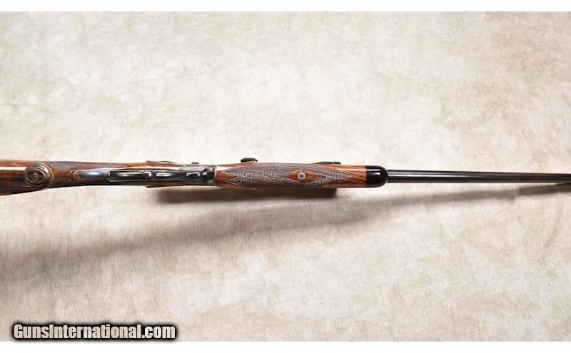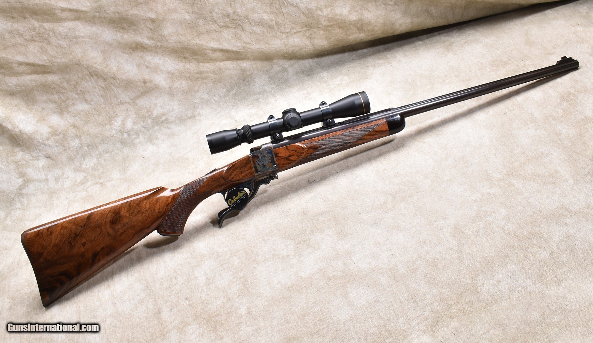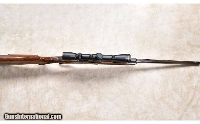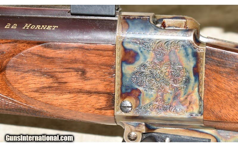Description: This little falling block rifle carries on the tradition of the stalker rifle with very light weight, and tiny. The wood is presentation grade with striking grain and a lot of figure. It has a black tip cap, case colored steel grip cap, and cheek piece. The receiver and trigger group parts are case colored, and engraved with Acanthus scroll work. .22 Hornet SOLD Chambers: Single shot Metal Condition: Excellent. Wood Condition: Very good to excellent. There are a few minor handling marks. Bore Condition: Shiny and bright with good rifling. Barrels: 24 inches Triggers: Factory trigger Stock Dimensions: LOP: 13-1/4 inches Fore End: Matching high grade walnut with a lot of figure. Butt Pad: Checkered steel plate. Weight: 7 lb - 4 oz Sights: Gold bead and folding leaf open sights. Set up for scope and outfitted with a Leupold VARI-X 3-9x COMPACT scope Item Location: Rogers |