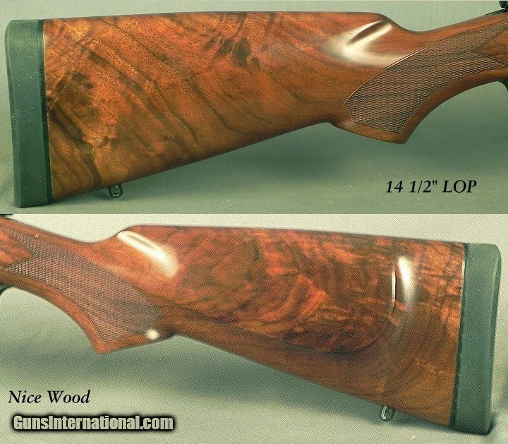 Description: #B091305, CZ (Ceska Zbrojovka) 375 H&H CZ 550 Safari Classics Custom Grade Magnum Double Square Bridge Length Action, Mauser style controlled round feed claw extractor, Flat top receiver ring and bridge with dovetail cuts for Talley, Warne or factory CZ scope rings; 25" hammer forged barrel, Integral Machined Island rear sight base with 1 standing & 2 folding white lined sight blades, Barrel band sling eye, Not the sling eye on the stock like many of these CZ 550's, Band front ramp, Adjustable set trigger that pushes forward to set, Straddle hinged floorplate with a frontal guard release, Double crossbolts at the action body, Barrel tiedown on the forend, Glass bedded at the recoil lug, Upgraded wood, Cheekpiece, Point pattern checkering, Double cross bolts, Forend tiedown lug, Glass bedded, 14 1/2" lop over a 1" pad, 10 lbs. 12 oz., The original blue remains at 99%, The stock with original finish remains at 98% and the checkering at 100%. The bore is new. This is a very accurate rifle. Rifle Caliber: .375 H&H Magnum Price: $4,900.00 Contact Seller |