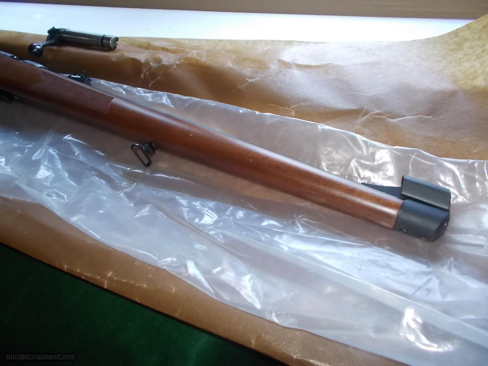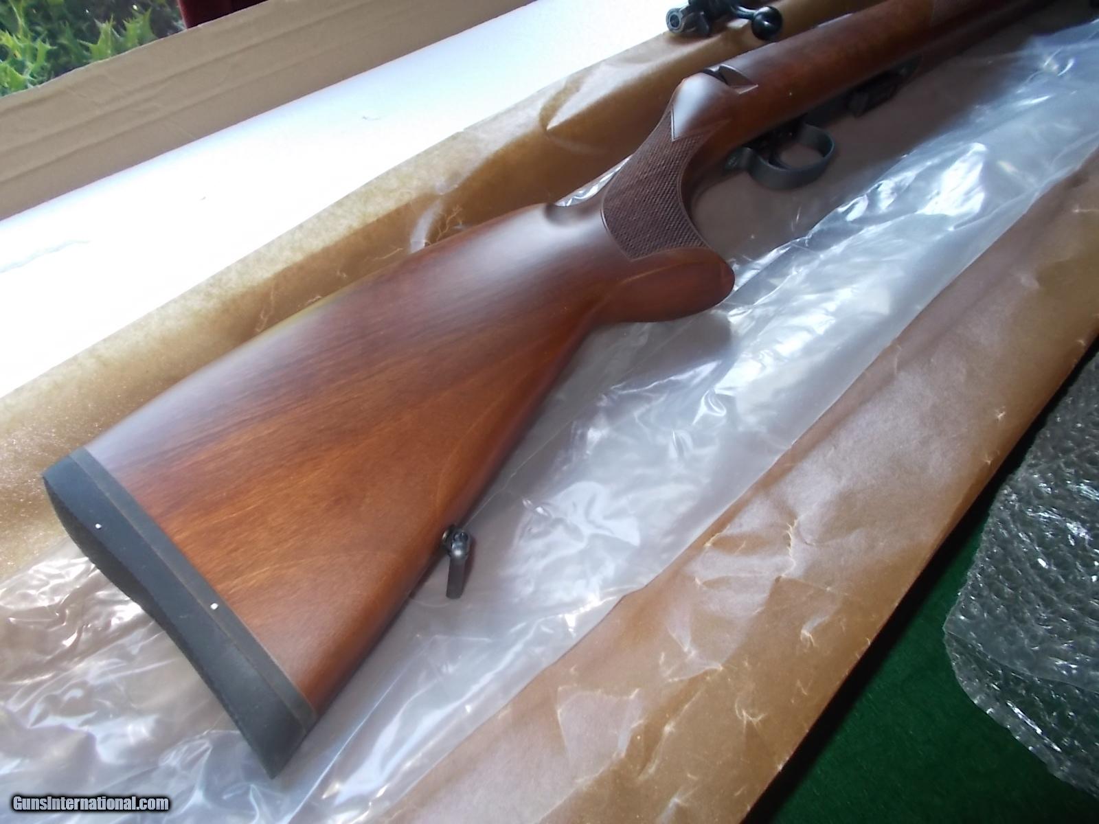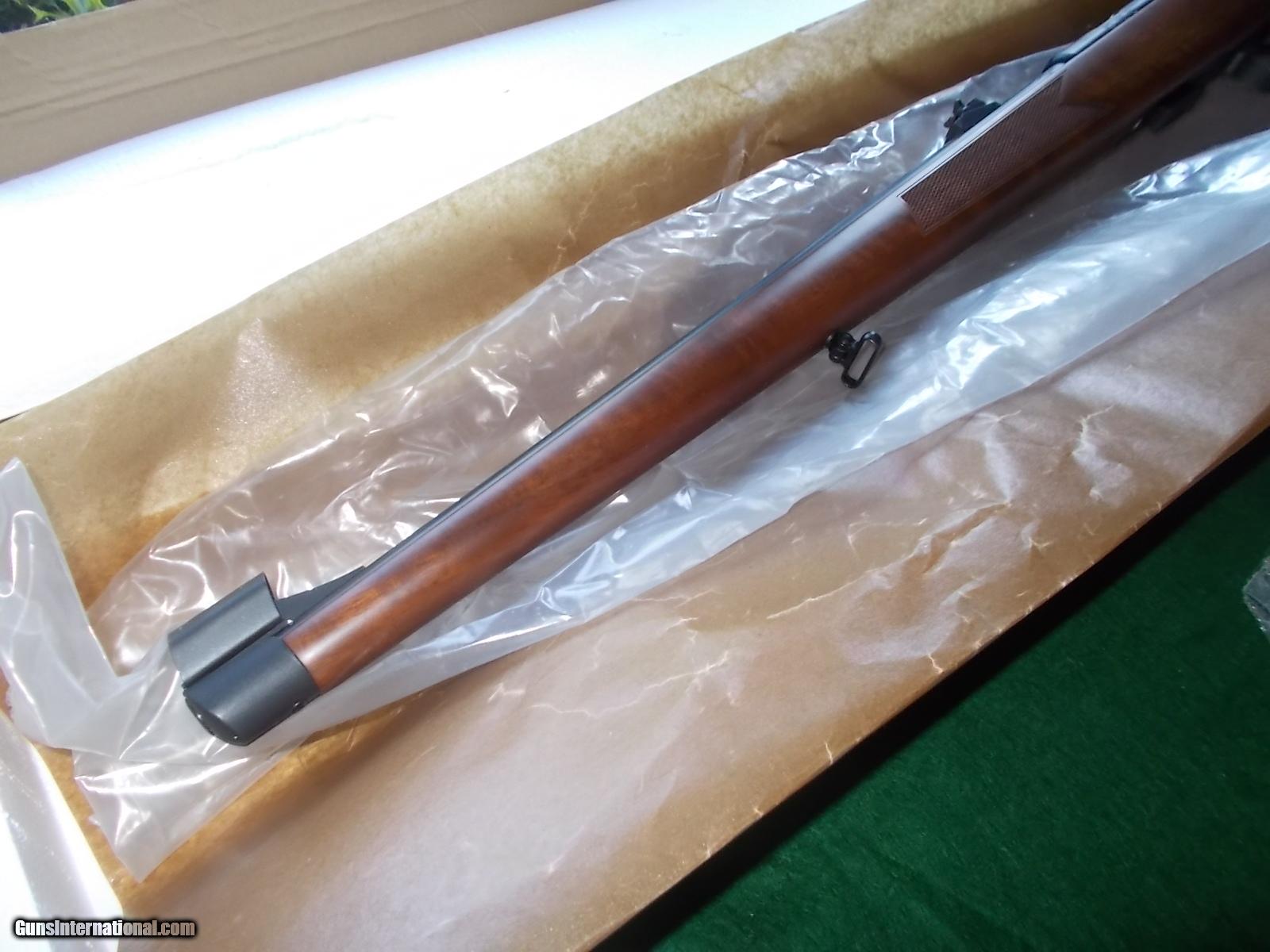 Description: 21" full stock bbl. with full length Mannlicher checked deluxe walnut srock end bbl. band, hooded front blade sight, tangent rear adjustable sight, 5 shot detatchable mag. unfired in box w/paperwork: SOLD |