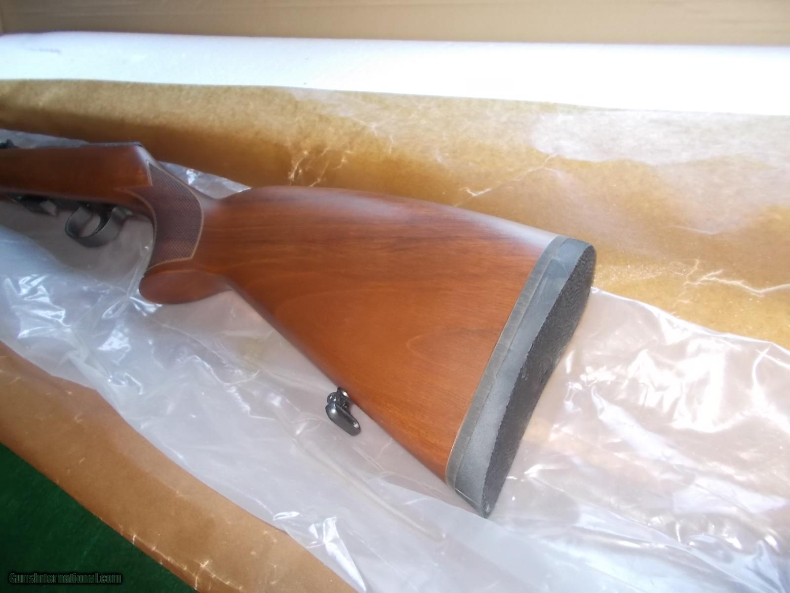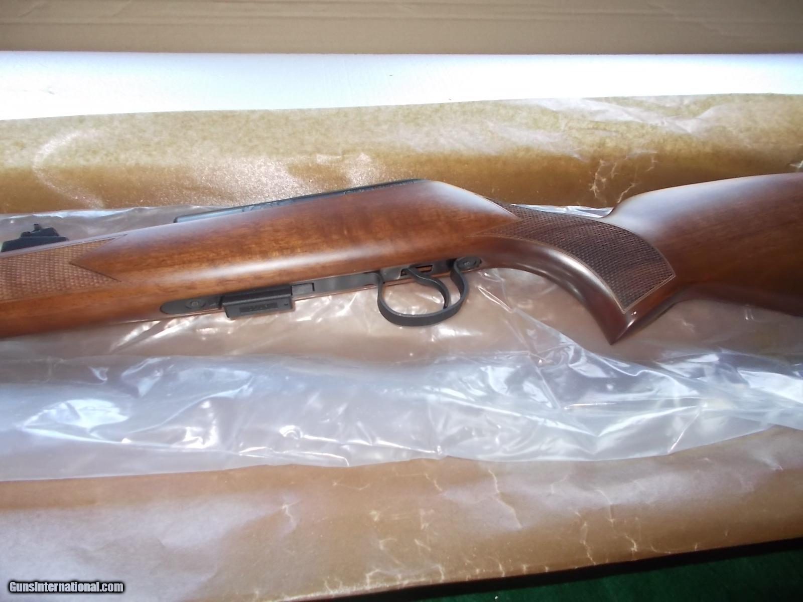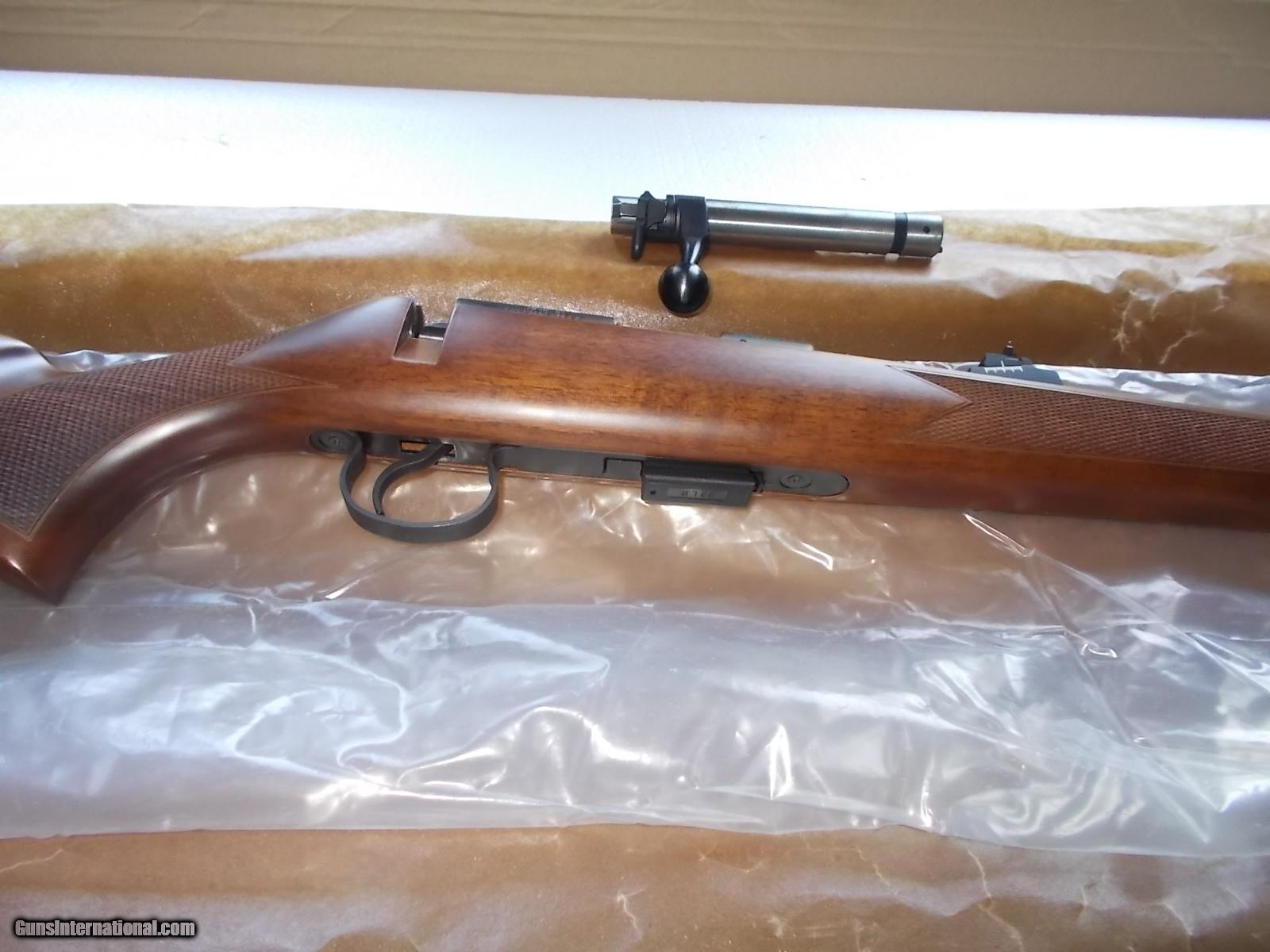 Description: 21" full stock bbl. with full length Mannlicher checked deluxe walnut srock end bbl. band, hooded front blade sight, tangent rear adjustable sight, 5 shot detatchable mag. unfired in box w/paperwork: SOLD |