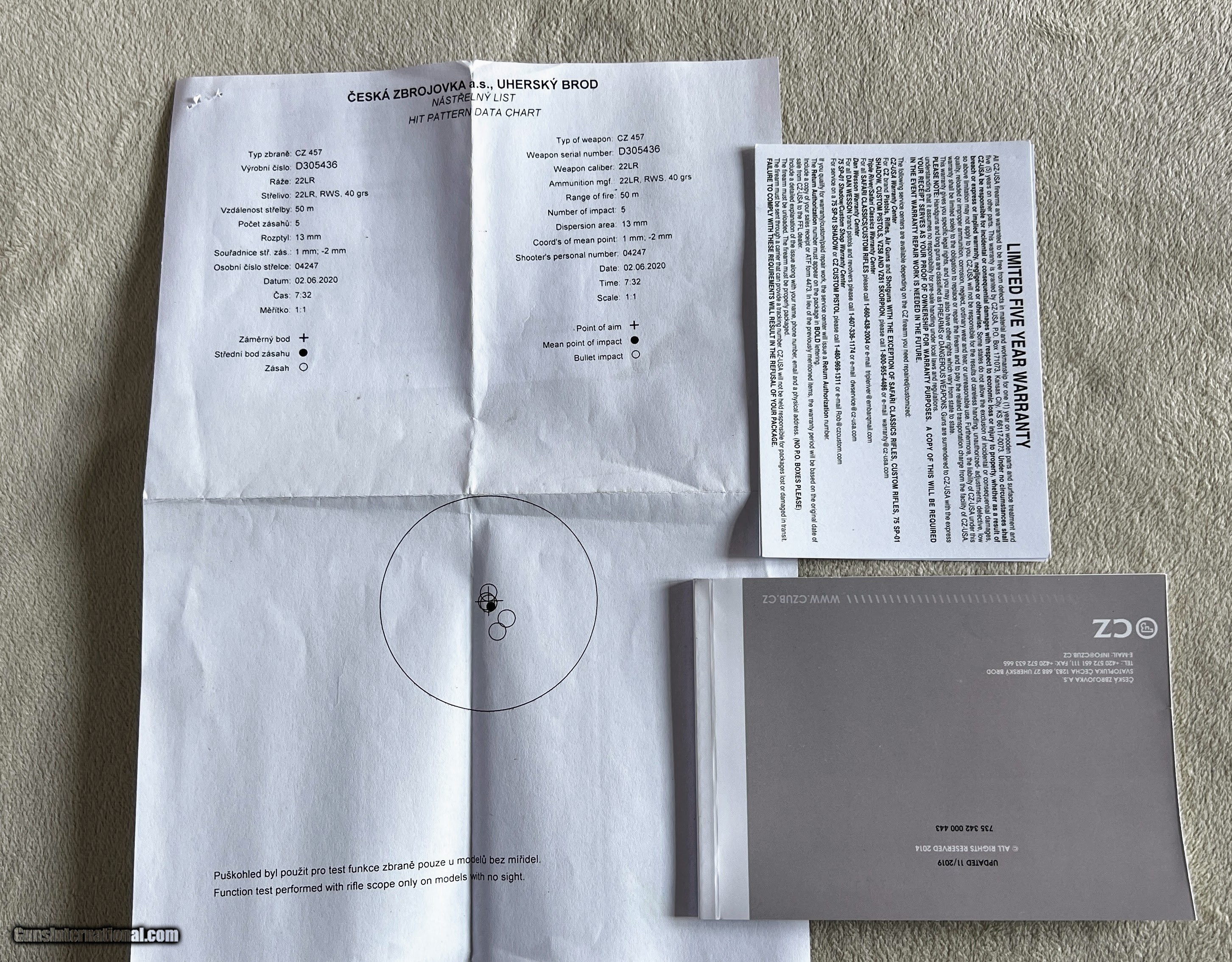 Description: CZ 457 Varmint / Precision 22 target rifle set up ready to shoot with 16.5" target threaded barrel. I have not fired this gun nor do I have the history. Please see all the high quality phots to determine condition for yourself. It is being sold "As Is" with a 3 day, no fire, no disassembly return condition. Please ask any questions before purchasing. Let me know if you require additional photos. I will consider trades on high end rimfires (Cooper, Kimber or Anschutz). Sold only where legal to own and you are expected to know your local laws. Price listed represents a 3 1/2% discount for cash. Credit cards are available, but you must call me to use. Shipping will be $55 to the lower 47 (no shipping to CA). Insurance is not included but is highly recommended. The gun is available for sale locally and if there are no offers, I reserve the right to end the sale early. Thanks for looking. SOLD Rifle Caliber: .22 Long Rifle Manufacturer: CZ Model: 457 Barrel Length: 16.5 Bore: Excellent Condition: Excellent Metal Condition: Excellent Wood Condition: Excellent Bore Condition: Excellent Barrels: Blued Barrel Type: Target Action: Bolt Triggers: Adjustable Stock: Synthetic |
