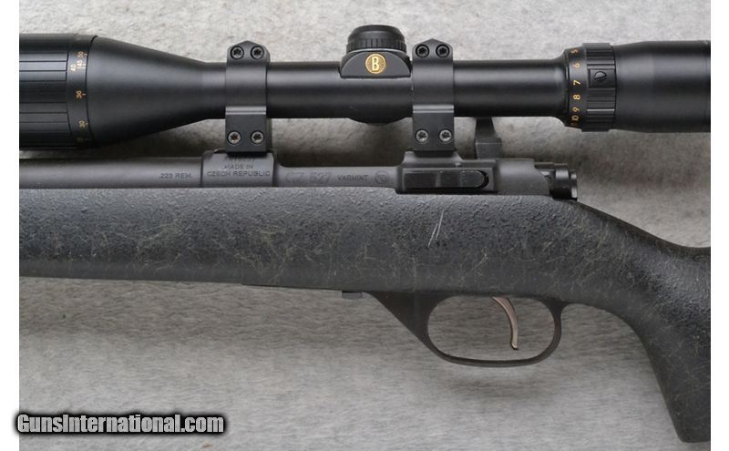 Description: This CZ Model 527 Varmint is a right hand bolt action rifle in .223 Rem. Cal. It has a 24 inch barrel. It is outfitted with a Bushnell Elite 3200 Scope. No iron sights. The butt stock is a textured grip black polymer pistol grip with a dark green webbing. The forearm is a textured grip black polymer with a dark green webbing. .223 Remington SOLD Chambers: Detachable magazine. Metal Condition: Excellent with a couple of minor use marks. Bore Condition: Excellent. Barrels: 24 inch. Stock Dimensions: LOP 13 1/2 inches. Fore End: Textured grip black polymer with dark green webbing. Butt Pad: Decelerator black rubber recoil pad. Weight: 9 lb. 2 oz. Sights: Bushnell Elite 3200 4-12x40 Scope. No iron sights. Item Location: Richfield, WI |
