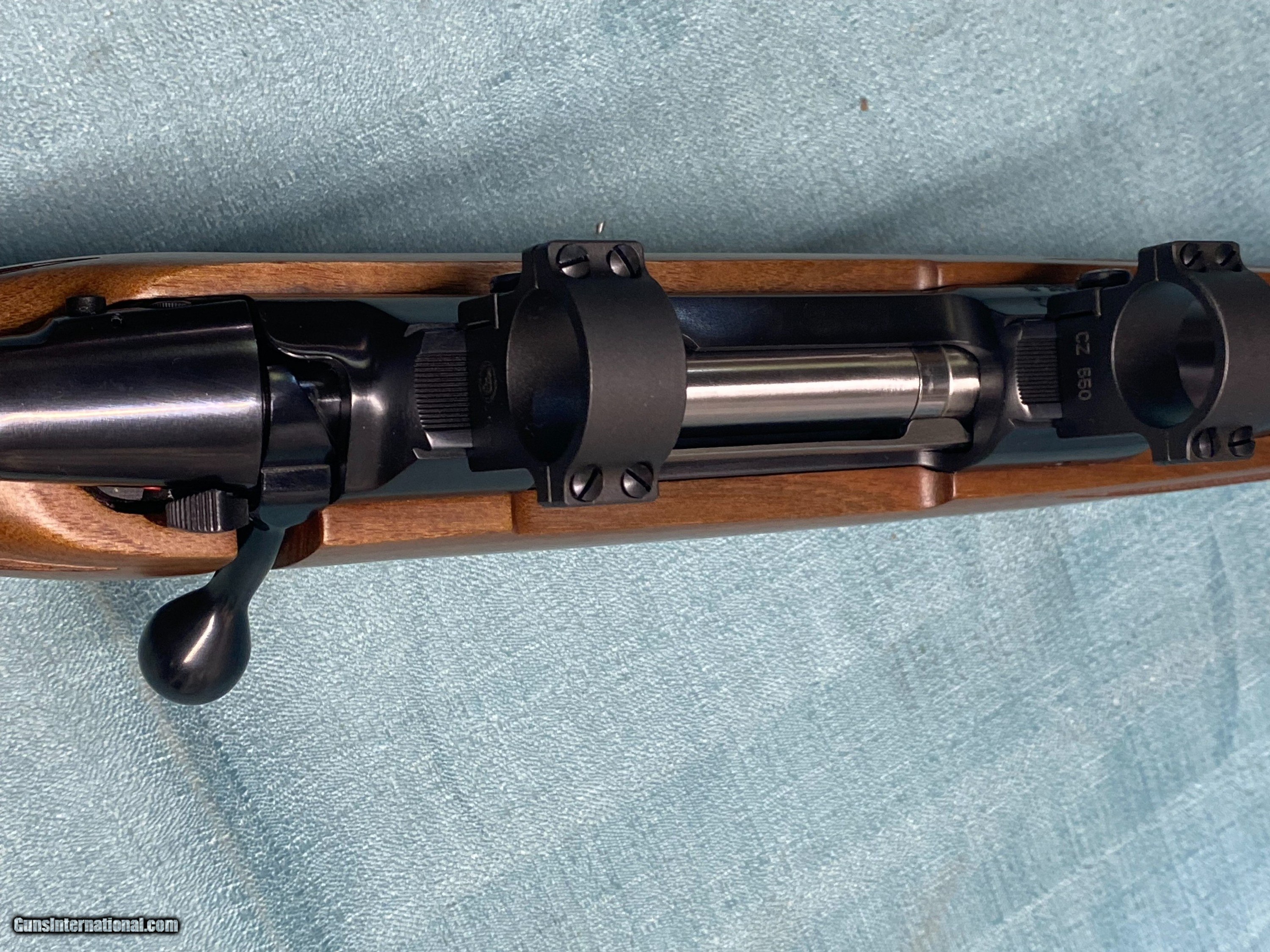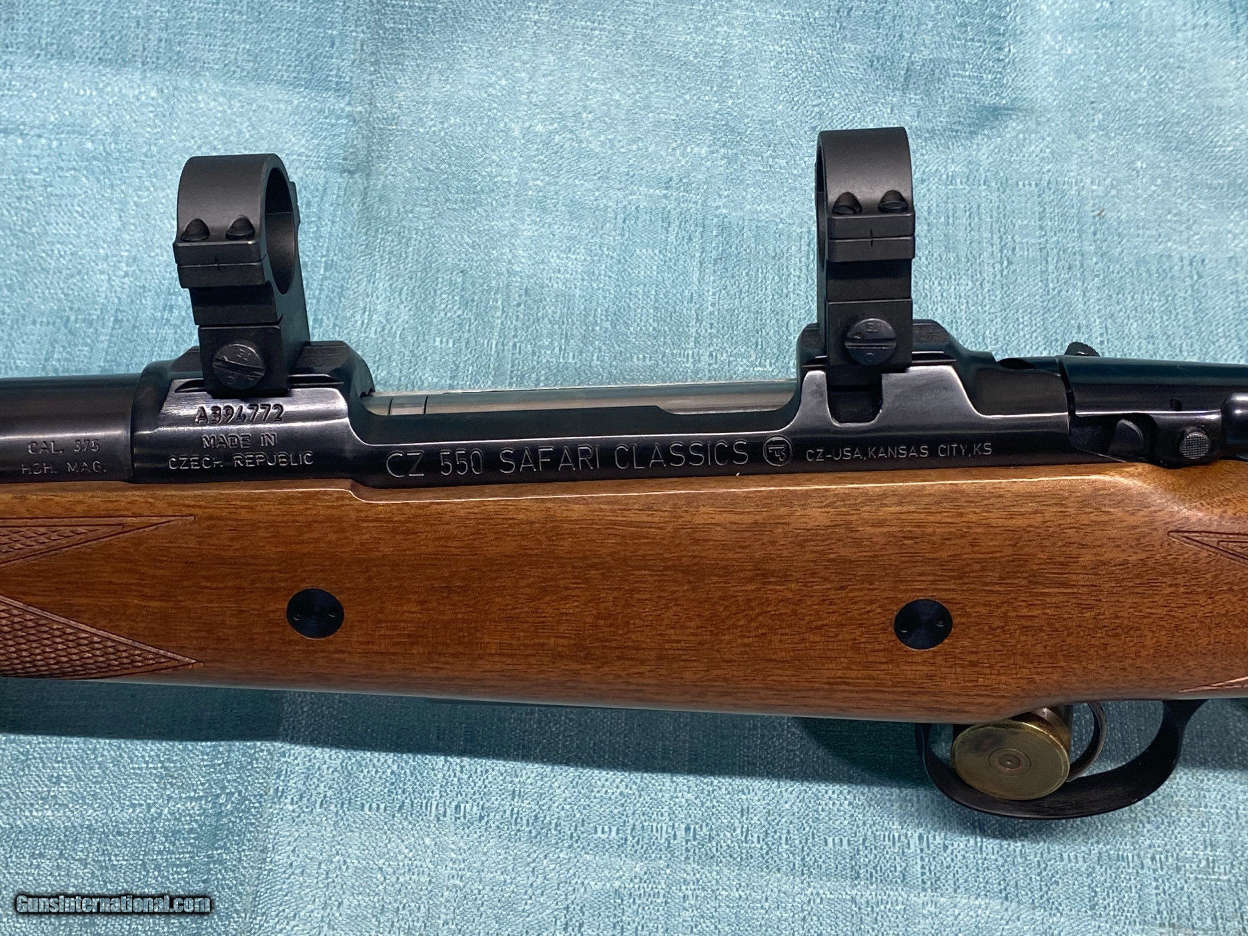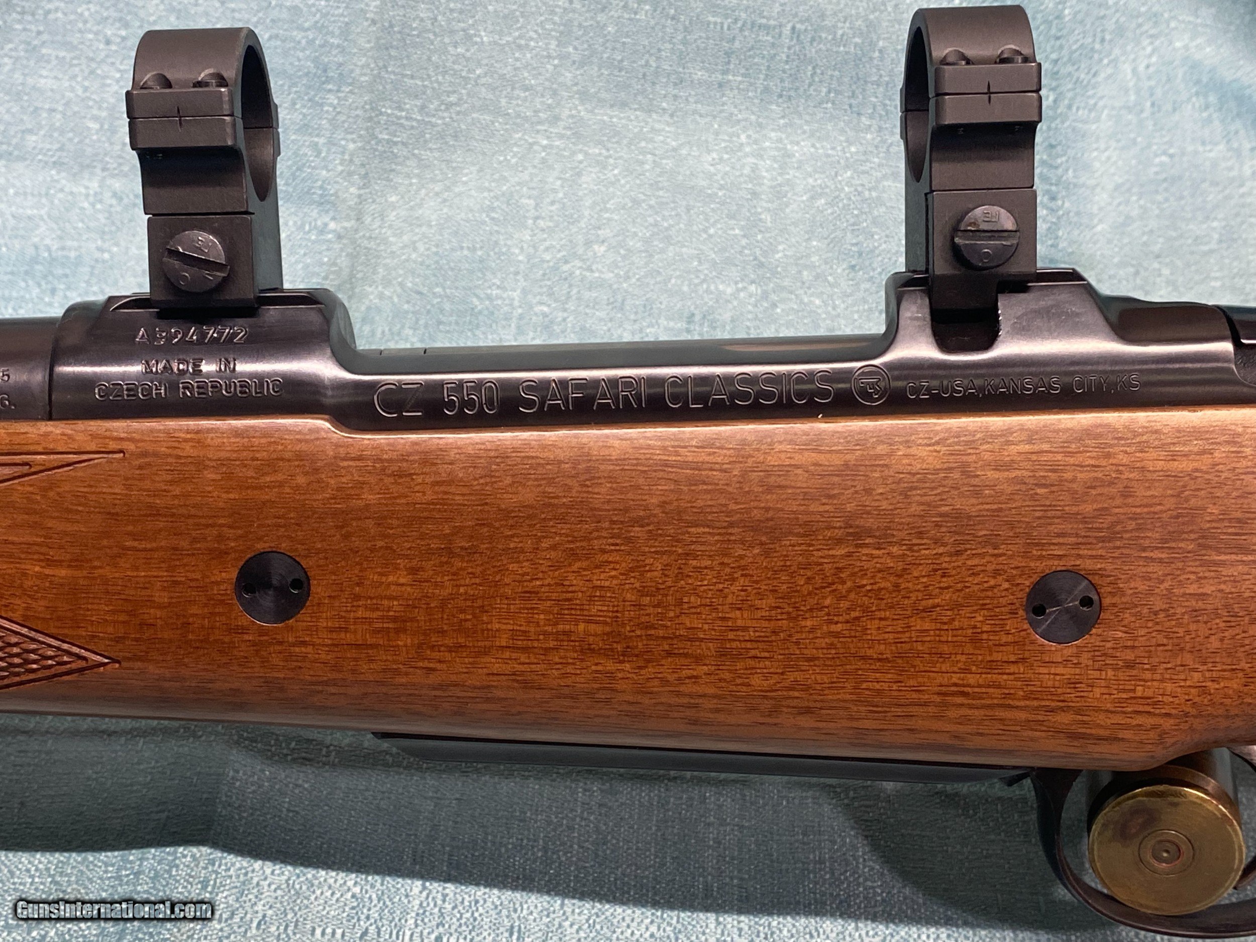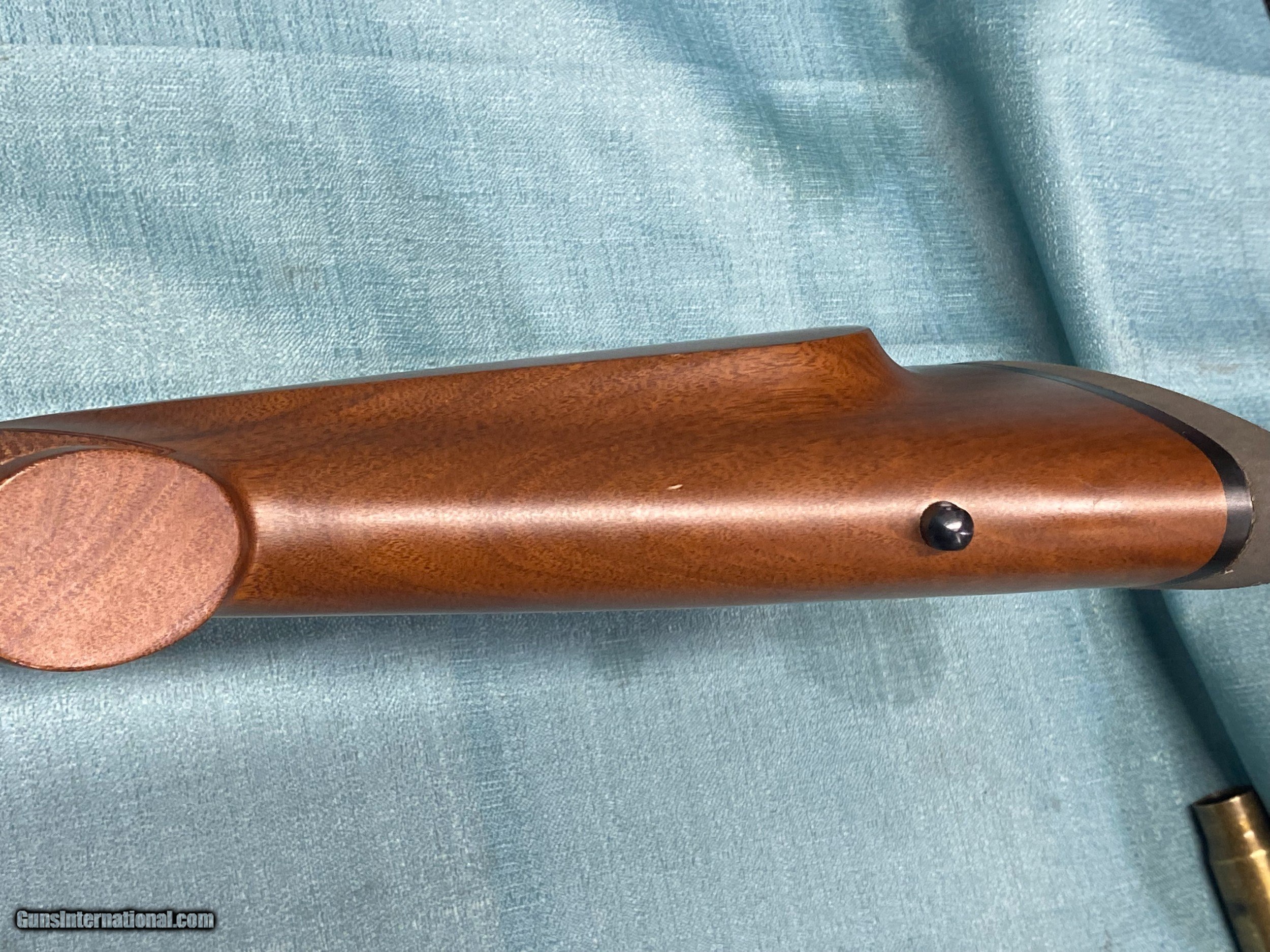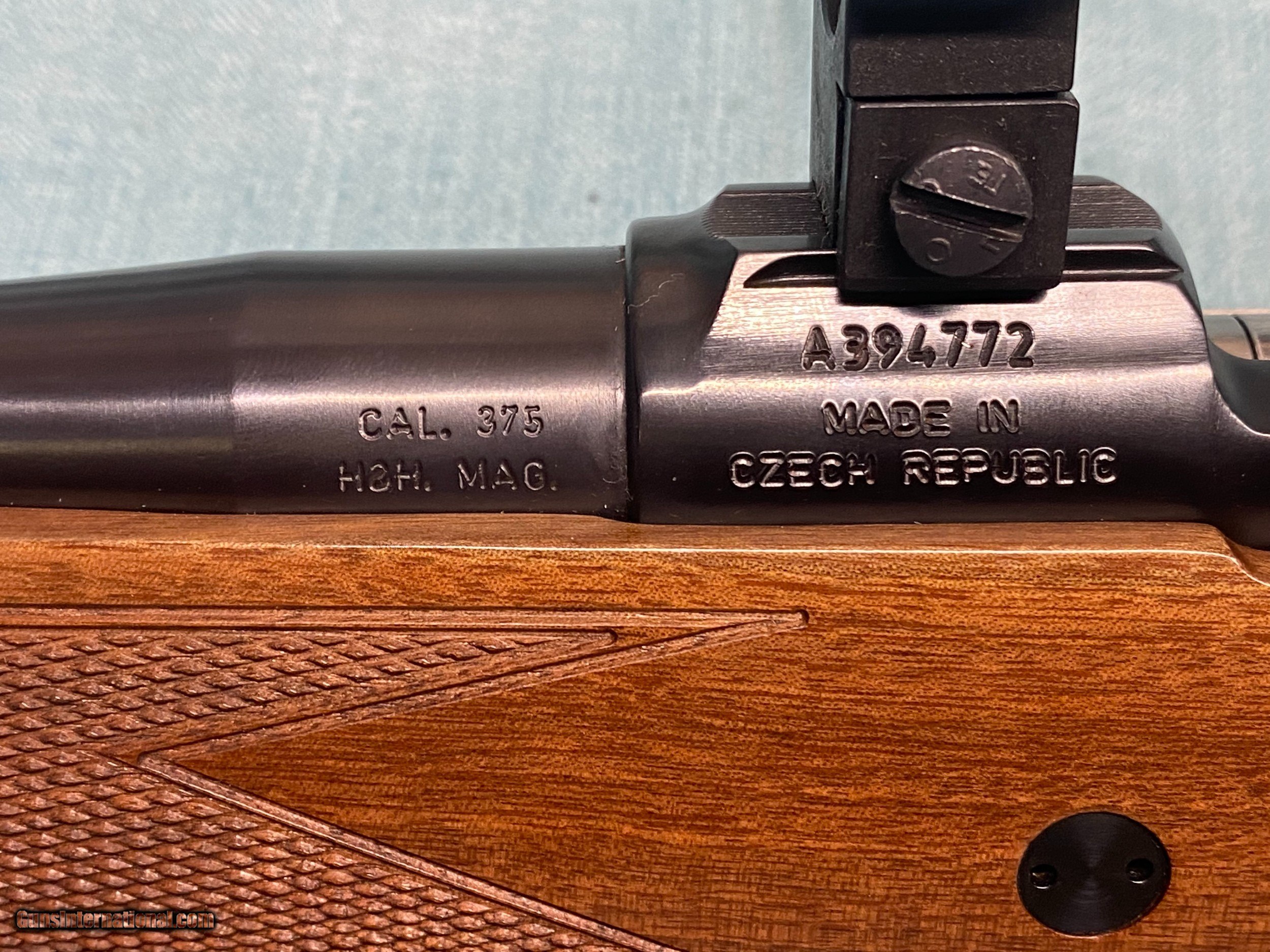 Description: This is a like New CZ 550 Safari Classics chambered in 375 H&H. This rifle is in almost new condition. it has one small ding I found on the bottom of the butt stock other than that it is in pristine condition. It has the express flip up rear sights marked at 100, 200, and 300 yds. IT has a dual reinforcing crossbolts in the stock to withstand the increased recoil of the 375 H&H magnum round. This rifle has very clean lines. Maine Residents add 5.5% sales tax Add 35.00 Shipping and Handling Price reflects a 3.5% Cash discount (This discount is voided if a credit card is used.) Credit card, Check, or Money order accepted SOLD Rifle Caliber: .375 H&H Magnum Manufacturer: CZ Model: 550 Safari Clasics Serial Number: A394772 Barrel Length: 25 Condition: Like New Metal Condition: Like New Wood Condition: Like New one very small ding under butt stock Bore Condition: Like New Action: Bolt Control Round feeding Weight: 10 lb Extras: Express Sights, CZ Scope Rings Item Location: Buxton Maine |