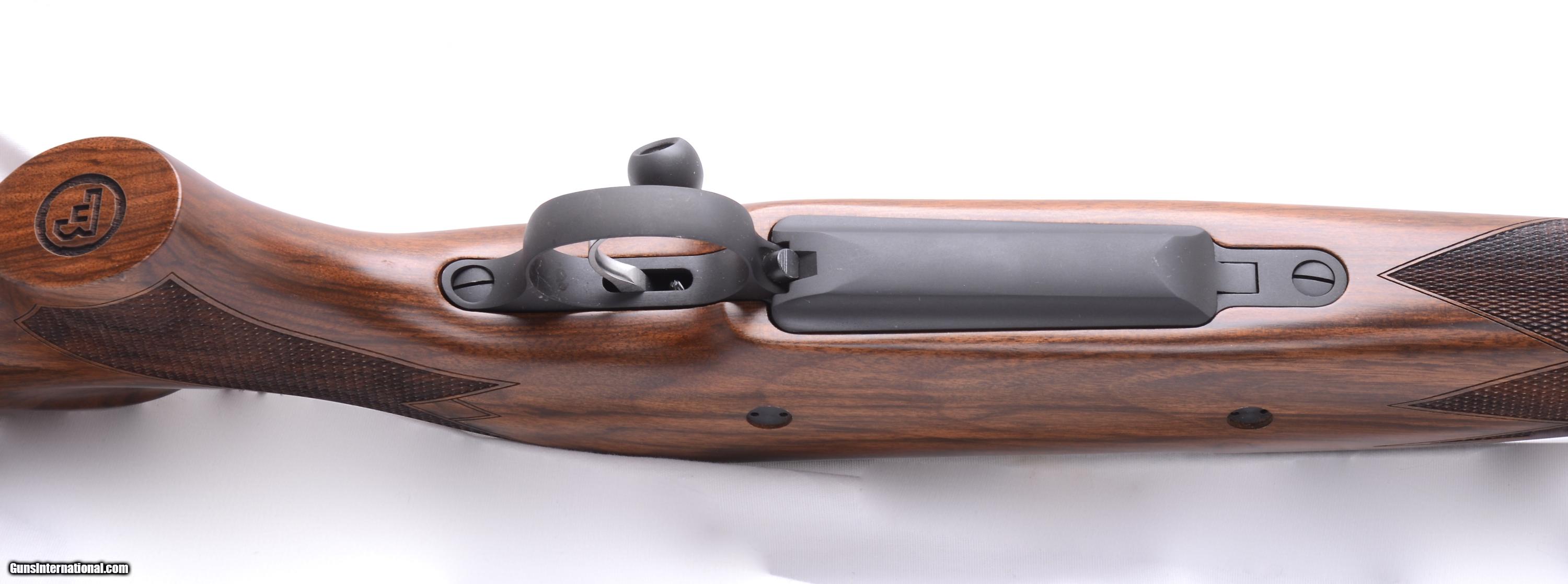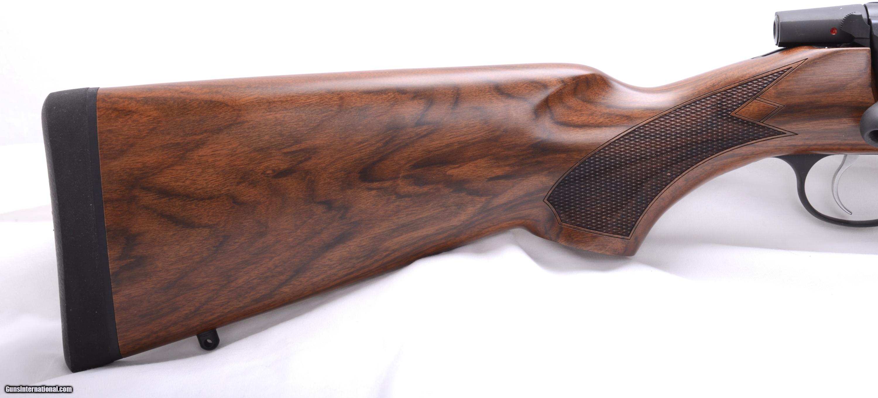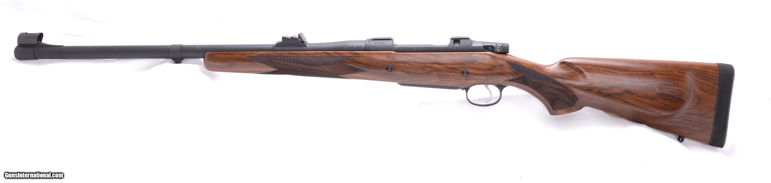 Description: CZ550 Safari Classics PH Magnum chambered for the .550 Magnum. This rifle was a custom make-up for the 2016 Safari Club International Show and does a great job of “showing off” the flexibility and creativity of the crew at CZ USA. Starting with the fantastic, highly regarded, double square bridge CZ 550 Mauser action and add a number of custom features: Machined sight boss with one standing and two folding express sights, custom matte blue finish, installed recoil reducer in the matte finished high grade walnut stock with cheek piece, barrel band sling swivel on the 23” barrel, cross bolts and “steel” bed, relieved action and extended mag box. This rifle is 44” overall length, 14 ¼” LOP over a 1” Pachmayr decelerator presentation pad. The trigger breaks sharply at just over 3 lbs. and just under 2 lbs. using the single set trigger. Overall weight is 9 lbs. 8 oz. with recoil reducer installed. New in box. Retail $4299.00 Special $3570.59 SN: B096391 SOLD |