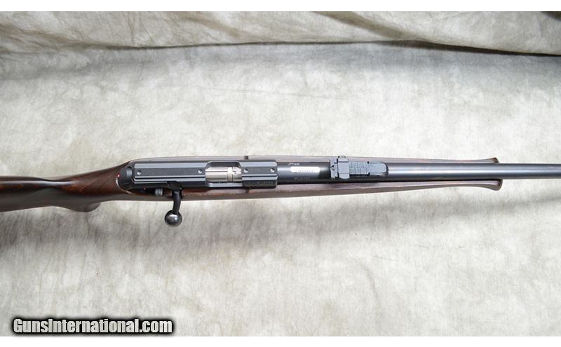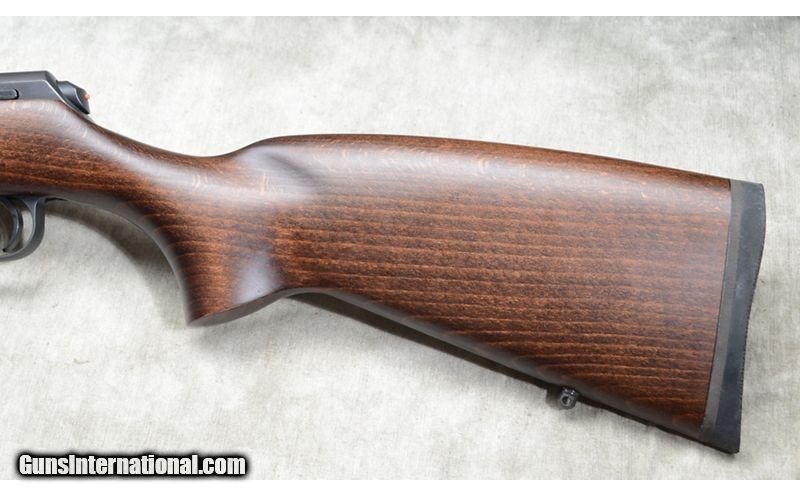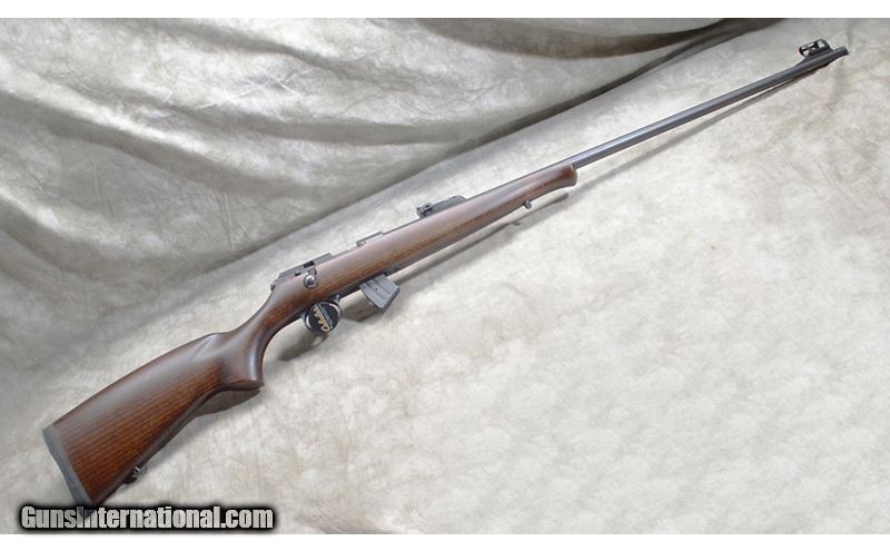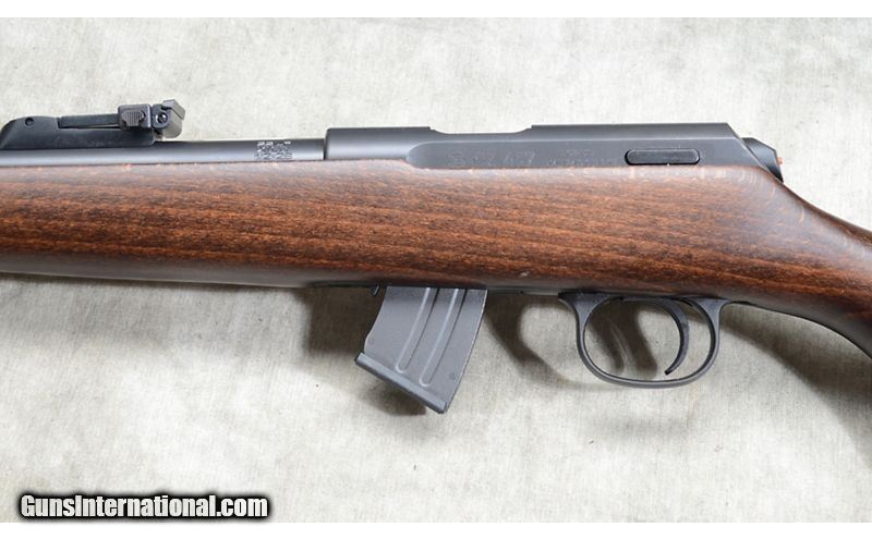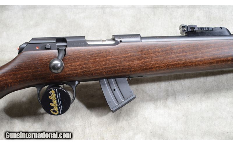 Description: Good rifle for field or target with a 28-1/2 threaded barrel, iron sight calibrated to 200 meters, The stock is darkly stained hardwood with Bavarian style comb. The blemish appears to be some variation in the blue on the barrel. It comes with factory mechanical warranty. .22 Long Rifle SOLD Chambers: 10-round detachable magazine Metal Condition: LNIB. Wood Condition: LNIB. Bore Condition: LNIB. Barrels: 28-1/2 inch Triggers: "Factory trigger, adjustable. Stock Dimensions: 14 inch LOP. Fore End: Schanbel. Butt Pad: Soft rubber pad. Weight: 6 lb - 15 oz Sights: Hooded fiberoptic bead and ladder style notch "iron" sights. Grooved for scope. Item Location: Rogers |