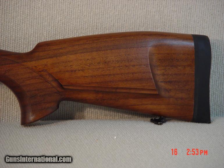 The gloss blue barrel and receiver are mounted on a beautiful European walnut stock which features a Bavarian cheek-piece with shadow-line, a semi-Schnaubel forearm and a flared pistol grip. Multi-point checkering with swirl dividers covers the front and rear grip surfaces.