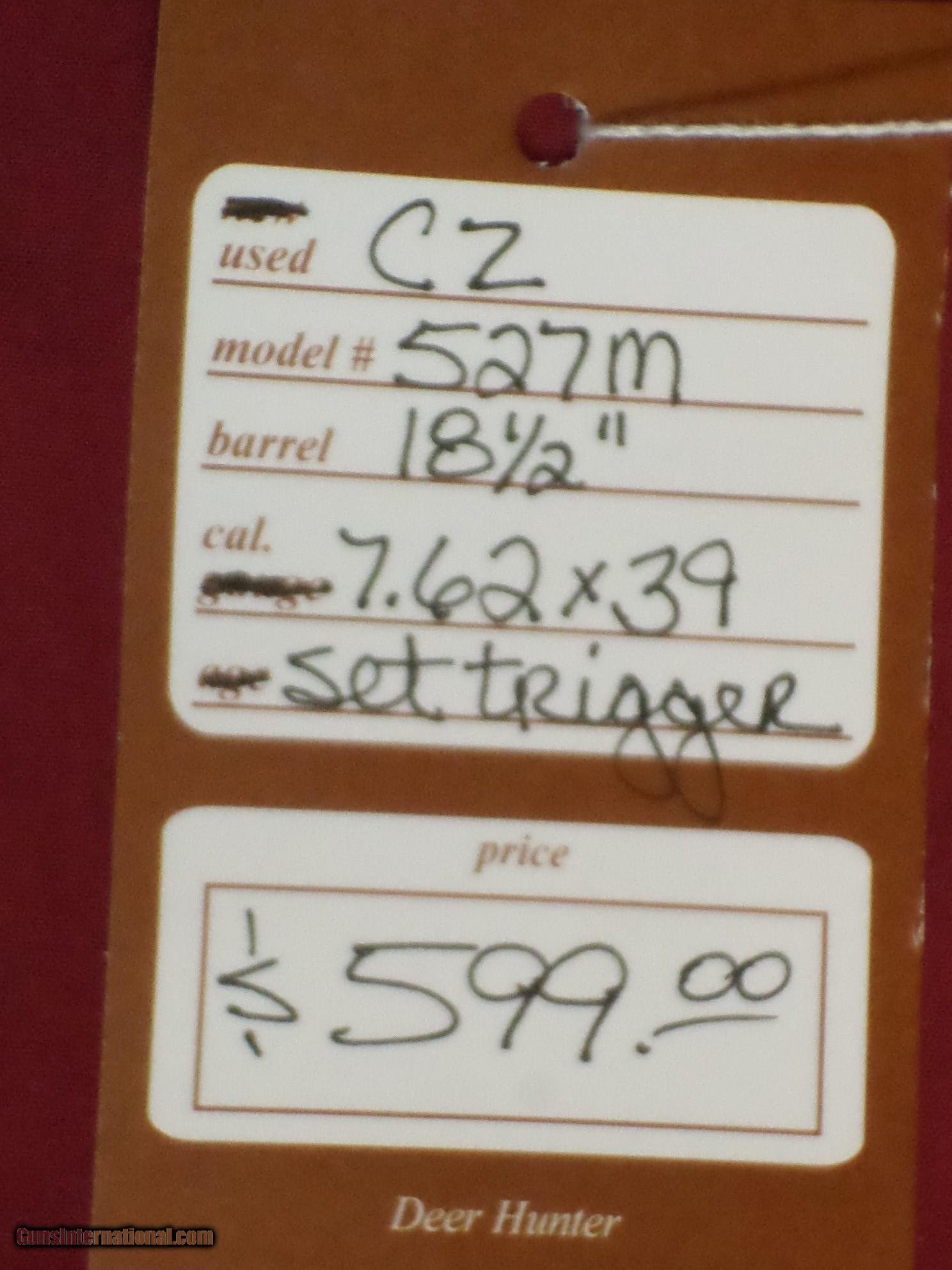 Description: SOLD For sale, CZ 527M Carbine, in 7.62 x 39. single set trigger, Like new in the box. SOLD To see more of our inventory, visit deerhunterguns,com We collect 7% sales tax for Florida sales. We accept MC, Visa and Discover, no AmEx. No Sales to California. Shipping to lower 48 is: Handguns= $30 (USPS Priority) Long guns= $40 (UPS Ground Ins.) Like us on Facebook: Deer Hunter Guns SOLD |