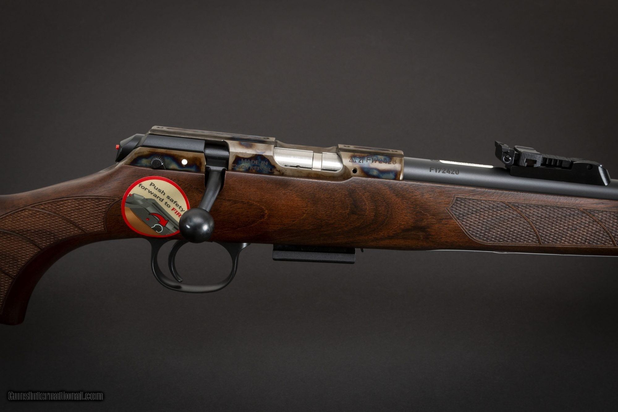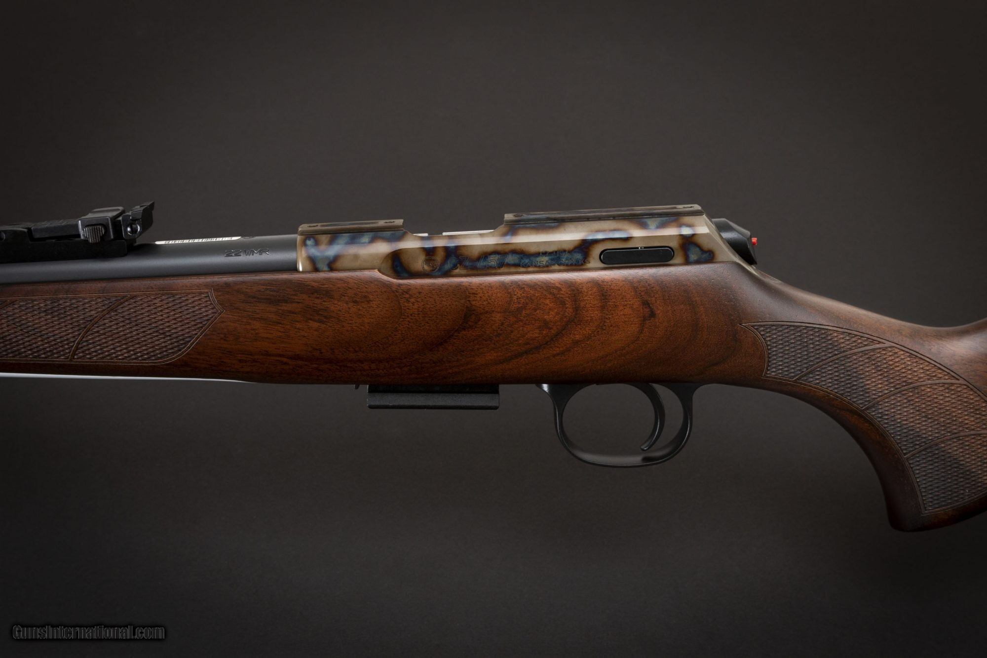 Description: We were especially picky when considering a bolt-action addition to our Turnbull Finished series. While we proudly outfit the line with quintessentially American brands, we’re pleased to report that our choice – the CZ 457 Lux – already has a solid reputation among discerning shooters here in the States. The 457’s quality, features, ergonomics and accuracy make this .22 exceptionally well-suited to American tastes. Action The 457’s receiver is color case hardened using our restoration-grade, bone charcoal method. Our signature process imparts a range of blues and blondes rarely seen on modern firearms, a spectrum simply not achievable through other means of case hardening. The receiver’s slotted design provides shorter bolt travel and a smaller footprint compared to its Model 455 predecessor. It’s been slab-sided as well to further reduce weight. The 457’s designers also changed the bolt throw from 90 to 60 degrees, reducing the risk of interfering with optics should you choose that option over the rifle’s factory iron sights. Like its predecessor, the 457 boasts a user-interchangeable barrel system. Those familiar with the 455 will also be happy to know that the 457 sports a trigger mechanism that is fully adjustable for weight, pre-travel and over-travel. And perhaps the most anticipated improvement is the 457’s American-style, push-to-fire safety. Wood The elegant lines of the CZ 457 Lux are enhanced by its premium oiled Turkish walnut, sanded and finished by master craftsmen. Typically referred to as “hogback” in style, American shooters will consider the stock to be more in the Monte Carlo tradition with raised comb and cheekpiece, promoting proper head positioning for iron sight usage. This is a well-appointed rimfire for all levels of shooting enthusiast, and we’re thrilled to have the exceptional 457 Lux from CZ-USA added to our line of Turnbull Finished favorites. Contact us for more information and additional photographs. SOLD Rifle Caliber: .22 WMR (.22 Magnum) Manufacturer: CZ Model: 457 Lux Serial Number: F172420 Barrel Length: 24.8 Condition: New Action: Bolt Stock: Turkish Walnut LOP: 13-3/4" LOP Finish: Turnbull Restoration Bone Charcoal Color Case Hardening Weight: 6.1 lbs. Sights: Adjustable rear, Integrated 11mm Dovetail front Item Location: NY |