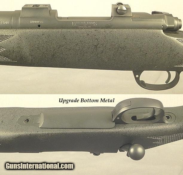 Description: #HV0015S, Dakota Arms Model 97 Varmint Heavy Barrel Stainless in 308 Winchester, 26" barrel with a AAC Blackout 51T muzzle brake, 23 1/2" barrel without the brake, Short 97 action, Standard Model 70 type 3 position wing safety, Leupold type scope bases, Upgrade straddle hinged floorplate with a center bow release, Satin black custom coating finish by Falcon Gun Finishing, McMillan synthetic stock that is pillar bedded, Sling eyes, 13 15/16" lop over a 1/2" pad, 10 lbs. 4 oz., The bore is as new. The barrel break-in at Dakota was done in April 2013 and shot with 168 grain Sierra Match King bullets. The 3 shot group from the factory is .532". All factory paperwork comes with the gun. SOLD |