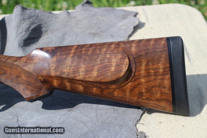 Description: 4 shot drop box with magnum action 24 " medium barrel with express sights and banded ramp front Beautiful fiddleback classic stock ,with point pattern checkering 99 % factory bluing& stock finish Like new condition ....No edge wear Cross bolted stock unregulated rear sight LOP 13 5/8" Weighs 10 lbs 6 oz Serial # RO714 $ 7895 + Shipping SOLD |