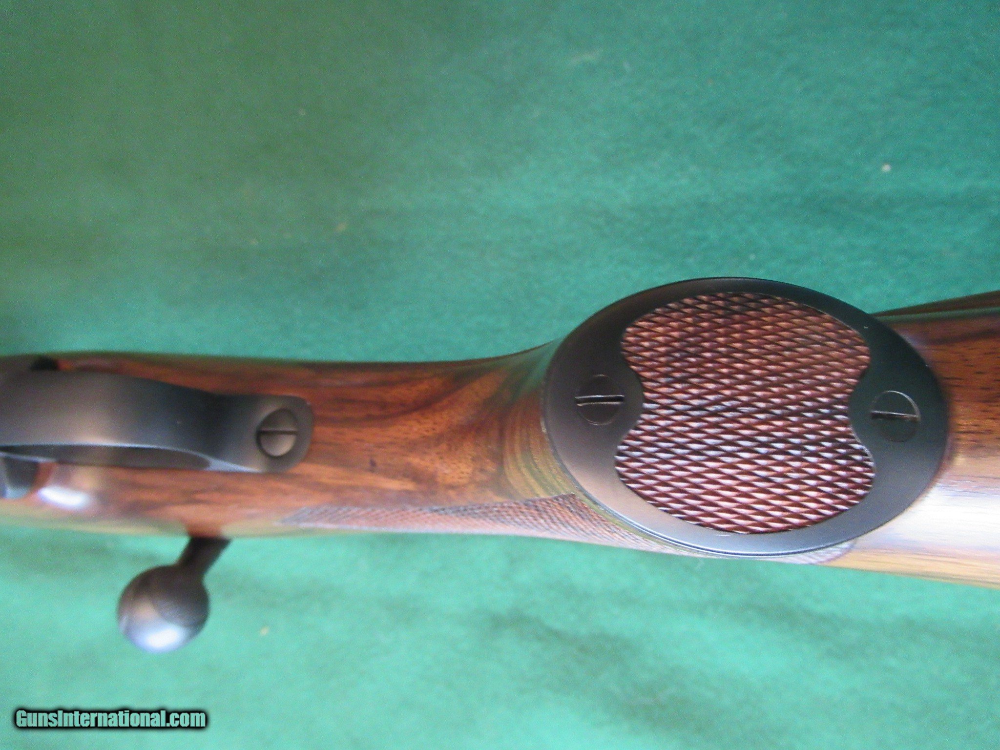 Description: A Daklota 76 in .416 Rigby. Custom ordered by a collector, it is new. unfired with no handling marks. This is a Don Allen vintage rifle. 24" barrel with quarter rib, one standing rear sight. hooded white bead front sight and a barrel band sling mount. It has a deep magazine for 4 down and a 3 panel checkered bolt knob. No scope bases have ever been mounted. All the metal is in a very dark Grey matte finish. This is all mounted oin a 3X piece of French Walnut with tons of marbling. Well checkered in a borderless point pattern. 13 5/8" LOP with a shadow line cheekpiece, open checkered grip cap and a great looking ebony or rosewood forend tip. Two crossbolts are Ebony filled. This is a stunning rifle. Great looks, great workmanship and a wonderful caliber. You will not find a better African rifle and this will make a centerpiece in your collection. Please email or call Raff at 760 497 7836 if you have any questions. Thank you for looking. SOLD Rifle Caliber: .416 Rigby Manufacturer: Dakota Arms Model: 76 African Serial Number: R-0101 Barrel Length: 24 Condition: Excellent Metal Condition: Excellent Wood Condition: NEW Bore Condition: New Butt Pad: Black Dakota Arms LOP: 13 5/8 Sights: Standing rear, White front Item Location: Arizona |