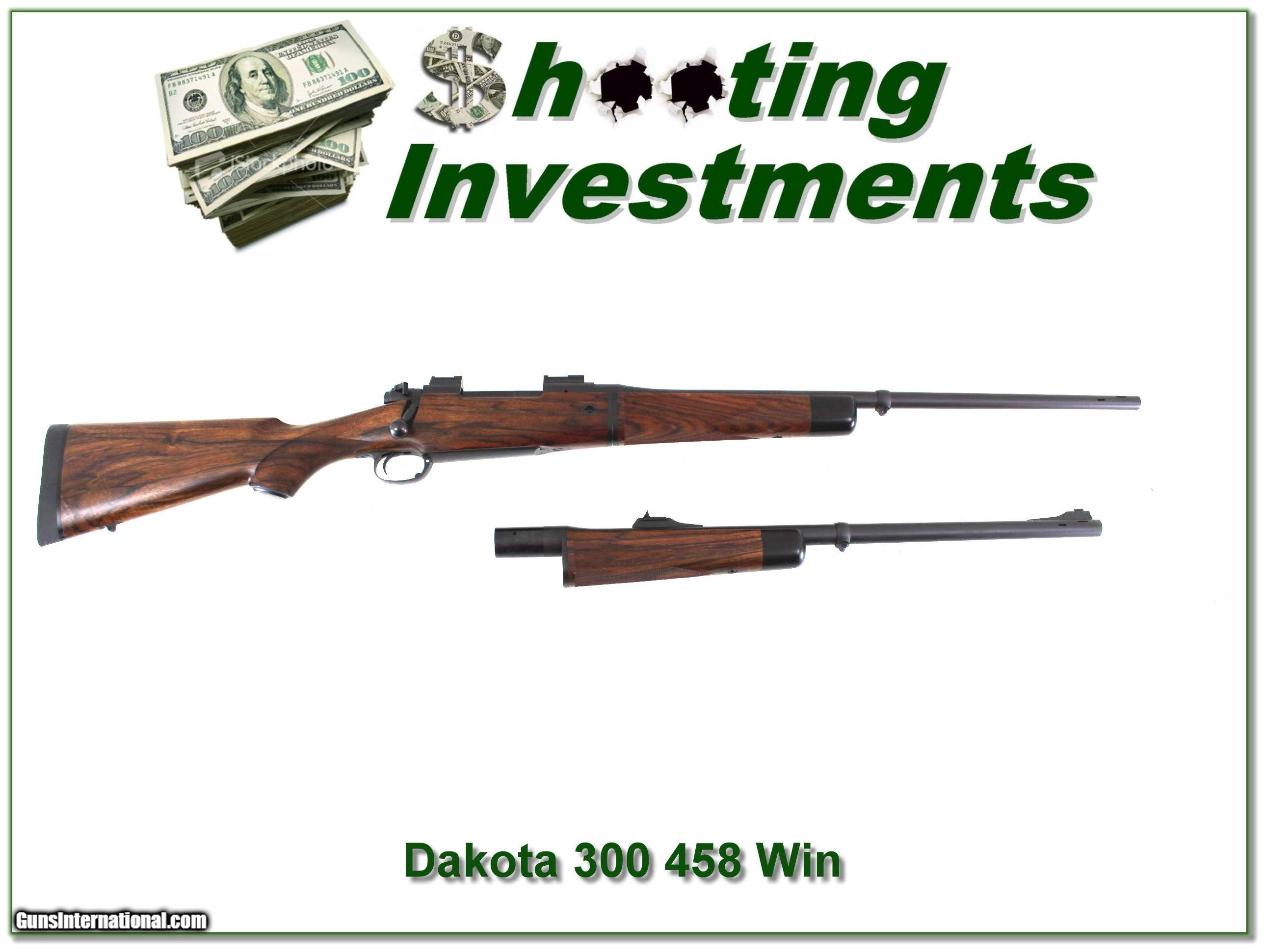 Description: Collectors and Dangerous game hunters, this is a do it set. It’s the Dakota Traveler or take down 2-barrel set. It has outstanding high grade walnut and include both 458 Winchester Magnum and 300 Winchester Magnum barrels. Both are 24in and ported. This is the African model with deeper magazine well. I don’t find any marks on the metal and only a few on the wood. You can take this set to Africa and hunting anything. Shipping and insurance is $129. Please email me with any questions or larger pictures. (Consign your quality firearms with Shooting Investments for only 12%! Let me know if you have any you would like to sell!) 23-0803 Payment: Payment is by Money Order, Cashier’s Check or Personal Check. I can now also accept Credit Cards (MasterCard, Visa, Discover & American Express) with a 3% convenience fee. Shipping: The shipping charge will be listed in each description. It is $49 for most firearms. Some heavy guns or those insured for over $2000 will be higher. Shipments to Alaska and Hawaii are higher because air shipment is required. Most firearms are shipped on Tuesday and Thursday and usually in 5 days of receipt of payment. We package all shipments carefully and insure them. Optics are shipped Priority Mail and most other non-firearm shipments are shipped First Class. Returns: Our return policy is simple. If for any reason you are not pleased with your purchase, you may return your item for a full refund of purchase price. Ammunition cannot be returned. It is important to us that you are happy. Guns cannot be fired or dissembled before returning them and they must be returned in the same condition as received. Notification of a return must occur within 3 days of receipt at your dealer. Shipping, convenience and dealer fees are not refundable and are the responsibility of the buyer. Lay-a-way: If needed, we offer a 60 day lay-a-way option on most firearms. It is 1/3 now, 1/3 in 30 days and 1/3 in 60 days. Lay-a-way firearm sales are final and cannot be returned. If a lay-a-way is not completed the first payment cannot be refunded. Consigning your firearms with Shooting Investments: We will help you get top dollar for your firearms. While most local guns shops charge 20% or more, our fee is only 12% with a minimum of $75. At your local gun shop it might take months to sell. Selling on-line provides instant access to thousands of interested buyers. You won’t find any other on-line dealer willing to sell your firearms for only 12% or listing every gun on 3 separate s. Selling through an House typically costs the seller 15% and the buyer an addition 15% (so 30%) and you have to wait several months to sell and longer to receive funds. If properly priced, we will sell your firearms within a few weeks. Send us an email or give us a call and we’ll explain how easy it is for you to get top dollar. Trading: Trading for us is really just buying your gun to re-sell. If you have a gun you want to trade, please email a picture and we will let you know what we can give for it. You will always get more if we sell it for you on consignment. SOLD |