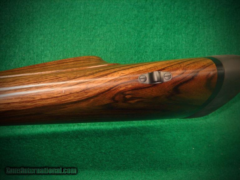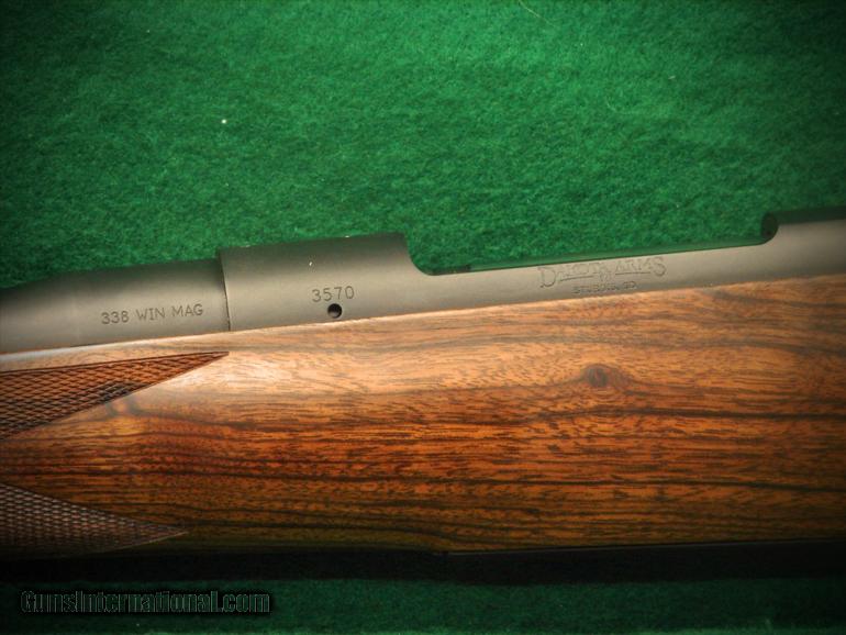 Description: Dakota 338 Win Mag 76 Safari Upgraded Exibition English Walnut, 3 panel checkered bolt, Islan s, ebony forend, cheekpiece, wrap around checkering. SOLD |